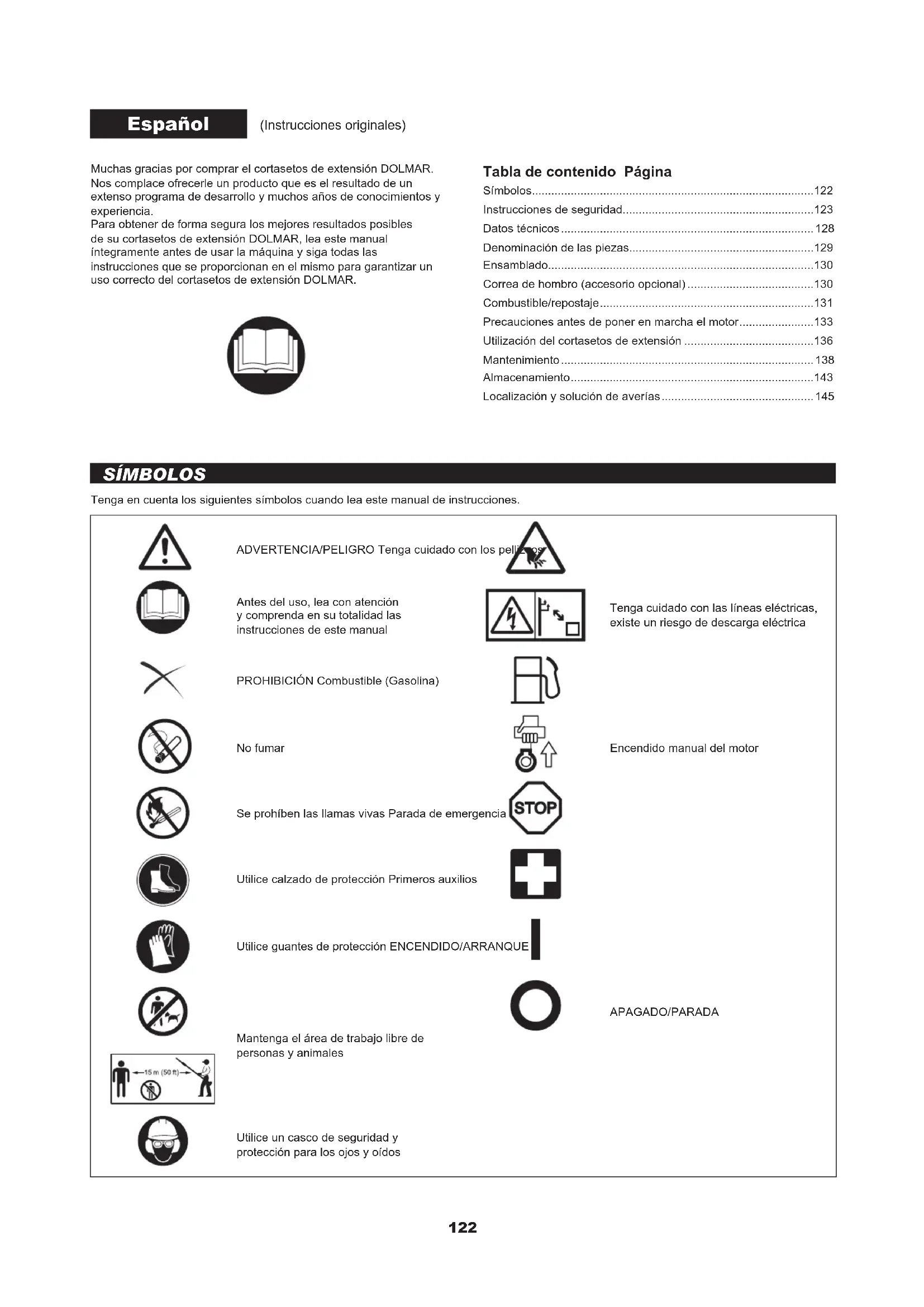 - Stekker losgeraakt. Bevestig stevig. Probleem met elektrisch systeem. Dien een verzoek in voor inspectie en onderhoud. Als de motor niet start ondanks dat deze opgewarmd is: Als bij het doorlopen van de controlepunten geen probleem wordt gevonden, knijpt u de gashendel ongeveer 1/3 in en start u de motor. PROBLEMEN OPLOSSEN122 Muchas gracias por comprar el cortasetos de extensión DOLMAR. Nos complace ofrecerle un producto que es el resultado de un extenso programa de desarrollo y muchos años de conocimientos y experiencia. Para obtener de forma segura los mejores resultados posibles de su cortasetos de extensión DOLMAR, lea este manual íntegramente antes de usar la máquina y siga todas las instrucciones que se proporcionan en el mismo para garantizar un uso correcto del cortasetos de extensión DOLMAR. Español (Instrucciones originales) Tabla de contenido Página Símbolos p. 122