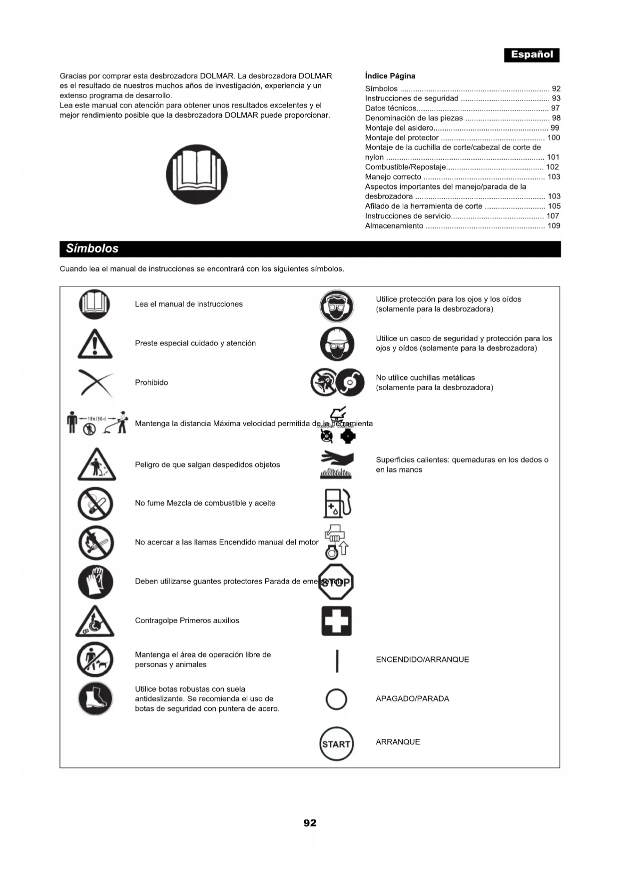 - Sustitución de la herramienta95 – El combustible solamente se debe transportar y almacenar en recipientes homologados. Asegúrese de que el combustible almacenado no esté al alcance de los niños. Método de trabajo – Utilice la desbrozadora y las herramientas únicamente cuando haya una buena iluminación y visibilidad. Durante el invierno, tenga cuidado con las zonas resbaladizas o mojadas, como zonas heladas o cubiertas por la nieve (riesgo de resbalar). Asegúrese siempre de que sus pies estén en una posición segura. – No corte nunca por encima de la altura de la cintura. – No se suba nunca a una escalera mientras utilice la desbrozadora. – No se suba a árboles mientras utilice la desbrozadora. – No trabaje nunca en superficies inestables. – Elimine la arena, piedras, clavos, etc. que se encuentren en el área de trabajo. Los objetos extraños pueden dañar la herramienta de corte y provocar peligrosos contragolpes. – Antes de empezar a cortar, asegúrese de que la herramienta de corte haya alcanzado la velocidad de trabajo máxima. – Si se atascan césped o ramas entre la herramienta de corte y la protección, detenga siempre el motor antes de la limpieza. De lo contrario, el contacto accidental con las cuchillas que están girando puede provocar lesiones graves. – Descanse para evitar la pérdida de control causada por la fatiga. Recomendamos descansar de 10 a 20 minutos cada hora. Contragolpe (empuje de la cuchilla) – Cuando utilice la desbrozadora pueden producirse contragolpes incontrolados. – Los contragolpes se suelen producir cuando intenta cortar con la sección entre las posiciones de las 12 y las 2 en punto de la cuchilla. – Nunca aplique la sección entre las posiciones de las 12 y las 2 de la cuchilla de la desbrozadora. – Nunca aplique esta sección de la cuchilla de la desbrozadora a objetos sólidos, como arbustos o árboles, etc. que tengan un diámetro superior a 3 cm. En caso contrario, la desbrozadora se desviará con gran fuerza, lo que es extremadamente peligroso y puede provocar lesiones. Prevención de contragolpes Para evitar contragolpes, recuerde lo siguiente: – Utilizar la sección entre las posiciones de las 12 y las 2 en punto de la cuchilla es extremadamente peligroso, especialmente cuando utilice herramientas de corte metálicas. – Las operaciones de corte con la sección entre las posiciones de las 11 y las 12 en punto y entre las posiciones de las 2 y las 5 en punto sólo deben realizarlas operadores con experiencia y formación y únicamente bajo su propio riesgo. La sección de corte óptima para lograr un corte sencillo sin casi contragolpes se encuentra entre las secciones de las 8 y las 11 en punto de la cuchilla. Herramientas de corte – Utilice una herramienta de corte adecuada para el trabajo que realice. Los cabezales de corte de nylon (cabezales de desbrozadora) son adecuados para cortar césped. Las cuchillas metálicas son adecuadas para cortar maleza, hierba alta, arbustos, matorrales, sotobosque y vegetación similar. Nunca utilice otras cuchillas, incluyendo cadenas metálicas pivotantes de varias piezas ni cuchillas trilladoras. De lo contrario, se pueden producir lesiones graves. – Cuando utilice cuchillas metálicas, evite el “contragolpe” y esté siempre preparado para un contragolpe accidental. Consulte las secciones “Contragolpe” y “Prevención de contragolpes”. Instrucciones de mantenimiento – Haga que su equipo sea sometido a tareas de mantenimiento en nuestro centro de servicio autorizado, utilizando siempre y de forma exclusiva recambios originales. Una reparación incorrecta y un mantenimiento deficiente pueden acortar la vida útil del equipo y aumentar el riesgo de accidentes. – Compruebe siempre el estado de la desbrozadora, especialmente los dispositivos de protección y la correa para el hombro, antes de empezar a trabajar. También debe prestarse especial atención a las cuchillas de corte, que deben estar afiladas correctamente. – Apague el motor y quite el conector de la bujía cuando sustituya o afile las herramientas de corte y también cuando limpie la desbrozadora o la herramienta de corte. Precaución: Contragolpe Diagrama Diagrama96 Nunca enderece ni suelde las herramientas de corte estropeadas. – Utilice la desbrozadora de forma que haga el mínimo ruido y contaminación posibles. En concreto, compruebe si el carburador se ha ajustado correctamente. – Limpie la desbrozadora periódicamente y compruebe que todos los tornillos y tuercas estén bien apretados. – Nunca realice trabajos de mantenimiento o almacene la desbrozadora en la proximidad de llamas. – Guarde siempre la desbrozadora en habitaciones cerradas con llave y con el depósito de combustible vacío. – Durante la limpieza, el mantenimiento y el almacenamiento del equipo, acople siempre la cubierta a la cuchilla de corte. Respete las instrucciones aplicables de prevención de accidentes emitidas por las compañías de seguros y las asociaciones comerciales relevantes. No realice ninguna modificación en la desbrozadora, ya que esto pondría en peligro su seguridad. Los trabajos de mantenimiento o reparación que puede realizar el usuario se limitan a las actividades descritas en este manual de instrucciones. Todos los demás trabajos los realiza un agente de servicio autorizado. Utilice únicamente accesorios y piezas de repuesto genuinos suministrados por DOLMAR. El uso de accesorios y herramientas no aprobados implicará un aumento del riesgo de accidentes. DOLMAR no acepta ninguna responsabilidad por los accidentes o los daños causados por el uso de herramientas de corte no aprobadas, por la reparación de las herramientas de corte o por accesorios. Primeros auxilios En caso de accidente, asegúrese de que cerca del lugar en el que se realicen las operaciones de corte esté disponible un botiquín de primeros auxilios. Reponga inmediatamente cualquier artículo que tome del boti
