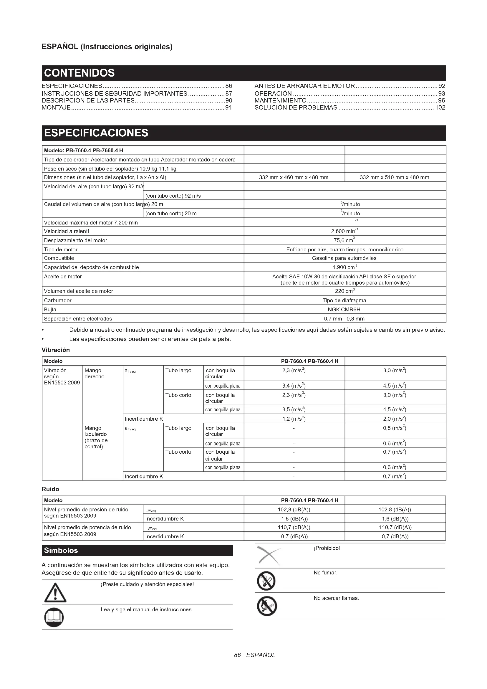 ESPECIFICACIONES Modelo: PB-7660.4 PB-7660.4 H Tipo de acelerador Acelerador montado en tubo Acelerador montado en cadera Peso en seco (sin el tubo del soplador) 10,9 kg 11,1 kg Dimensiones (sin el tubo del soplador, La x An x Al) 332 mm x 460 mm x 480 mm 332 mm x 510 mm x 480 mm Velocidad del aire (con tubo largo) 92 m/s (con tubo corto) 92 m/s Caudal del volumen de aire (con tubo largo) 20 m