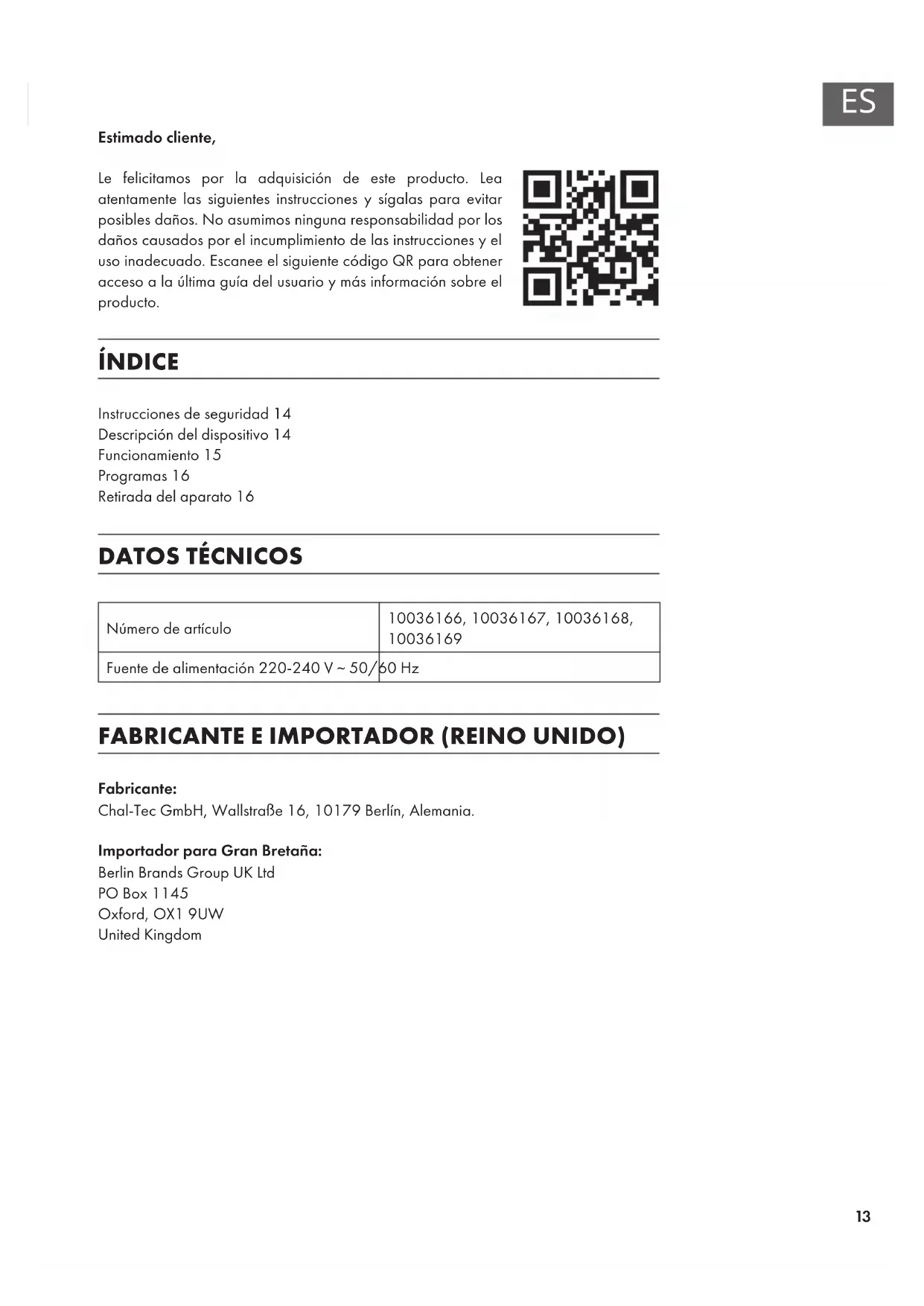 Estimado cliente, Le felicitamos por la adquisición de este producto. Lea atentamente las siguientes instrucciones y sígalas para evitar posibles daños. No asumimos ninguna responsabilidad por los daños causados por el incumplimiento de las instrucciones y el uso inadecuado. Escanee el siguiente código QR para obtener acceso a la última guía del usuario y más información sobre el producto. ÍNDICE Instrucciones de seguridad14 Descripción del dispositivo14 Funcionamiento15 Programas16 Retirada del aparato16