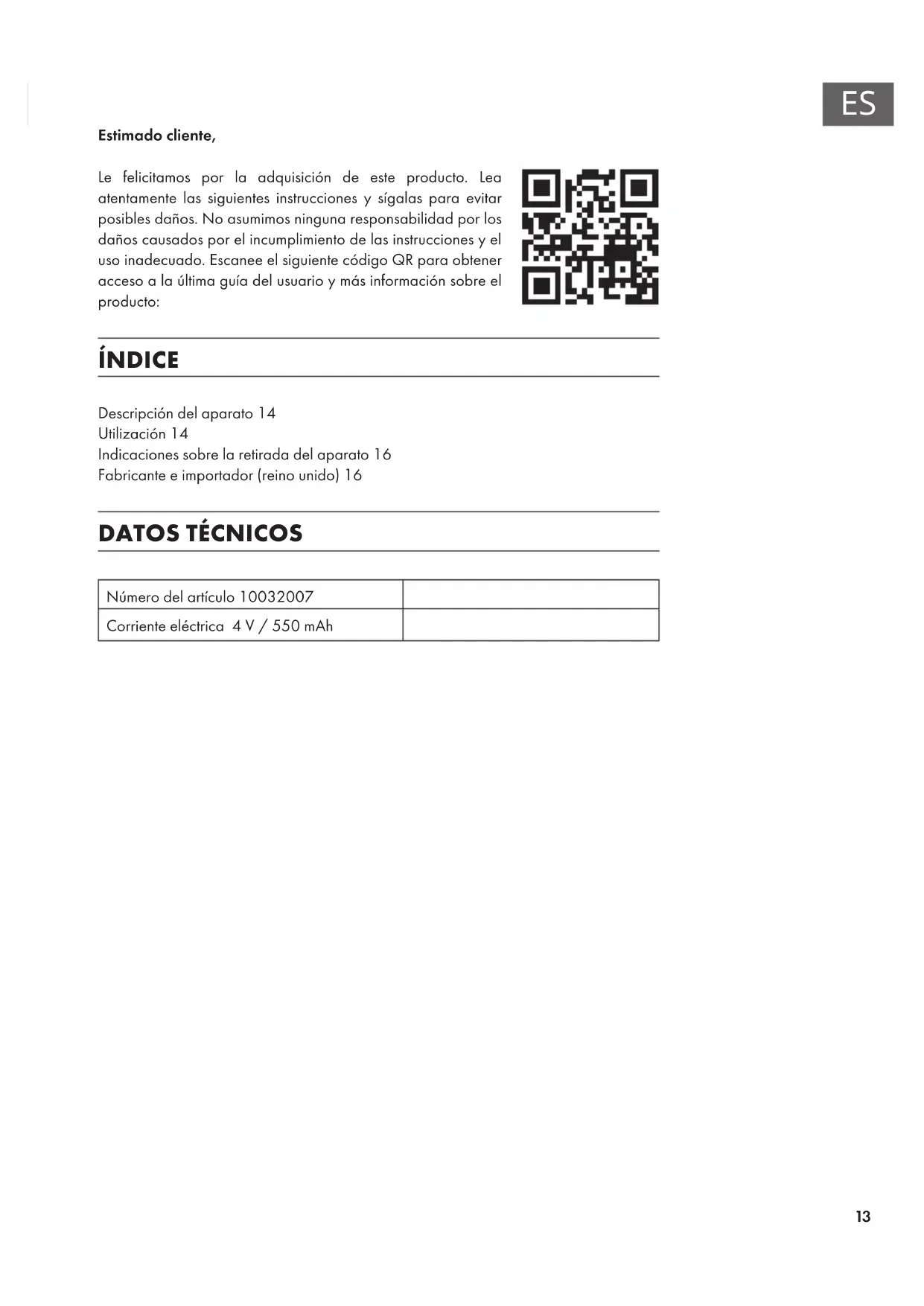 Estimado cliente, Le felicitamos por la adquisición de este producto. Lea atentamente las siguientes instrucciones y sígalas para evitar posibles daños. No asumimos ninguna responsabilidad por los daños causados por el incumplimiento de las instrucciones y el uso inadecuado. Escanee el siguiente código QR para obtener acceso a la última guía del usuario y más información sobre el producto: ÍNDICE Descripción del aparato14 Utilización14 Indicaciones sobre la retirada del aparato16 Fabricante e importador (reino unido)16