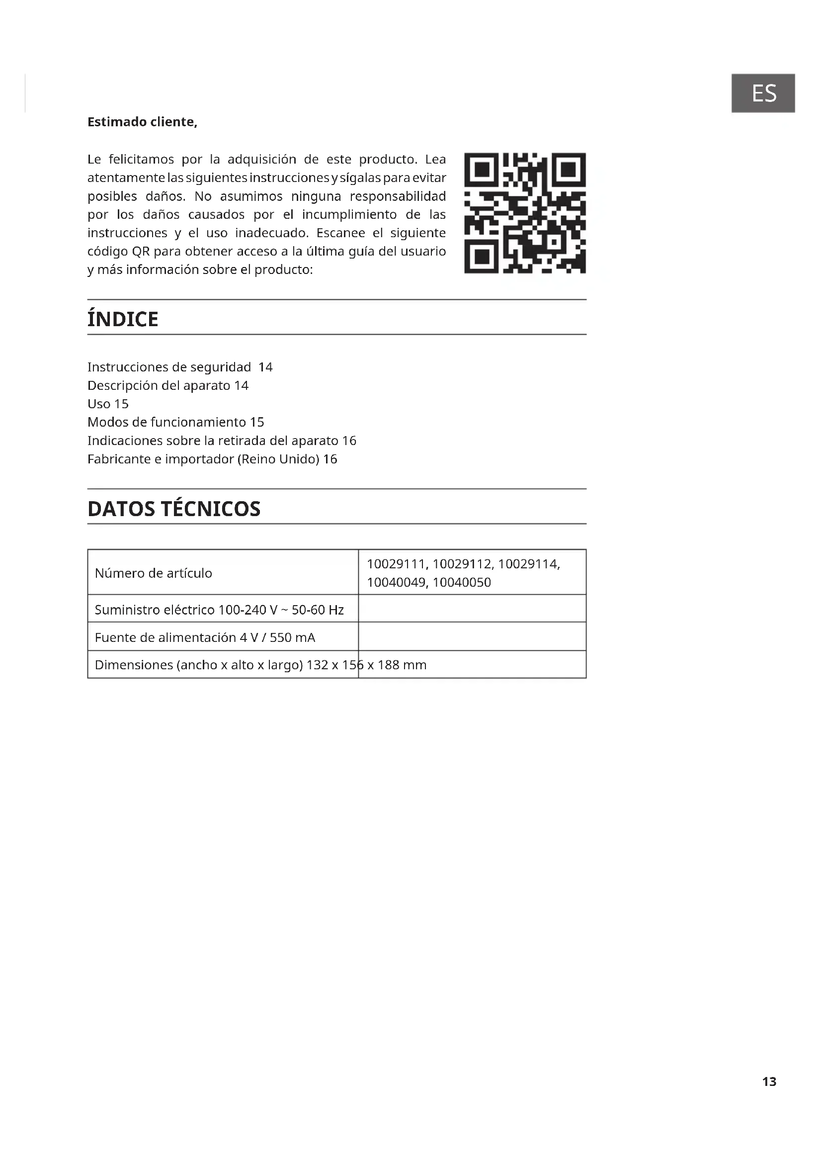 Estimado cliente, Le felicitamos por la adquisición de este producto. Lea atentamente las siguientes instrucciones y sígalas para evitar posibles daños. No asumimos ninguna responsabilidad por los daños causados por el incumplimiento de las instrucciones y el uso inadecuado. Escanee el siguiente código QR para obtener acceso a la última guía del usuario y más información sobre el producto: ÍNDICE Instrucciones de seguridad 14 Descripción del aparato 14 Uso 15 Modos de funcionamiento 15 Indicaciones sobre la retirada del aparato 16 Fabricante e importador (Reino Unido) 16