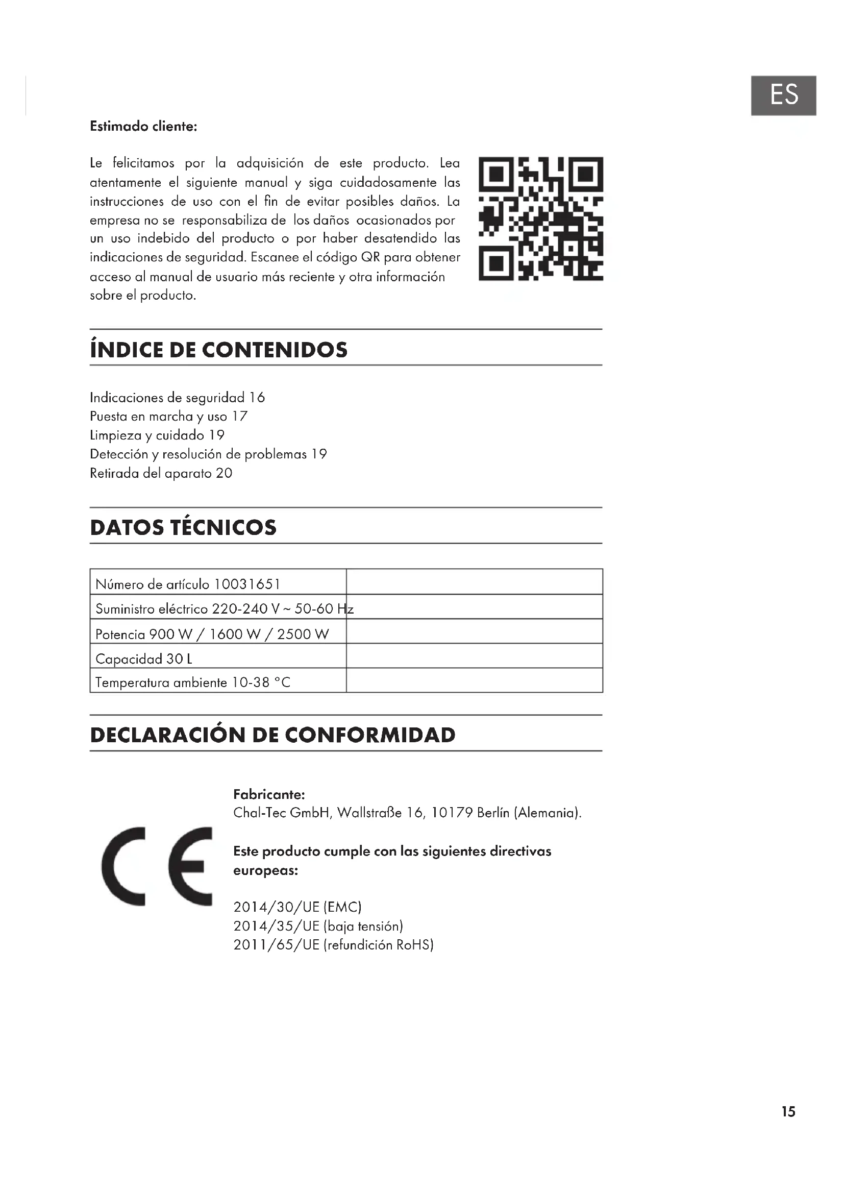 Fabricante: Chal-Tec GmbH, Wallstraße 16, 10179 Berlín (Alemania). Este producto cumple con las siguientes directivas europeas: 2014/30/UE (EMC) 2014/35/UE (baja tensión) 2011/65/UE (refundición RoHS)16