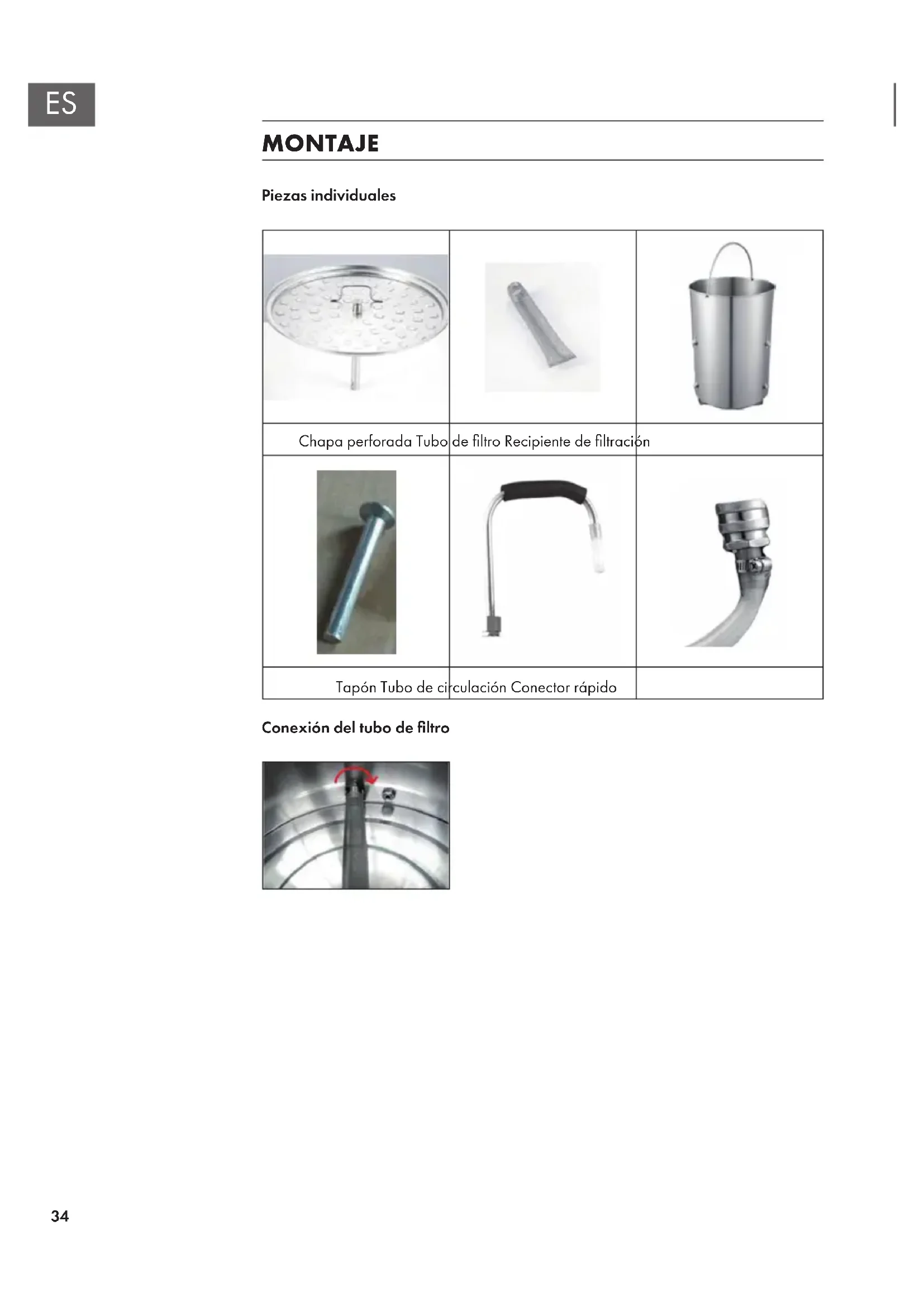 MONTAJE Piezas individuales Chapa perforada Tubo de ltro Recipiente de ltración Tapón Tubo de circulación Conector rápido Conexión del tubo de ltro35