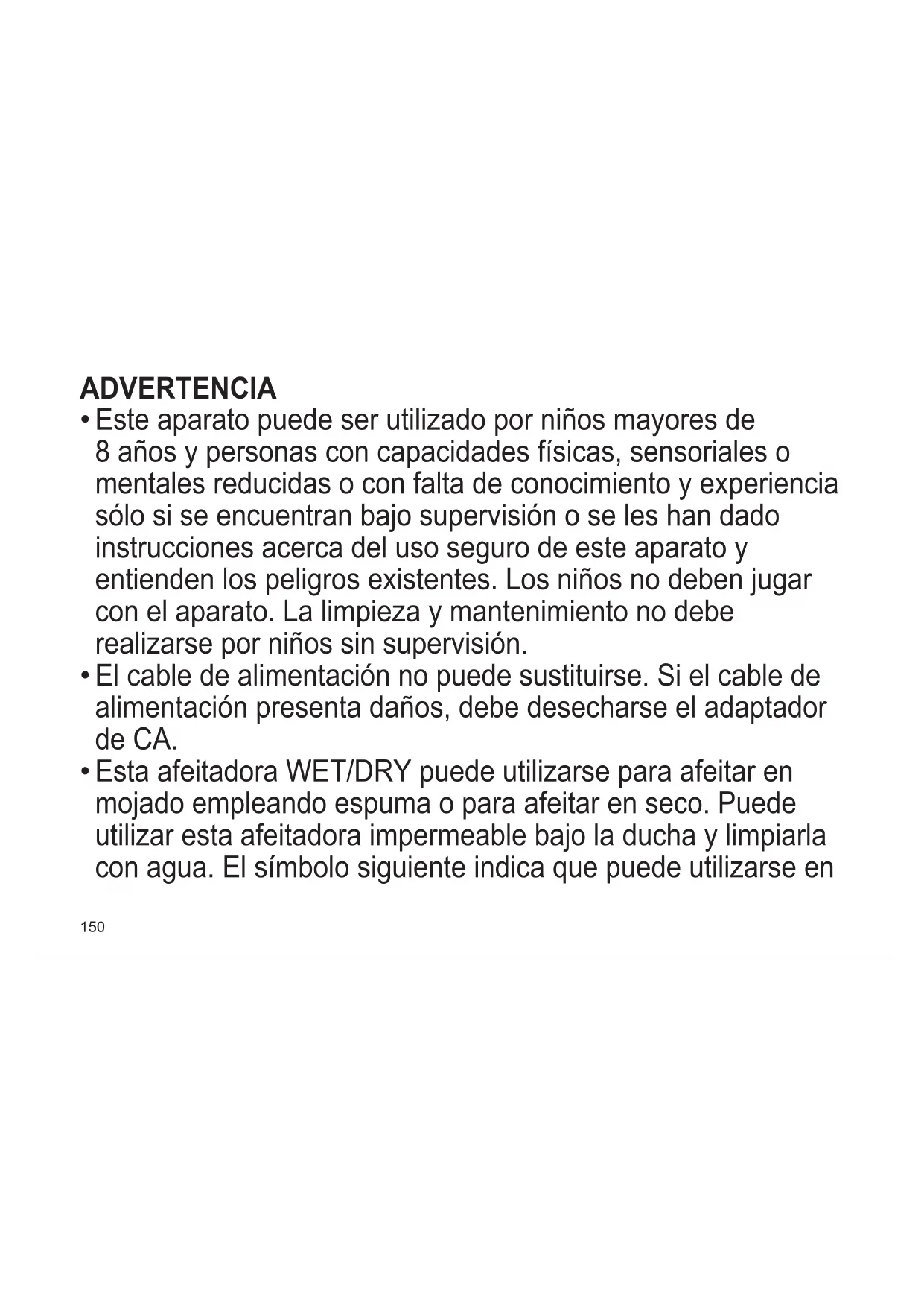 Esta afeitadora WET/DRY puede utilizarse para afeitar en mojado empleando espuma o para afeitar en seco. Puede utilizar esta afeitadora impermeable bajo la ducha y limpiarla con agua. El símbolo siguiente indica que puede utilizarse en151 TR RO H SK CZ PL FIN S N P DK E NL I F D GB una bañera o ducha.