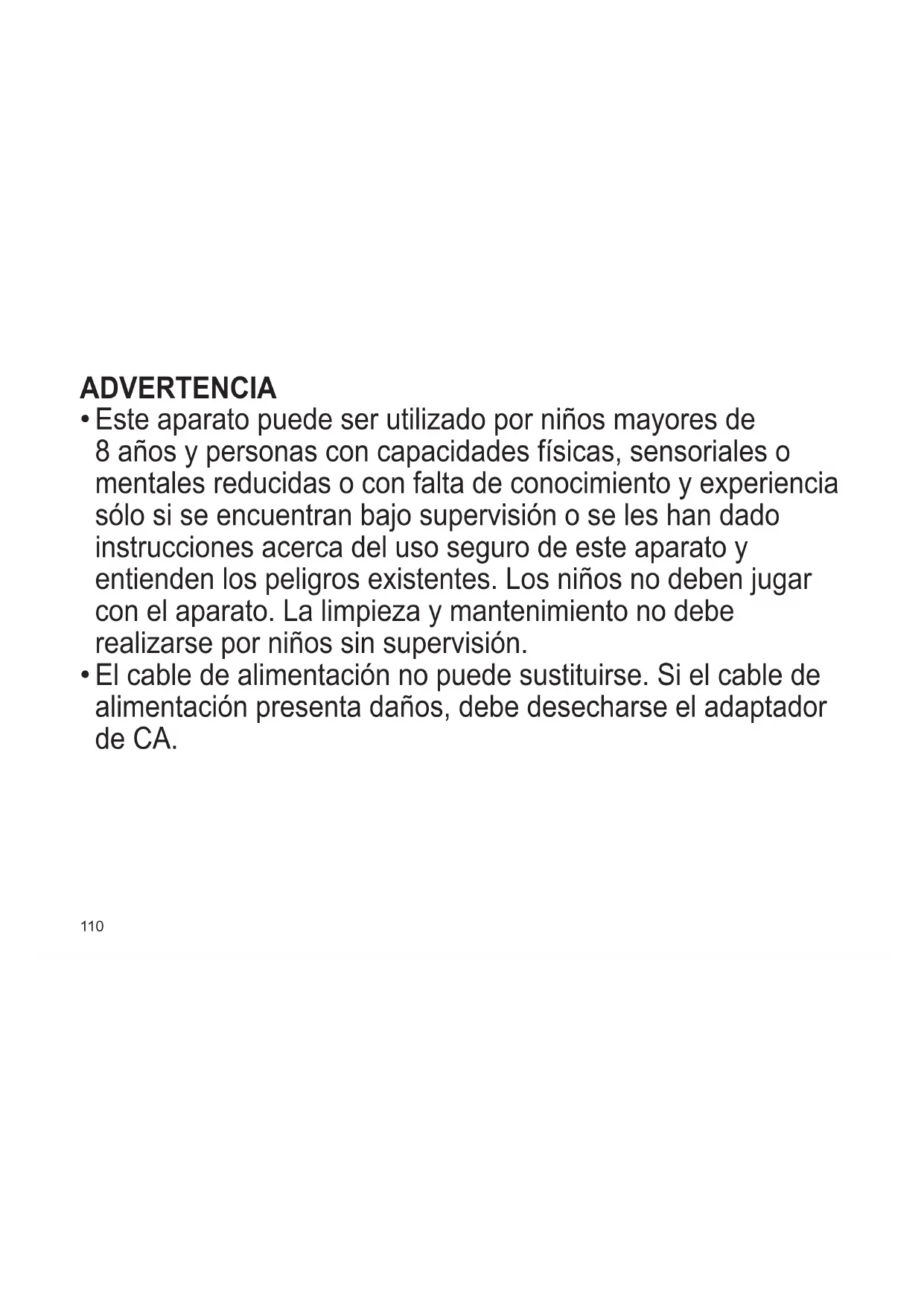 De lo contrario, podría sufrir descargas eléctricas o lesiones. No sumerja el adaptador de CA en agua ni lo lave con agua No coloque el adaptador cerca de un lavabo o una bañera llenos de agua No utilice el aparato si el adaptador de CA está estropeado o si la clavija del cable de alimentación queda oja al conectarla en una toma de corriente No dañe el cable ni la clavija del cable de alimentación