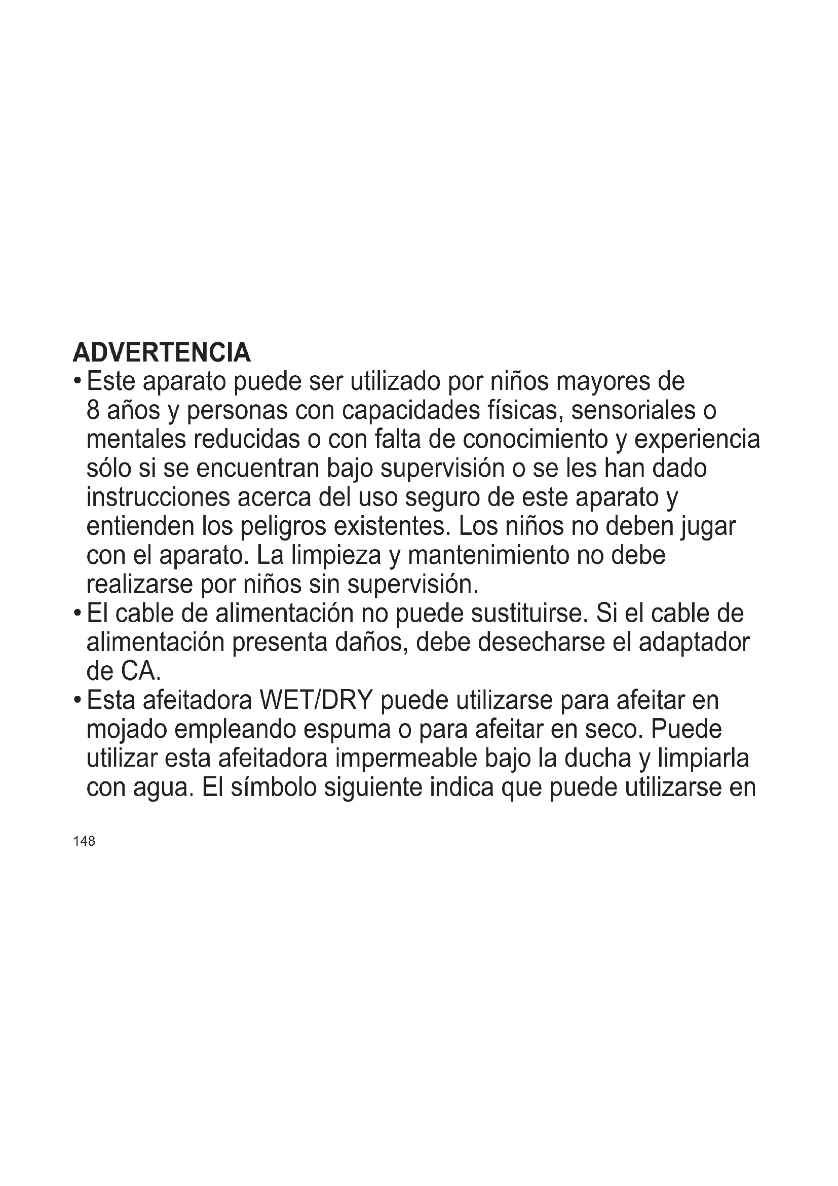Este aparato puede ser utilizado por niños mayores de 8 años y personas con capacidades físicas, sensoriales o mentales reducidas o con falta de conocimiento y experiencia sólo si se encuentran bajo supervisión o se les han dado instrucciones acerca del uso seguro de este aparato y entienden los peligros existentes. Los niños no deben jugar con el aparato. La limpieza y mantenimiento no debe realizarse por niños sin supervisión.