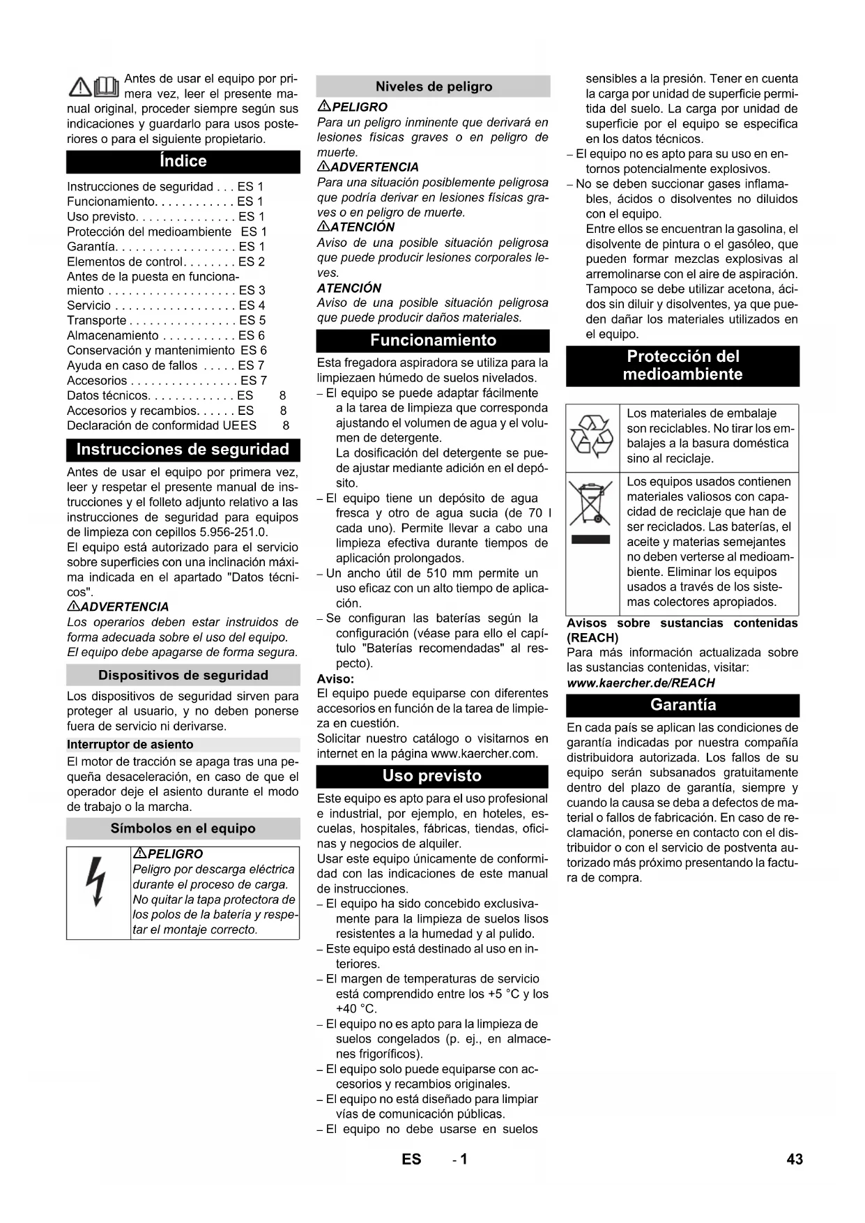 Chairman of the Board of Management Director Regulatory Affairs & Certification 42 NL- 1 Antes de usar el equipo por pri- mera vez, leer el presente ma- nual original, proceder siempre según sus indicaciones y guardarlo para usos poste- riores o para el siguiente propietario. Antes de usar el equipo por primera vez, leer y respetar el presente manual de ins- trucciones y el folleto adjunto relativo a las instrucciones de seguridad para equipos de limpieza con cepillos 5.956-251.0. El equipo está autorizado para el servicio sobre superficies con una inclinación máxi- ma indicada en el apartado "Datos técni- cos". 몇 ADVERTENCIA Los operarios deben estar instruidos de forma adecuada sobre el uso del equipo. El equipo debe apagarse de forma segura. Los dispositivos de seguridad sirven para proteger al usuario, y no deben ponerse fuera de servicio ni derivarse. El motor de tracción se apaga tras una pe- queña desaceleración, en caso de que el operador deje el asiento durante el modo de trabajo o la marcha. PELIGRO Para un peligro inminente que derivará en lesiones físicas graves o en peligro de muerte. 몇 ADVERTENCIA Para una situación posiblemente peligrosa que podría derivar en lesiones físicas gra- ves o en peligro de muerte. 몇 ATENCIÓN Aviso de una posible situación peligrosa que puede producir lesiones corporales le- ves. ATENCIÓN Aviso de una posible situación peligrosa que puede producir daños materiales. Esta fregadora aspiradora se utiliza para la limpiezaen húmedo de suelos nivelados. – El equipo se puede adaptar fácilmente a la tarea de limpieza que corresponda ajustando el volumen de agua y el volu- men de detergente. La dosificación del detergente se pue- de ajustar mediante adición en el depó- sito. – El equipo tiene un depósito de agua fresca y otro de agua sucia (de 70 l cada uno). Permite llevar a cabo una limpieza efectiva durante tiempos de aplicación prolongados. – Un ancho útil de 510 mm permite un uso eficaz con un alto tiempo de aplica- ción. – Se configuran las baterías según la configuración (véase para ello el capí- tulo "Baterías recomendadas" al res- pecto). Aviso: El equipo puede equiparse con diferentes accesorios en función de la tarea de limpie- za en cuestión. Solicitar nuestro catálogo o visitarnos en internet en la página www.kaercher.com. Este equipo es apto para el uso profesional e industrial, por ejemplo, en hoteles, es- cuelas, hospitales, fábricas, tiendas, ofici- nas y negocios de alquiler. Usar este equipo únicamente de conformi- dad con las indicaciones de este manual de instrucciones. – El equipo ha sido concebido exclusiva- mente para la limpieza de suelos lisos resistentes a la humedad y al pulido. – Este equipo está destinado al uso en in- teriores. – El margen de temperaturas de servicio está comprendido entre los +5 °C y los +40 °C. – El equipo no es apto para la limpieza de suelos congelados (p. ej., en almace- nes frigoríficos). – El equipo solo puede equiparse con ac- cesorios y recambios originales. – El equipo no está diseñado para limpiar vías de comunicación públicas. – El equipo no debe usarse en suelos sensibles a la presión. Tener en cuenta la carga por unidad de superficie permi- tida del suelo. La carga por unidad de superficie por el equipo se especifica en los datos técnicos. – El equipo no es apto para su uso en en- tornos potencialmente explosivos. – No se deben succionar gases inflama- bles, ácidos o disolventes no diluidos con el equipo. Entre ellos se encuentran la gasolina, el disolvente de pintura o el gasóleo, que pueden formar mezclas explosivas al arremolinarse con el aire de aspiración. Tampoco se debe utilizar acetona, áci- dos sin diluir y disolventes, ya que pue- den dañar los materiales utilizados en el equipo. Avisos sobre sustancias contenidas (REACH) Para más información actualizada sobre las sustancias contenidas, visitar: www.kaercher.de/REACH En cada país se aplican las condiciones de garantía indicadas por nuestra compañía distribuidora autorizada. Los fallos de su equipo serán subsanados gratuitamente dentro del plazo de garantía, siempre y cuando la causa se deba a defectos de ma- terial o fallos de fabricación. En caso de re- clamación, ponerse en contacto con el dis- tribuidor o con el servicio de postventa au- torizado más próximo presentando la factu- ra de compra. Índice Instrucciones de seguridad . . . ES 1 Funcionamiento. . . . . . . . . . . . ES 1 Uso previsto. . . . . . . . . . . . . . . ES 1 Protección del medioambiente ES 1 Garantía. . . . . . . . . . . . . . . . . . ES 1 Elementos de control. . . . . . . . ES 2 Antes de la puesta en funciona- miento . . . . . . . . . . . . . . . . . . . ES 3 Servicio . . . . . . . . . . . . . . . . . . ES 4 Transporte . . . . . . . . . . . . . . . . ES 5 Almacenamiento . . . . . . . . . . . ES 6 Conservación y mantenimiento ES 6 Ayuda en caso de fallos . . . . . ES 7 Accesorios . . . . . . . . . . . . . . . . ES 7 Datos técnicos. . . . . . . . . . . . . ES 8 Accesorios y recambios. . . . . . ES 8 Declaración de conformidad UEES 8 Instrucciones de seguridad Dispositivos de seguridad Interruptor de asiento Símbolos en el equipo PELIGRO Peligro por descarga eléctrica durante el proceso de carga. No quitar la tapa protectora de los polos de la batería y respe- tar el montaje correcto. Niveles de peligro Funcionamiento Uso previsto Protección del medioambiente Los materiales de embalaje son reciclables. No tirar los em- balajes a la basura doméstica sino al reciclaje. Los equipos usados contienen materiales valiosos con capa- cidad de reciclaje que han de ser reciclados. Las baterías, el aceite y materias semejantes no deben verterse al medioam- biente. Eliminar los equipos usados a través de los siste- mas colectores apropiados. Garantía 43ES- 2 1Asiento 2 Tapa del depósito de agua sucia 3 Dispositivo de dosificación para agua sucia 4 Volante 5 Interru