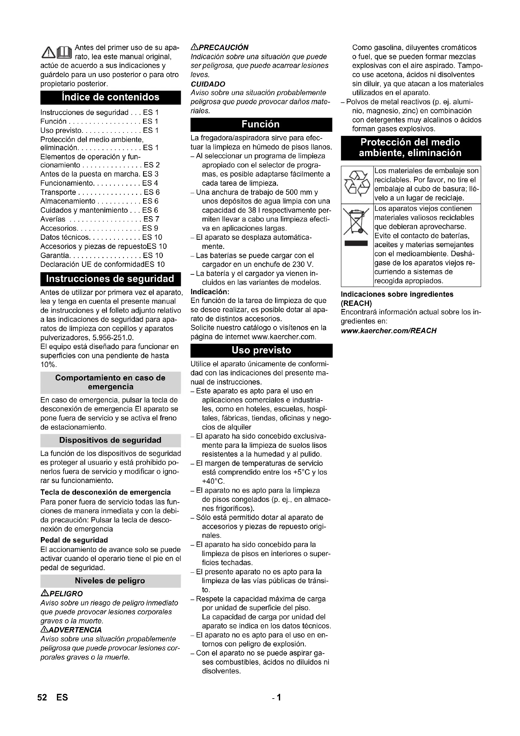 Chairman of the Board of Management Director Regulatory Affairs & Certification 51NL- 1 Antes del primer uso de su apa- rato, lea este manual original, actúe de acuerdo a sus indicaciones y guárdelo para un uso posterior o para otro propietario posterior. Antes de utilizar por primera vez el aparato, lea y tenga en cuenta el presente manual de instrucciones y el folleto adjunto relativo a las indicaciones de seguridad para apa- ratos de limpieza con cepillos y aparatos pulverizadores, 5.956-251.0. El equipo está diseñado para funcionar en superficies con una pendiente de hasta 10%. En caso de emergencia, pulsar la tecla de desconexión de emergencia El aparato se pone fuera de servicio y se activa el freno de estacionamiento. La función de los dispositivos de seguridad es proteger al usuario y está prohibido po- nerlos fuera de servicio y modificar o igno- rar su funcionamiento. Para poner fuera de servicio todas las fun- ciones de manera inmediata y con la debi- da precaución: Pulsar la tecla de desco- nexión de emergencia El accionamiento de avance solo se puede activar cuando el operario tiene el pie en el pedal de seguridad. PELIGRO Aviso sobre un riesgo de peligro inmediato que puede provocar lesiones corporales graves o la muerte. 몇 ADVERTENCIA Aviso sobre una situación propablemente peligrosa que puede provocar lesiones cor- porales graves o la muerte. 몇 PRECAUCIÓN Indicación sobre una situación que puede ser peligrosa, que puede acarrear lesiones leves. CUIDADO Aviso sobre una situación probablemente peligrosa que puede provocar daños mate- riales. La fregadora/aspiradora sirve para efec- tuar la limpieza en húmedo de pisos llanos. – Al seleccionar un programa de limpieza apropiado con el selector de progra- mas, es posible adaptarse fácilmente a cada tarea de limpieza. – Una anchura de trabajo de 500 mm y unos depósitos de agua limpia con una capacidad de 38 l respectivamente per- miten llevar a cabo una limpieza efecti- va en aplicaciones largas. – El aparato se desplaza automática- mente. – Las baterías se puede cargar con el cargador en un enchufe de 230 V. – La batería y el cargador ya vienen in- cluidos en las variantes de modelos. Indicación: En función de la tarea de limpieza de que se desee realizar, es posible dotar al apa- rato de distintos accesorios. Solicite nuestro catálogo o visítenos en la página de internet www.kaercher.com. Utilice el aparato únicamente de conformi- dad con las indicaciones del presente ma- nual de instrucciones. – Este aparato es apto para el uso en aplicaciones comerciales e industria- les, como en hoteles, escuelas, hospi- tales, fábricas, tiendas, oficinas y nego- cios de alquiler – El aparato ha sido concebido exclusiva- mente para la limpieza de suelos lisos resistentes a la humedad y al pulido. – El margen de temperaturas de servicio está comprendido entre los +5°C y los +40°C. – El aparato no es apto para la limpieza de pisos congelados (p. ej., en almace- nes frigoríficos). – Sólo está permitido dotar al aparato de accesorios y piezas de repuesto origi- nales. – El aparato ha sido concebido para la limpieza de pisos en interiores o super- ficies techadas. – El presente aparato no es apto para la limpieza de las vías públicas de tránsi- to. – Respete la capacidad máxima de carga por unidad de superficie del piso. La capacidad de carga por unidad del aparato se indica en los datos técnicos. – El aparato no es apto para el uso en en- tornos con peligro de explosión. – Con el aparato no se puede aspirar ga- ses combustibles, ácidos no diluidos ni disolventes. Como gasolina, diluyentes cromáticos o fuel, que se pueden formar mezclas explosivas con el aire aspirado. Tampo- co use acetona, ácidos ni disolventes sin diluir, ya que atacan a los materiales utilizados en el aparato. – Polvos de metal reactivos (p. ej. alumi- nio, magnesio, zinc) en combinación con detergentes muy alcalinos o ácidos forman gases explosivos. Indicaciones sobre ingredientes (REACH) Encontrará información actual sobre los in- gredientes en: www.kaercher.com/REACH Índice de contenidos Instrucciones de seguridad . . . ES 1 Función . . . . . . . . . . . . . . . . . . ES 1 Uso previsto. . . . . . . . . . . . . . . ES 1 Protección del medio ambiente, eliminación. . . . . . . . . . . . . . . . ES 1 Elementos de operación y fun- cionamiento . . . . . . . . . . . . . . . ES 2 Antes de la puesta en marcha. ES 3 Funcionamiento. . . . . . . . . . . . ES 4 Transporte . . . . . . . . . . . . . . . . ES 6 Almacenamiento . . . . . . . . . . . ES 6 Cuidados y mantenimiento . . . ES 6 Averías . . . . . . . . . . . . . . . . . . ES 7 Accesorios. . . . . . . . . . . . . . . . ES 9 Datos técnicos. . . . . . . . . . . . . ES 10 Accesorios y piezas de repuestoES 10 Garantía. . . . . . . . . . . . . . . . . . ES 10 Declaración UE de conformidadES 10 Instrucciones de seguridad Comportamiento en caso de emergencia Dispositivos de seguridad Tecla de desconexión de emergencia Pedal de seguridad Niveles de peligro Función Uso previsto Protección del medio ambiente, eliminación Los materiales de embalaje son reciclables. Por favor, no tire el embalaje al cubo de basura; llé- velo a un lugar de reciclaje. Los aparatos viejos contienen materiales valiosos reciclables que debieran aprovecharse. Evite el contacto de baterías, aceites y materias semejantes con el medioambiente. Deshá- gase de los aparatos viejos re- curriendo a sistemas de recogida apropiados. 52 ES- 2 1 Toma de manguera, sistema automáti- co de llenado 2 Depósito de agua limpia 3 Indicador de estado de carga (sólo para variante Bp Pack) 4 depósito de agua sucia 5 Flotador 6 Manguera de salida de agua sucia 7 enchufe del aparato 8 Enchufe de batería 9 Batería 10 Clavija de conexión a la red del carga- dor (sólo modelo Bp Pack) 11 Barra de aspiración 12 Válvula de agua limpia 13 Tamiz agua limpia 14 Tapa depósito de agua limpia