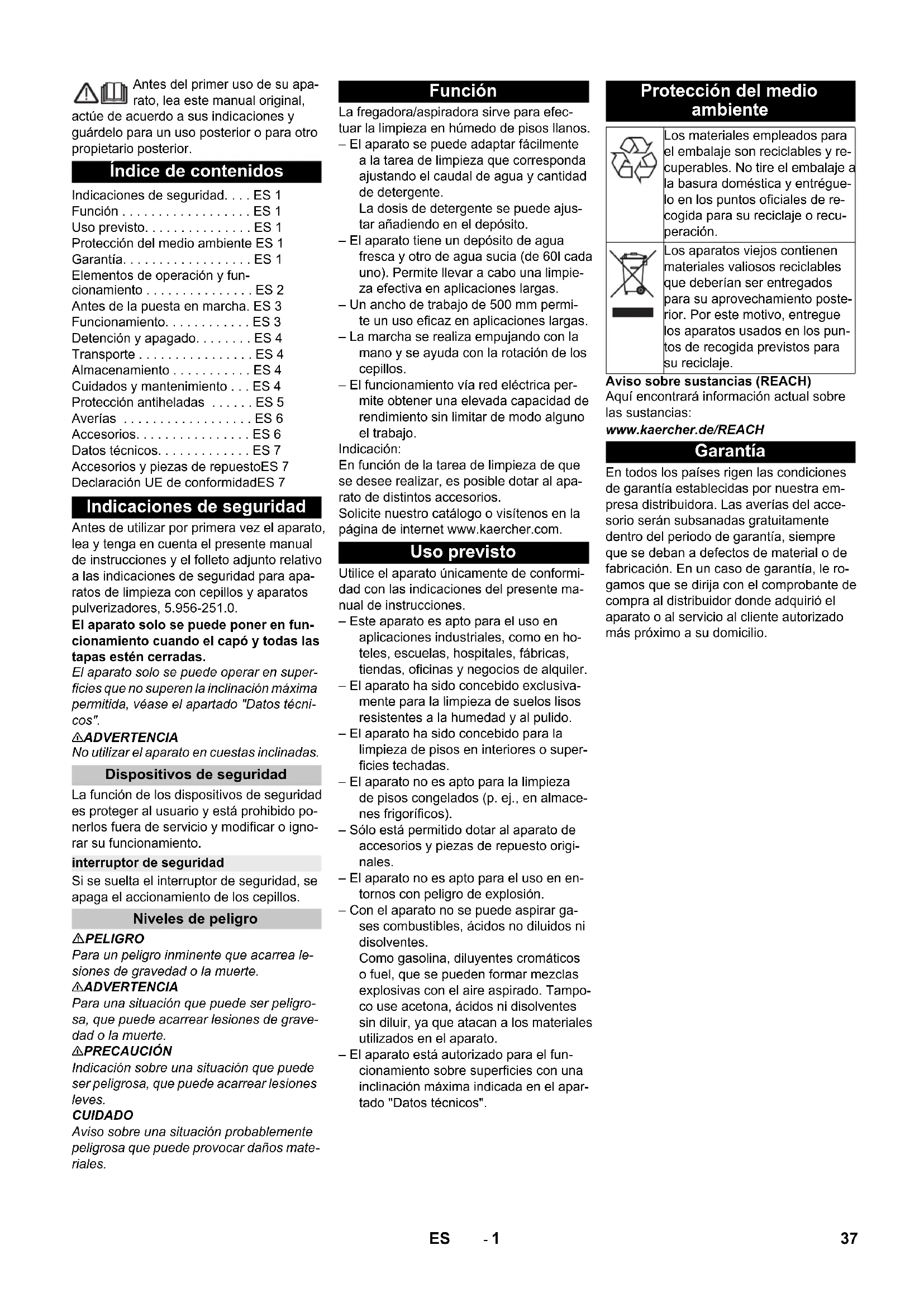 Chairman of the Board of Management Director Regulatory Affairs & Certification 36 NL- 1 Antes del primer uso de su apa- rato, lea este manual original, actúe de acuerdo a sus indicaciones y guárdelo para un uso posterior o para otro propietario posterior. Antes de utilizar por primera vez el aparato, lea y tenga en cuenta el presente manual de instrucciones y el folleto adjunto relativo a las indicaciones de seguridad para apa- ratos de limpieza con cepillos y aparatos pulverizadores, 5.956-251.0. El aparato solo se puede poner en fun- cionamiento cuando el capó y todas las tapas estén cerradas. El aparato solo se puede operar en super- ficies que no superen la inclinación máxima permitida, véase el apartado "Datos técni- cos". 몇 ADVERTENCIA No utilizar el aparato en cuestas inclinadas. La función de los dispositivos de seguridad es proteger al usuario y está prohibido po- nerlos fuera de servicio y modificar o igno- rar su funcionamiento. Si se suelta el interruptor de seguridad, se apaga el accionamiento de los cepillos. PELIGRO Para un peligro inminente que acarrea le- siones de gravedad o la muerte. 몇 ADVERTENCIA Para una situación que puede ser peligro- sa, que puede acarrear lesiones de grave- dad o la muerte. 몇 PRECAUCIÓN Indicación sobre una situación que puede ser peligrosa, que puede acarrear lesiones leves. CUIDADO Aviso sobre una situación probablemente peligrosa que puede provocar daños mate- riales. La fregadora/aspiradora sirve para efec- tuar la limpieza en húmedo de pisos llanos. – El aparato se puede adaptar fácilmente a la tarea de limpieza que corresponda ajustando el caudal de agua y cantidad de detergente. La dosis de detergente se puede ajus- tar añadiendo en el depósito. – El aparato tiene un depósito de agua fresca y otro de agua sucia (de 60l cada uno). Permite llevar a cabo una limpie- za efectiva en aplicaciones largas. – Un ancho de trabajo de 500 mm permi- te un uso eficaz en aplicaciones largas. – La marcha se realiza empujando con la mano y se ayuda con la rotación de los cepillos. – El funcionamiento vía red eléctrica per- mite obtener una elevada capacidad de rendimiento sin limitar de modo alguno el trabajo. Indicación: En función de la tarea de limpieza de que se desee realizar, es posible dotar al apa- rato de distintos accesorios. Solicite nuestro catálogo o visítenos en la página de internet www.kaercher.com. Utilice el aparato únicamente de conformi- dad con las indicaciones del presente ma- nual de instrucciones. – Este aparato es apto para el uso en aplicaciones industriales, como en ho- teles, escuelas, hospitales, fábricas, tiendas, oficinas y negocios de alquiler. – El aparato ha sido concebido exclusiva- mente para la limpieza de suelos lisos resistentes a la humedad y al pulido. – El aparato ha sido concebido para la limpieza de pisos en interiores o super- ficies techadas. – El aparato no es apto para la limpieza de pisos congelados (p. ej., en almace- nes frigoríficos). – Sólo está permitido dotar al aparato de accesorios y piezas de repuesto origi- nales. – El aparato no es apto para el uso en en- tornos con peligro de explosión. – Con el aparato no se puede aspirar ga- ses combustibles, ácidos no diluidos ni disolventes. Como gasolina, diluyentes cromáticos o fuel, que se pueden formar mezclas explosivas con el aire aspirado. Tampo- co use acetona, ácidos ni disolventes sin diluir, ya que atacan a los materiales utilizados en el aparato. – El aparato está autorizado para el fun- cionamiento sobre superficies con una inclinación máxima indicada en el apar- tado "Datos técnicos". Aviso sobre sustancias (REACH) Aquí encontrará información actual sobre las sustancias: www.kaercher.de/REACH En todos los países rigen las condiciones de garantía establecidas por nuestra em- presa distribuidora. Las averías del acce- sorio serán subsanadas gratuitamente dentro del periodo de garantía, siempre que se deban a defectos de material o de fabricación. En un caso de garantía, le ro- gamos que se dirija con el comprobante de compra al distribuidor donde adquirió el aparato o al servicio al cliente autorizado más próximo a su domicilio. Índice de contenidos Indicaciones de seguridad. . . . ES 1 Función . . . . . . . . . . . . . . . . . . ES 1 Uso previsto. . . . . . . . . . . . . . . ES 1 Protección del medio ambiente ES 1 Garantía. . . . . . . . . . . . . . . . . . ES 1 Elementos de operación y fun- cionamiento . . . . . . . . . . . . . . . ES 2 Antes de la puesta en marcha. ES 3 Funcionamiento. . . . . . . . . . . . ES 3 Detención y apagado. . . . . . . . ES 4 Transporte . . . . . . . . . . . . . . . . ES 4 Almacenamiento . . . . . . . . . . . ES 4 Cuidados y mantenimiento . . . ES 4 Protección antiheladas . . . . . . ES 5 Averías . . . . . . . . . . . . . . . . . . ES 6 Accesorios. . . . . . . . . . . . . . . . ES 6 Datos técnicos. . . . . . . . . . . . . ES 7 Accesorios y piezas de repuestoES 7 Declaración UE de conformidadES 7 Indicaciones de seguridad Dispositivos de seguridad interruptor de seguridad Niveles de peligro Función Uso previsto Protección del medio ambiente Los materiales empleados para el embalaje son reciclables y re- cuperables. No tire el embalaje a la basura doméstica y entrégue- lo en los puntos oficiales de re- cogida para su reciclaje o recu- peración. Los aparatos viejos contienen materiales valiosos reciclables que deberían ser entregados para su aprovechamiento poste- rior. Por este motivo, entregue los aparatos usados en los pun- tos de recogida previstos para su reciclaje. Garantía 37ES- 2 1 Filtro de pelusas 2 Interruptor de seguridad 3 Manguera de salida de agua sucia con dispositivo de dosificación 4 Barra de sujeción para la Homebase 5 Flotador 6 Depósito de agua limpia 7 Cierre del depósito de agua limpia 8 Mango empotrado 9 Cabezal limpiador 10 cepillo en forma de disco 11 Orificio de llenado del depósito de 