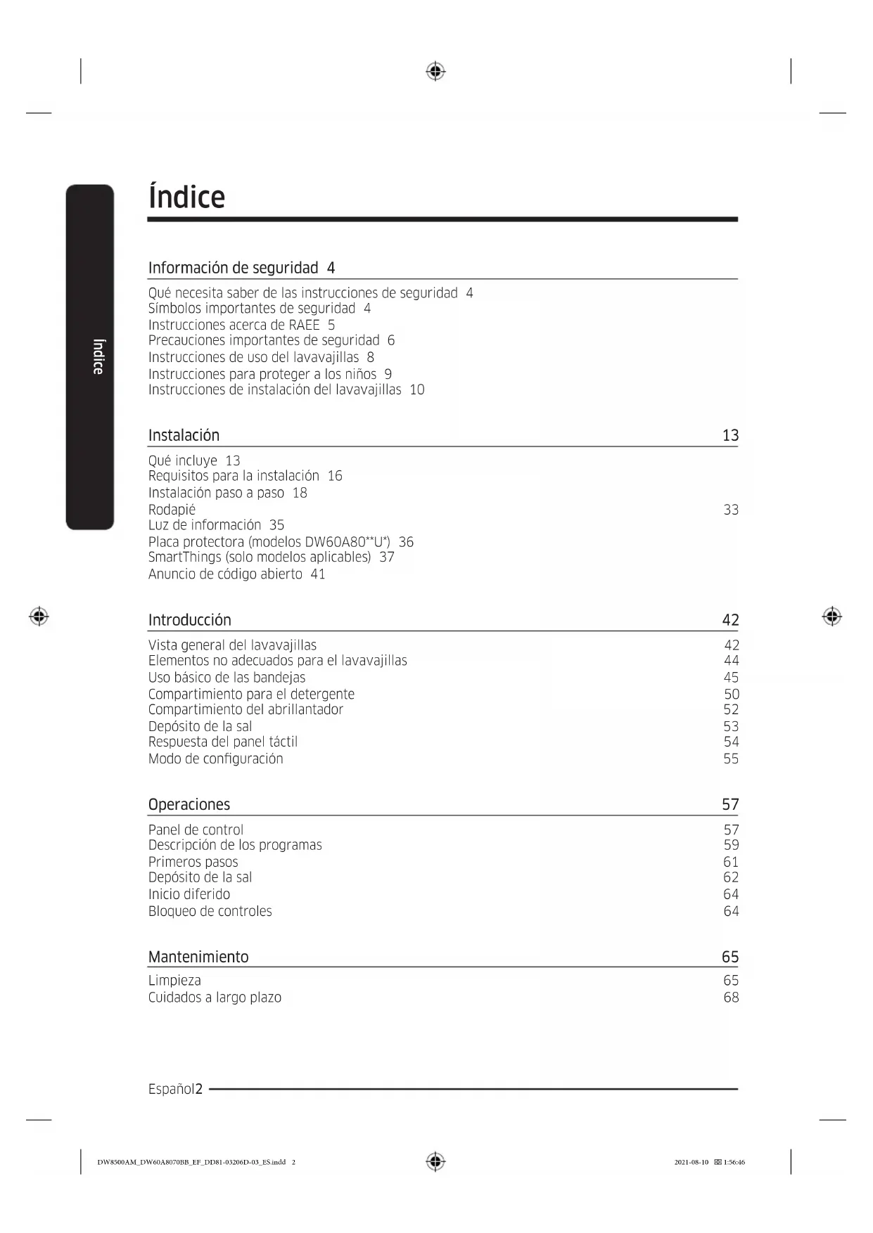 www.samsung.com/be/support (Dutch) www.samsung.com/be_fr/support (French) DENMARK 707 019 70 www.samsung.com/dk/support FINLAND 030-6227 515 www.samsung.com//support FRANCE 01 48 63 00 00 www.samsung.com/fr/support GERMANY 06196 77 555 77 www.samsung.com/de/support ITALIA 800-SAMSUNG (800.7267864) www.samsung.com/it/support CYPRUS 8009 4000 only from landline, toll free www.samsung.com/gr/support GREECE 80111-SAMSUNG (80111 726 7864) only from land line (+30) 210 6897691 from mobile and land line www.samsung.com/gr/support LUXEMBURG 261 03 710 www.samsung.com/be_fr/support NETHERLANDS 088 90 90 100 www.samsung.com/nl/support NORWAY 21629099 www.samsung.com/no/support PORTUGAL 808 207 267 www.samsung.com/pt/support SPAIN 91 175 00 15 www.samsung.com/es/support SWEDEN 0771-400 300 www.samsung.com/se/support SWITZERLAND 0800 726 786 www.samsung.com/ch/support (German) www.samsung.com/ch_fr/support (French) UK 0333 000 0333 www.samsung.com/uk/support IRELAND (EIRE) 0818 717100 www.samsung.com/ie/support DD81-03206D-03 DW8500AM_DW60A8070BB_EF_DD81-03206D-03_FR.indd 84 2021-08-10 2:00:52Lavavajillas Manual del usuario Modelos DW60A807*/DW60A806*/DW60A805*/ DW60A804* DW8500AM_DW60A8070BB_EF_DD81-03206D-03_ES.indd 1 2021-08-10 1:56:46Español2 Índice Índice Información de seguridad 4 Qué necesita saber de las instrucciones de seguridad 4 Símbolos importantes de seguridad 4 Instrucciones acerca de RAEE 5 Precauciones importantes de seguridad 6 Instrucciones de uso del lavavajillas 8 Instrucciones para proteger a los niños 9 Instrucciones de instalación del lavavajillas 10 Instalación 13 Qué incluye 13 Requisitos para la instalación 16 Instalación paso a paso 18 Rodapié 33 Luz de información 35 Placa protectora (modelos DW60A80**U*) 36 SmartThings (solo modelos aplicables) 37 Anuncio de código abierto 41 Introducción 42 Vista general del lavavajillas 42 Elementos no adecuados para el lavavajillas 44 Uso básico de las bandejas 45 Compartimiento para el detergente 50 Compartimiento del abrillantador 52 Depósito de la sal 53 Respuesta del panel táctil 54 Modo de conguración 55 Operaciones 57 Panel de control 57 Descripción de los programas 59 Primeros pasos 61 Depósito de la sal 62 Inicio diferido 64 Bloqueo de controles 64 Mantenimiento 65 Limpieza 65 Cuidados a largo plazo 68 DW8500AM_DW60A8070BB_EF_DD81-03206D-03_ES.indd 2 2021-08-10 1:56:46Español 3 Índice Solución de problemas 69 Puntos de comprobación 69 Códigos de información 72 Tabla de ciclos 73 Apéndice 77 Transporte/reubicación 77 Protección contra congelación 77 Eliminación del lavavajillas y ayuda al medio ambiente 77 Para más información sobre el diseño ecológico 77 Especicaciones 78 Para prueba estándar 79 DW8500AM_DW60A8070BB_EF_DD81-03206D-03_ES.indd 3 2021-08-10 1:56:46Español4 Información de seguridad Información de seguridad Enhorabuena por haber adquirido este nuevo lavavajillas Samsung. Este manual incluye información importante acerca de la instalación, el uso y el mantenimiento de este electrodoméstico. Tómese un tiempo para leerlo y así conocer todas las ventajas y características del lavavajillas. Qué necesita saber de las instrucciones de seguridad Lea atentamente este manual para asegurarse de que sabrá utilizar de manera segura y eciente todas las características y funciones de este nuevo electrodoméstico, y guárdelo en un lugar seguro cerca del aparato para futuras consultas. Utilice el aparato solo para las funciones propias, como se describe en este manual de usuario. Las advertencias y las instrucciones importantes de seguridad de este manual no cubren todos los supuestos y situaciones posibles que se pueden producir. Es responsabilidad del usuario utilizar el sentido común, ser precavido y tener cuidado al instalar, mantener y poner en funcionamiento el lavavajillas. Dado que estas instrucciones de funcionamiento sirven para varios modelos, las características de este lavavajillas pueden diferir ligeramente de las que se explican en el manual y es posible que algunos de los símbolos de advertencia no se puedan aplicar. Si tiene preguntas o dudas póngase en contacto con el centro de servicio más cercano o consulte la ayuda y la información en línea en www.samsung.com. Símbolos importantes de seguridad Signicado de los iconos y símbolos utilizados en este manual del usuario: ADVERTENCIA Prácticas poco seguras o arriesgadas que pueden causar lesiones personales graves, la muerte o daños materiales. PRECAUCIÓN Prácticas poco seguras o arriesgadas que pueden causar lesiones personales y/o daños materiales. NOTA Indica la existencia de un riesgo de lesiones personales o daños materiales. Estos símbolos de advertencia sirven para evitar que el usuario y otras personas sufran daños. Sígalos atentamente. Conserve estas instrucciones en lugar seguro y asegúrese de que los nuevos usuarios las conozcan. Entrégueselas a un futuro propietario. DW8500AM_DW60A8070BB_EF_DD81-03206D-03_ES.indd 4 2021-08-10 1:56:46Español 5 Información de seguridad Instrucciones acerca de RAEE Eliminación correcta de este producto (Residuos de aparatos eléctricos y electrónicos) (Se aplica en países con sistemas de recolección por separado) La presencia de este símbolo en el producto, accesorios o material informativo que lo acompañan, indica que al nalizar su vida útil ni el producto ni sus accesorios electrónicos (como el cargador, cascos, cable USB) deberán eliminarse junto con otros residuos domésticos. Para evitar los posibles daños al medio ambiente o a la salud humana que representa la eliminación incontrolada de residuos, separe estos productos de otros tipos de residuos y recíclelos correctamente. De esta forma se promueve la reutilización sostenible de recursos materiales. Los usuarios particulares pueden contactar con el establecimiento donde adquirieron el producto o con las autoridades locales pertinentes para informarse sobre cómo y dónde pueden llev