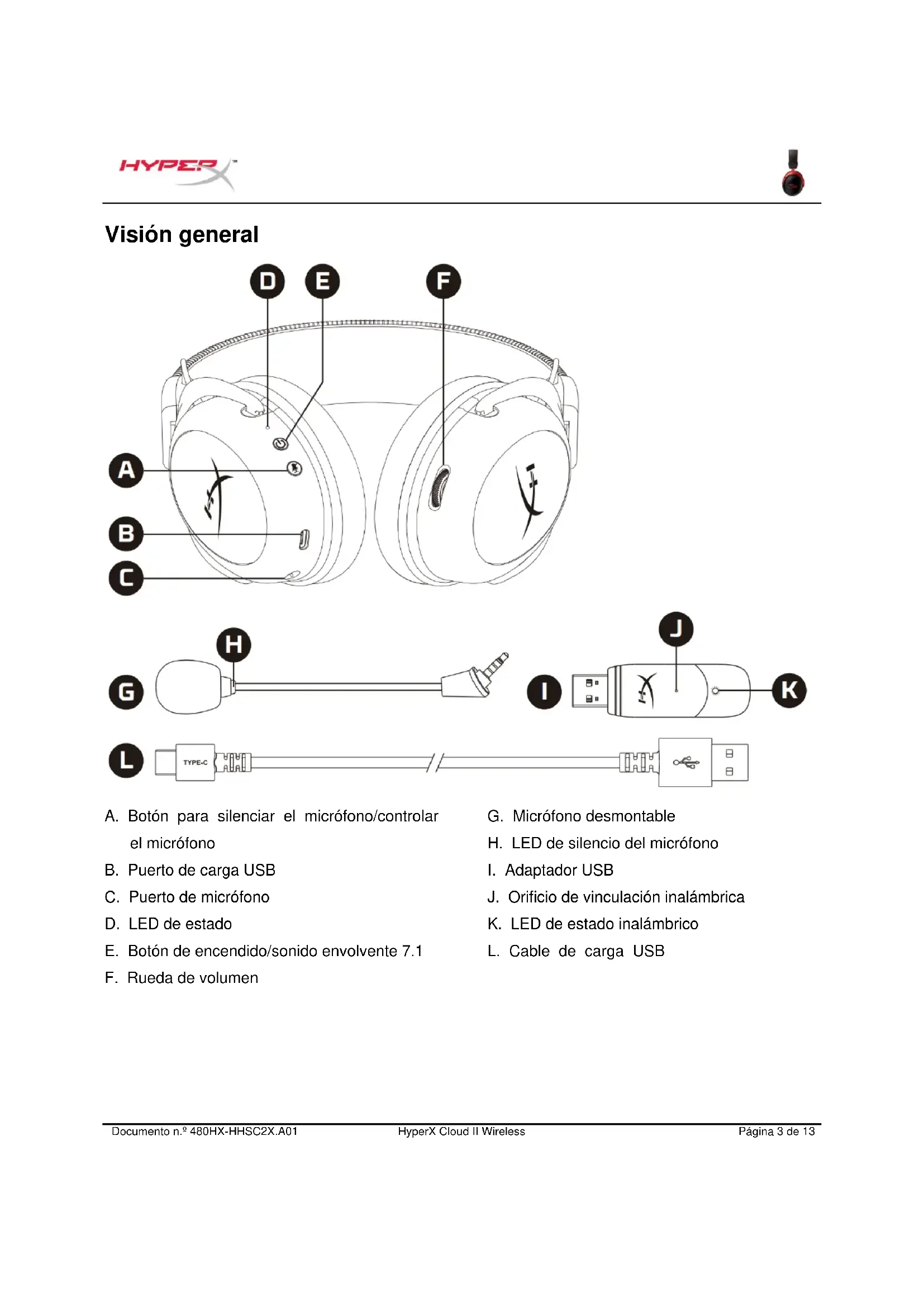 J. Orificio de vinculación inalámbrica K. LED de estado inalámbrico L. Cable de carga USBDocumento n.º 480HX-HHSC2X.A01 HyperX Cloud II Wireless Página 4 de 13