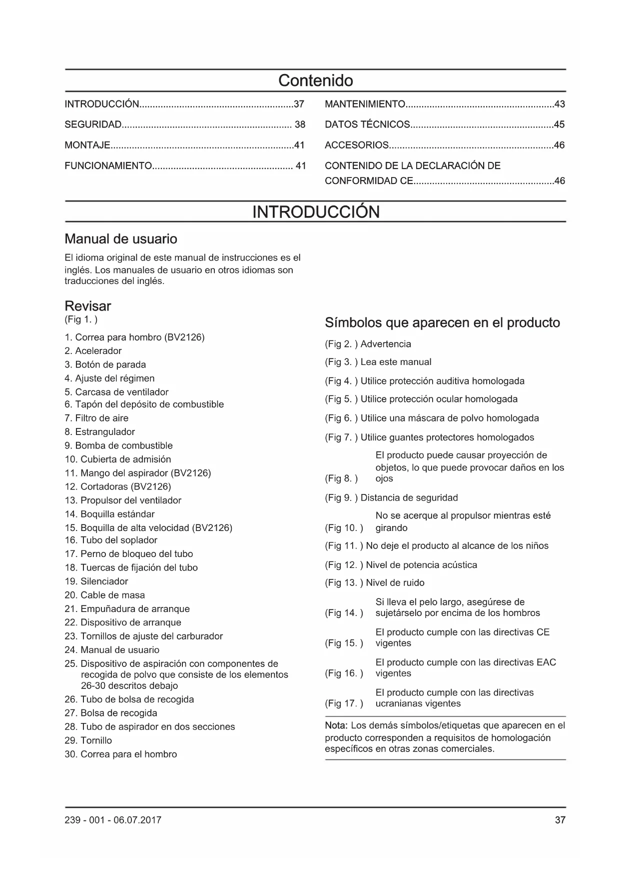 Símbolos que aparecen en el producto (Fig 2. ) Advertencia (Fig 3. ) Lea este manual (Fig 4. ) Utilice protección auditiva homologada (Fig 5. ) Utilice protección ocular homologada (Fig 6. ) Utilice una máscara de polvo homologada (Fig 7. ) Utilice guantes protectores homologados (Fig 8. ) El producto puede causar proyección de objetos, lo que puede provocar daños en los ojos (Fig 9. ) Distancia de seguridad (Fig 10. ) No se acerque al propulsor mientras esté girando (Fig 11. ) No deje el producto al alcance de los niños (Fig 12. ) Nivel de potencia acústica (Fig 13. ) Nivel de ruido (Fig 14. ) Si lleva el pelo largo, asegúrese de sujetárselo por encima de los hombros (Fig 15. ) El producto cumple con las directivas CE vigentes (Fig 16. ) El producto cumple con las directivas EAC vigentes (Fig 17. ) El producto cumple con las directivas ucranianas vigentes Nota: Los demás símbolos/etiquetas que aparecen en el producto corresponden a requisitos de homologación específicos en otras zonas comerciales.