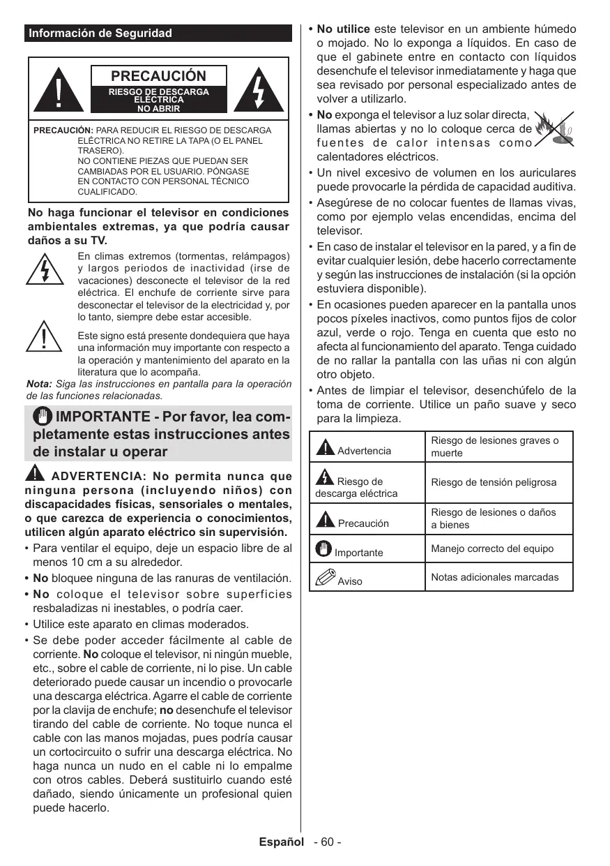 CUALIFICADO. No haga funcionar el televisor en condiciones ambientales extremas, ya que podría causar daños a su TV. En climas extremos (tormentas, relámpagos) y largos periodos de inactividad (irse de vacaciones) desconecte el televisor de la red eléctrica. El enchufe de corriente sirve para desconectar el televisor de la electricidad y, por lo tanto, siempre debe estar accesible. Este signo está presente dondequiera que haya una información muy importante con respecto a la operación y mantenimiento del aparato en la literatura que lo acompaña. Nota: Siga las instrucciones en pantalla para la operación de las funciones relacionadas. IMPORTANTE - Por favor, lea completamente estas instrucciones antes de instalar u operar ADVERTENCIA: No permita nunca que ninguna persona (incluyendo niños) con discapacidades físicas, sensoriales o mentales, o que carezca de experiencia o conocimientos, utilicen algún aparato eléctrico sin supervisión.