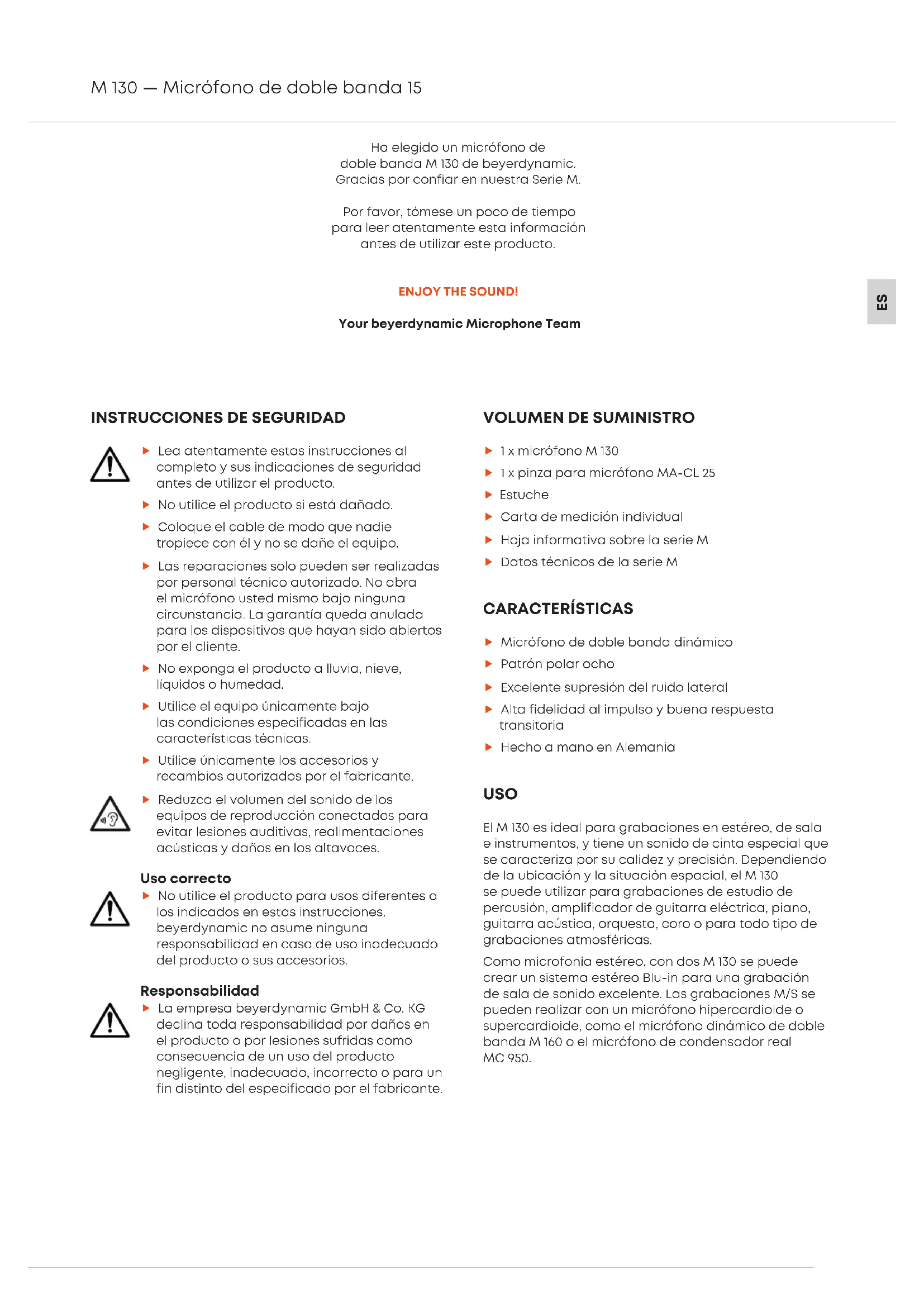 Ha elegido un micrófono de doble banda M 130 de beyerdynamic. Gracias por confiar en nuera Serie M. Por favor, tómese un poco de tiempo para leer atentamente ea información antes de utilizar ee producto. ENJOY THE SOUND! Your beyerdynamic Microphone Team