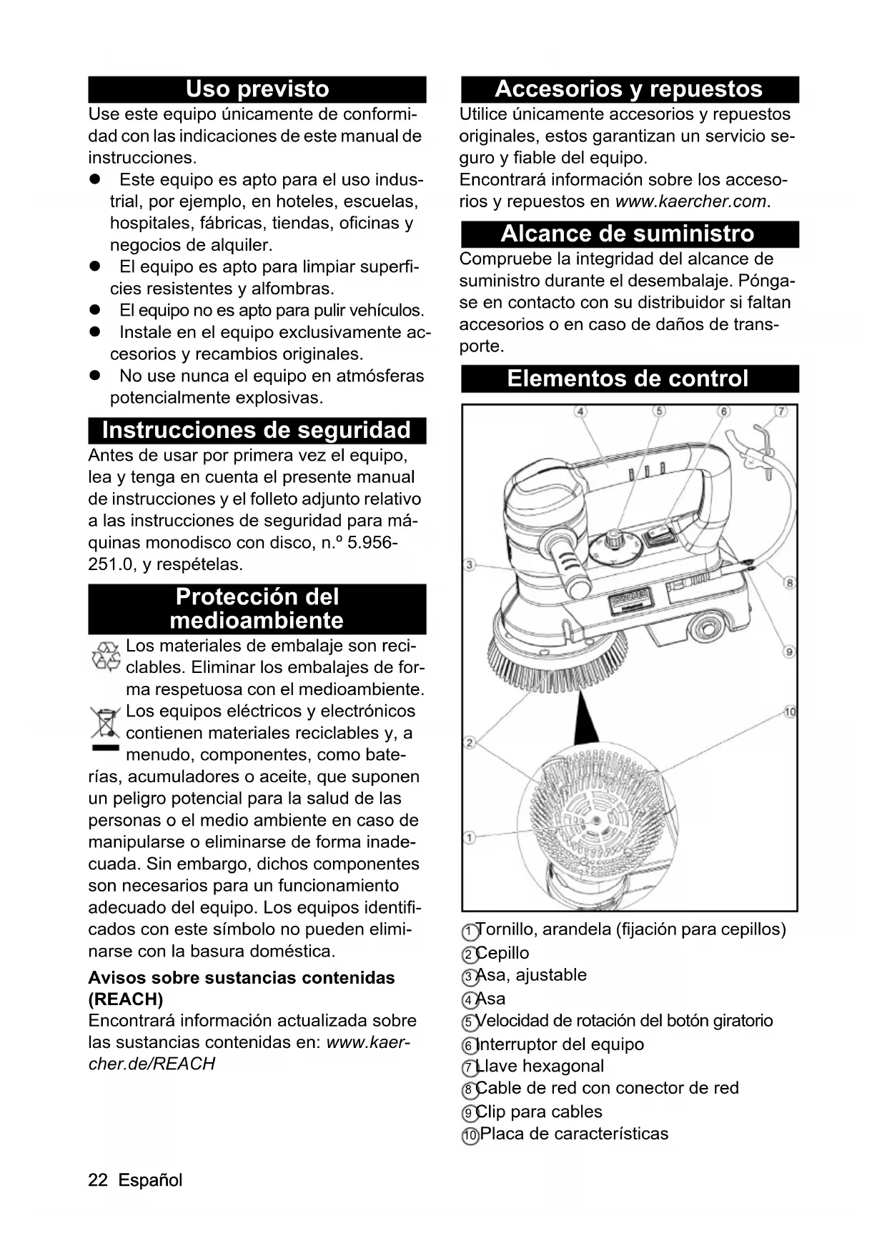 - Declaración de conformidad UE Español Uso previsto Use este equipo únicamente de conformi- dad con las indicaciones de este manual de instrucciones. Este equipo es apto para el uso indus- trial, por ejemplo, en hoteles, escuelas, hospitales, fábricas, tiendas, oficinas y negocios de alquiler. El equipo es apto para limpiar superfi- cies resistentes y alfombras. El equipo no es apto para pulir vehículos. Instale en el equipo exclusivamente ac- cesorios y recambios originales. No use nunca el equipo en atmósferas potencialmente explosivas. Instrucciones de seguridad Antes de usar por primera vez el equipo, lea y tenga en cuenta el presente manual de instrucciones y el folleto adjunto relativo a las instrucciones de seguridad para má- quinas monodisco con disco, n.º 5.956- 251.0, y respételas. Protección del medioambiente Los materiales de embalaje son reci- clables. Eliminar los embalajes de for- ma respetuosa con el medioambiente. Los equipos eléctricos y electrónicos contienen materiales reciclables y, a menudo, componentes, como bate- rías, acumuladores o aceite, que suponen un peligro potencial para la salud de las personas o el medio ambiente en caso de manipularse o eliminarse de forma inade- cuada. Sin embargo, dichos componentes son necesarios para un funcionamiento adecuado del equipo. Los equipos identifi- cados con este símbolo no pueden elimi- narse con la basura doméstica. Avisos sobre sustancias contenidas (REACH) Encontrará información actualizada sobre las sustancias contenidas en: www.kaer- cher.de/REACH Accesorios y repuestos Utilice únicamente accesorios y repuestos originales, estos garantizan un servicio se- guro y fiable del equipo. Encontrará información sobre los acceso- rios y repuestos en www.kaercher.com. Alcance de suministro Compruebe la integridad del alcance de suministro durante el desembalaje. Pónga- se en contacto con su distribuidor si faltan accesorios o en caso de daños de trans- porte. Elementos de control 1 Tornillo, arandela (fijación para cepillos) 2 Cepillo 3 Asa, ajustable 4 Asa 5 Velocidad de rotación del botón giratorio 6 Interruptor del equipo 7 Llave hexagonal 8 Cable de red con conector de red 9 Clip para cables 10 Placa de característicasEspañol 23 Puesta en funcionamiento Fijación del cepillo/plato impulsor del cepillo de esponja CUIDADO Peligro de daños El tornillo de fijación que sobresale sobre el cuerpo del cepillo puede causar arañazos en el objeto de limpieza si el cepillo se des- gasta demasiado. Renueve el cepillo de limpieza antes de que las cerdas se vuelvan demasiado cortas. p. 2622