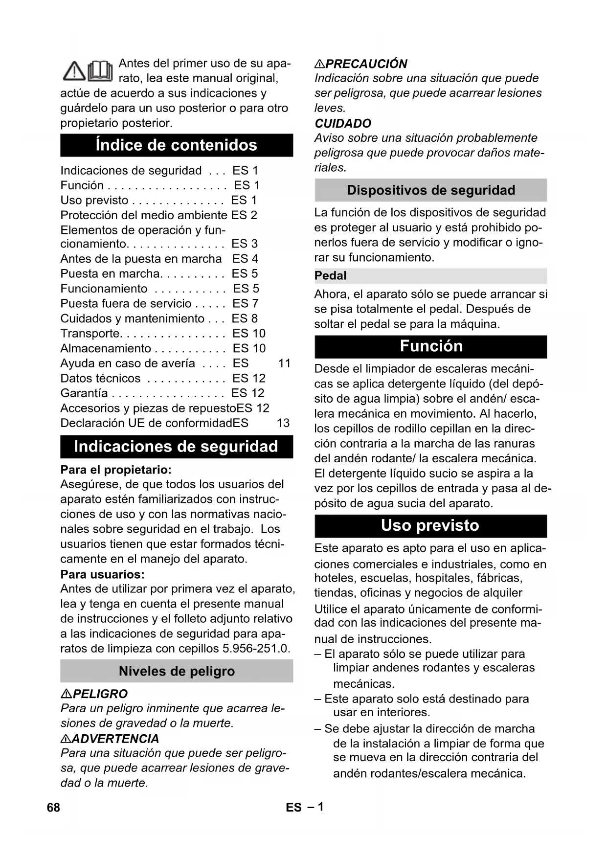 Chairman of the Board of Management Director Regulatory Affairs & Certification 67NL– 1 Antes del primer uso de su apa- rato, lea este manual original, actúe de acuerdo a sus indicaciones y guárdelo para un uso posterior o para otro propietario posterior. Para el propietario: Asegúrese, de que todos los usuarios del aparato estén familiarizados con instruc- ciones de uso y con las normativas nacio- nales sobre seguridad en el trabajo. Los usuarios tienen que estar formados técni- camente en el manejo del aparato. Para usuarios: Antes de utilizar por primera vez el aparato, lea y tenga en cuenta el presente manual de instrucciones y el folleto adjunto relativo a las indicaciones de seguridad para apa- ratos de limpieza con cepillos 5.956-251.0. PELIGRO Para un peligro inminente que acarrea le- siones de gravedad o la muerte. 몇 ADVERTENCIA Para una situación que puede ser peligro- sa, que puede acarrear lesiones de grave- dad o la muerte. 몇 PRECAUCIÓN Indicación sobre una situación que puede ser peligrosa, que puede acarrear lesiones leves. CUIDADO Aviso sobre una situación probablemente peligrosa que puede provocar daños mate- riales. La función de los dispositivos de seguridad es proteger al usuario y está prohibido po- nerlos fuera de servicio y modificar o igno- rar su funcionamiento. Ahora, el aparato sólo se puede arrancar si se pisa totalmente el pedal. Después de soltar el pedal se para la máquina. Desde el limpiador de escaleras mecáni- cas se aplica detergente líquido (del depó- sito de agua limpia) sobre el andén/ esca- lera mecánica en movimiento. Al hacerlo, los cepillos de rodillo cepillan en la direc- ción contraria a la marcha de las ranuras del andén rodante/ la escalera mecánica. El detergente líquido sucio se aspira a la vez por los cepillos de entrada y pasa al de- pósito de agua sucia del aparato. Este aparato es apto para el uso en aplica- ciones comerciales e industriales, como en hoteles, escuelas, hospitales, fábricas, tiendas, oficinas y negocios de alquiler Utilice el aparato únicamente de conformi- dad con las indicaciones del presente ma- nual de instrucciones. – El aparato sólo se puede utilizar para limpiar andenes rodantes y escaleras mecánicas. – Este aparato solo está destinado para usar en interiores. – Se debe ajustar la dirección de marcha de la instalación a limpiar de forma que se mueva en la dirección contraria del andén rodantes/escalera mecánica. Índice de contenidos Indicaciones de seguridad . . . ES 1 Función . . . . . . . . . . . . . . . . . . ES 1 Uso previsto . . . . . . . . . . . . . . ES 1 Protección del medio ambiente ES 2 Elementos de operación y fun- cionamiento. . . . . . . . . . . . . . . ES 3 Antes de la puesta en marcha ES 4 Puesta en marcha. . . . . . . . . . ES 5 Funcionamiento . . . . . . . . . . . ES 5 Puesta fuera de servicio . . . . . ES 7 Cuidados y mantenimiento . . . ES 8 Transporte. . . . . . . . . . . . . . . . ES 10 Almacenamiento . . . . . . . . . . . ES 10 Ayuda en caso de avería . . . . ES 11 Datos técnicos . . . . . . . . . . . . ES 12 Garantía . . . . . . . . . . . . . . . . . ES 12 Accesorios y piezas de repuestoES 12 Declaración UE de conformidadES 13 Indicaciones de seguridad Niveles de peligro Dispositivos de seguridad Pedal Función Uso previsto 68 ES– 2 – Sólo se puede utili8zar el aparato para limpiar la parte inferior de la escalera mecánica. – Sólo está permitido dotar al aparato de accesorios y piezas de repuesto origi- nales. Indicaciones sobre ingredientes (REACH) Encontrará información actual sobre los in- gredientes en: www.kaercher.com/REACH Protección del medio ambiente Los materiales empleados para el embalaje son reciclables y re- cuperables. No tire el embalaje a la basura doméstica y entrégue- lo en los puntos oficiales de re- cogida para su reciclaje o recu- peración. Los aparatos viejos contienen materiales valiosos reciclables que deberían ser entregados para su aprovechamiento poste- rior. Evite el contacto de bate- rías, aceites y materias seme- jantes con el medio ambiente. Por este motivo, entregue los aparatos usados en los puntos de recogida previstos para su re- ciclaje. 69ES– 3 1 Estribo de empuje 2 Manguera de salida de agua limpia 3 Manguera de salida de agua sucia 4 Clavija de red 5 Gancho de relajación de esfuerzos me- cánicos 6 Pedal 7 Ruedas traseras con palanca de blo- queo 8 Tapa del depósito de agua sucia 9 Ruedas delanteras 10 depósito de agua sucia 11 Orificio de llenado del depósito de agua limpia 12 Pedal para bajas/elevar el cabezal del cepillo 13 Palanca para bloquear el cabezal de cepillo 1 Contador de horas de servicio 2 Indicador presión de la bomba 3 Interruptor del aparato 4 Piloto de control "depósito de agua su- cia lleno" 5 Piloto de control "sobrecarga motor del cepillo" Elementos de operación y funcionamiento Pupitre de mando 70 ES– 4 Retirar todo el embalaje menos el palet de madera. Colocar el estribo de empuje en las ra- nuras del aparato. Fijar el estribo con los 4 tornillos que vienen incluidos. Fijar la tapadera abatible. Colgar el gancho de relajación de es- fuerzos mecánicos del estribo de em- puje. Fijar las ruedas trasera, retirar las cu- ñas de madera para bloquear las rue- das. Las cuatro tablas de suelo marcadas del palet están sujetas mediante torni- llos. Desatornille dichas tablas. Coloque las tablas sobre el borde del palet. Verifique que queden ubicadas delante de las ruedas del equipo. Fije las tablas con los tornillos. Empujar lentamente el aparato de la rampa. Indicación: En la fabricación, el equipo se ha enjuaga- do con anticongelante. El anticongelante debe retirarse antes de la primera puesta en marcha. Rellenar el depósito de agua fresca con 10 litros de agua fresca. Pisar el pedal. Ajustar el interruptor del aparato en lim- pieza a fondo. Dejar el aparato en funcionamiento hasta que se vea en el manómetro que ha bajado la presión. Símbolos en