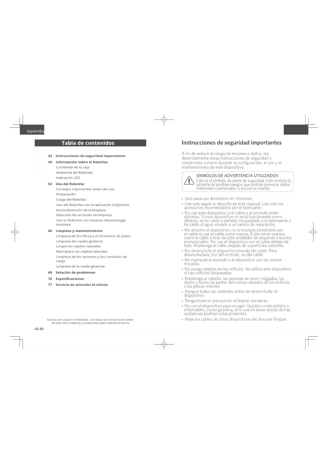 Cleaning Time Max. 100 mins Charging Time 300 - 360 mins Charging Temperature 5°C - 40°C Storage Temperature -20°C - 60°C Input 19 V 0.6 A Output 19 V 0.6 A Customer Service For FAQs and more information, please visit www.eufylife.com. support@eufylife.com support.mea@anker.com (For Middle East and Africa Only) service@myeufy.com.au www.eufylife.com (US) +1 (800) 988 7973 Mon-Fri 9:00am - 5:00pm (PT) (UK) +44 (0) 1604 936200 Mon-Fri 6:00 - 11:00 (GMT) (DE) +49 (0) 69 9579 7960 Mo-Fr 6:00 - 11:00 (中国) +86 400 0550 036 周一至周五 9:00 - 17:30 (日本) 03 4455 7823 月-金 9:00 - 17:00 (Middle East & Africa) +971 42463266 Sun-Thu 9:00 - 17:30 (GMT+4) (UAE) +971 8000320817 Sun-Thu 9:00 - 17:30 (GMT+4) (KSA) +966 8008500030 Sun-Thu 8:00 - 16:30 (GMT+3) (Kuwait) +965 22069086 Sun-Thu 8:00 - 16:30 (GMT+3) (Egypt) +20 8000000826 Sun-Thu 7:00 - 15:30 (GMT+2) (KR) +82 02-1670-7098 Mon-Fri 10:00 - 17: 00 (GMT+1) (AU) +61 3 8331 4800 Mon-Fri 8:30 - 17:00 (AEST) @EufyOcial @EufyOcial@EufyOcial @EufyOcial Anker Innovations Limited Room 1318-19, Hollywood Plaza, 610 Nathan Road, Mongkok, Kowloon, Hong Kong42 43 Español Español Gracias por adquirir el RoboVac. Lea todas las instrucciones antes de usar este producto y consérvelas para referencia futura. 43 Instruccionesdeseguridadimportantes 49 Información sobre el RoboVac Contenido de la caja Anatomía del RoboVac Indicación LED 53UsodelRoboVac Consejos importantes antes del uso Preparación Carga del RoboVac Uso del RoboVac con la aplicación EufyHome Inicio/detención de la limpieza Selección de un modo de limpieza Use su RoboVac con Amazon Alexa/Google Assistant 62 Limpieza y mantenimiento Limpieza de los ltros y el recolector de polvo Limpieza del cepillo giratorio Limpie los cepillos laterales Reemplace los cepillos laterales Limpieza de los sensores y los contactos de carga Limpieza de la rueda giratoria 69Solucióndeproblemas 76Especicaciones 77Serviciodeatenciónalcliente Tabladecontenidos Instrucciones de seguridad importantes A fin de reducir el riesgo de lesiones o daños, lea detenidamente estas instrucciones de seguridad y consérvelas a mano durante la configuración, el uso y el mantenimiento de este dispositivo.