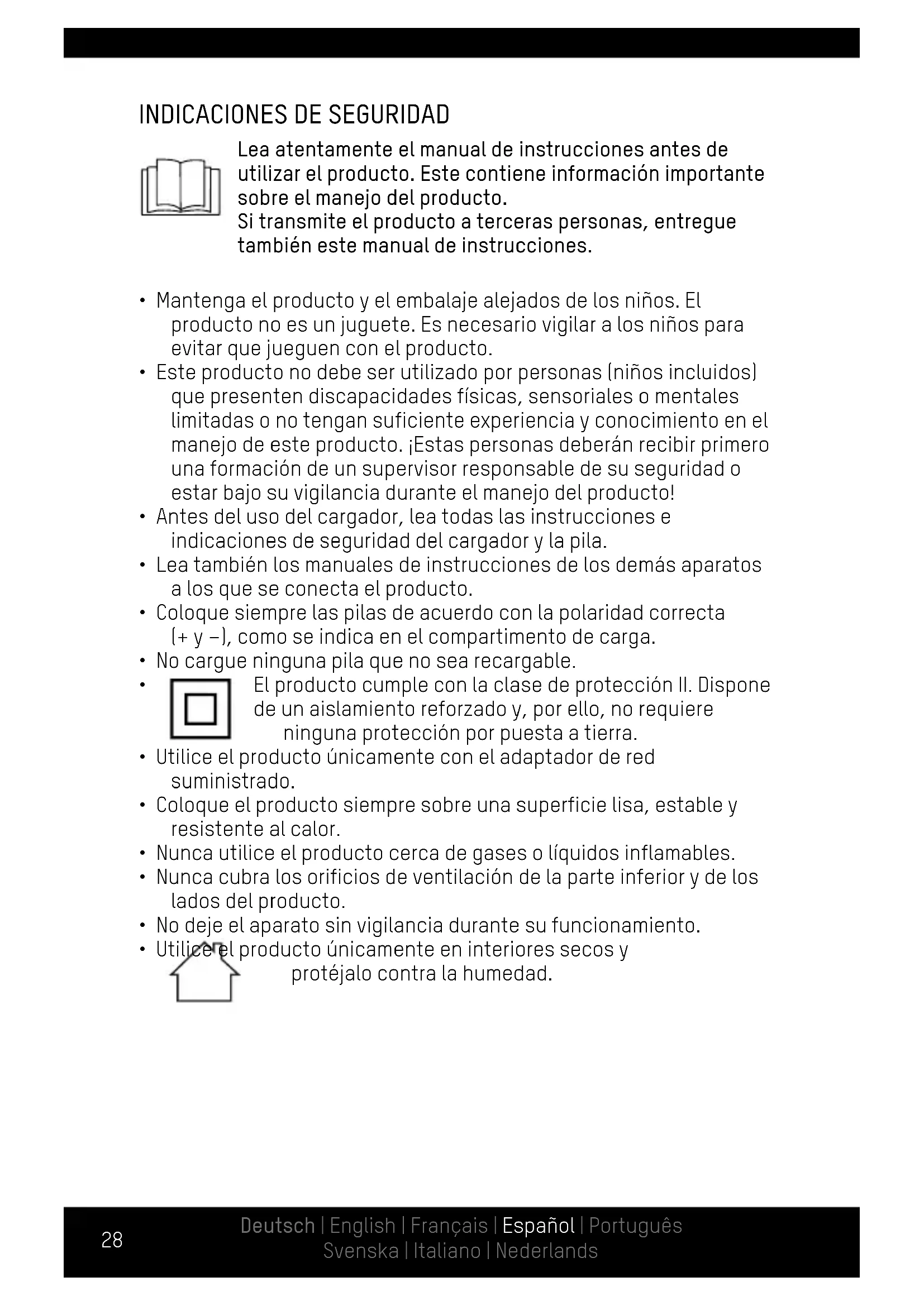 El producto sirve para cargar pilas de ion-litio/NiMH/NiCd. Reconoce por sí mismo el tipo de pila y se ajusta automáticamente. Asimismo, el producto dispone de una conexión USB, que sirve como fuente de tensión USB. De este modo, los aparatos se pueden cargar de forma adicional. El producto solo es apropiado para el uso privado y no para el uso comercial.Deutsch | English | Français | Español | Português Svenska | Italiano | Nederlands Deutsch | English | Français | Español | Português Svenska | Italiano | Nederlands