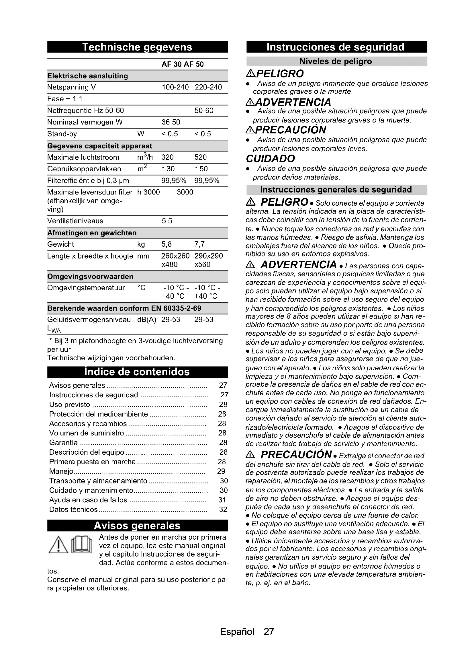- Bij 3 m plafondhoogte en 3-voudige luchtverversing per uur Technische wijzigingen voorbehouden. Índice de contenidos Avisos generales Antes de poner en marcha por primera vez el equipo, lea este manual original y el capítulo Instrucciones de seguri- dad. Actúe conforme a estos documen- tos. Conserve el manual original para su uso posterior o pa- ra propietarios ulteriores. Instrucciones de seguridad Niveles de peligro PELIGRO ● Aviso de un peligro inminente que produce lesiones corporales graves o la muerte. 몇 ADVERTENCIA ● Aviso de una posible situación peligrosa que puede producir lesiones corporales graves o la muerte. 몇 PRECAUCIÓN ● Aviso de una posible situación peligrosa que puede producir lesiones corporales leves. CUIDADO ● Aviso de una posible situación peligrosa que puede producir daños materiales. Instrucciones generales de seguridad PELIGRO ● Solo conecte el equipo a corriente alterna. La tensión indicada en la placa de característi- cas debe coincidir con la tensión de la fuente de corrien- te. ● Nunca toque los conectores de red y enchufes con las manos húmedas. ● Riesgo de asfixia. Mantenga los embalajes fuera del alcance de los niños. ● Queda pro- hibido su uso en entornos explosivos. 몇 ADVERTENCIA ● Las personas con capa- cidades físicas, sensoriales o psíquicas limitadas o que carezcan de experiencia y conocimientos sobre el equi- po solo pueden utilizar el equipo bajo supervisión o si han recibido formación sobre el uso seguro del equipo y han comprendido los peligros existentes. ● Los niños mayores de 8 años pueden utilizar el equipo si han re- cibido formación sobre su uso por parte de una persona responsable de su seguridad o si están bajo supervi- sión de un adulto y comprenden los peligros existentes. ● Los niños no pueden jugar con el equipo. ● Se d ebe supervisar a los niños para asegurarse de que no jue- guen con el aparato. ● Los niños solo pueden realizar la limpieza y el mantenimiento bajo supervisión. ● Com- pruebe la presencia de daños en el cable de red con en- chufe antes de cada uso. No ponga en funcionamiento un equipo con cables de conexión de red dañados. En- cargue inmediatamente la sustitución de un cable de conexión dañado al servicio de atención al cliente auto- rizado/electricista formado. ● Apague el dispositivo de inmediato y desenchufe el cable de alimentación antes de realizar todo trabajo de servicio y mantenimiento. 몇 PRECAUCIÓN ● Extraiga el conector de red del enchufe sin tirar del cable de red. ● Solo el servicio de postventa autorizado puede realizar los trabajos de reparación, el montaje de los recambios y otros trabajos en los componentes eléctricos. ● La entrada y la salida de aire no deben obstruirse. ● Apague el equipo des- pués de cada uso y desenchufe el conector de red. ● No coloque el equipo cerca de una fuente de calor. ● El equipo no sustituye una ventilación adecuada. ● El equipo debe asentarse sobre una base lisa y estable. ● Utilice únicamente accesorios y recambios autoriza- dos por el fabricante. Los accesorios y recambios origi- nales garantizan un servicio seguro y sin fallos del equipo. ● No utilice el equipo en entornos húmedos o en habitaciones con una elevada temperatura ambien- te, p. ej. en el baño. AF 30 AF 50 Elektrische aansluiting Netspanning V 100-240 220-240 Fase ~ 1 1 Netfrequentie Hz 50-60 50-60 Nominaal vermogen W