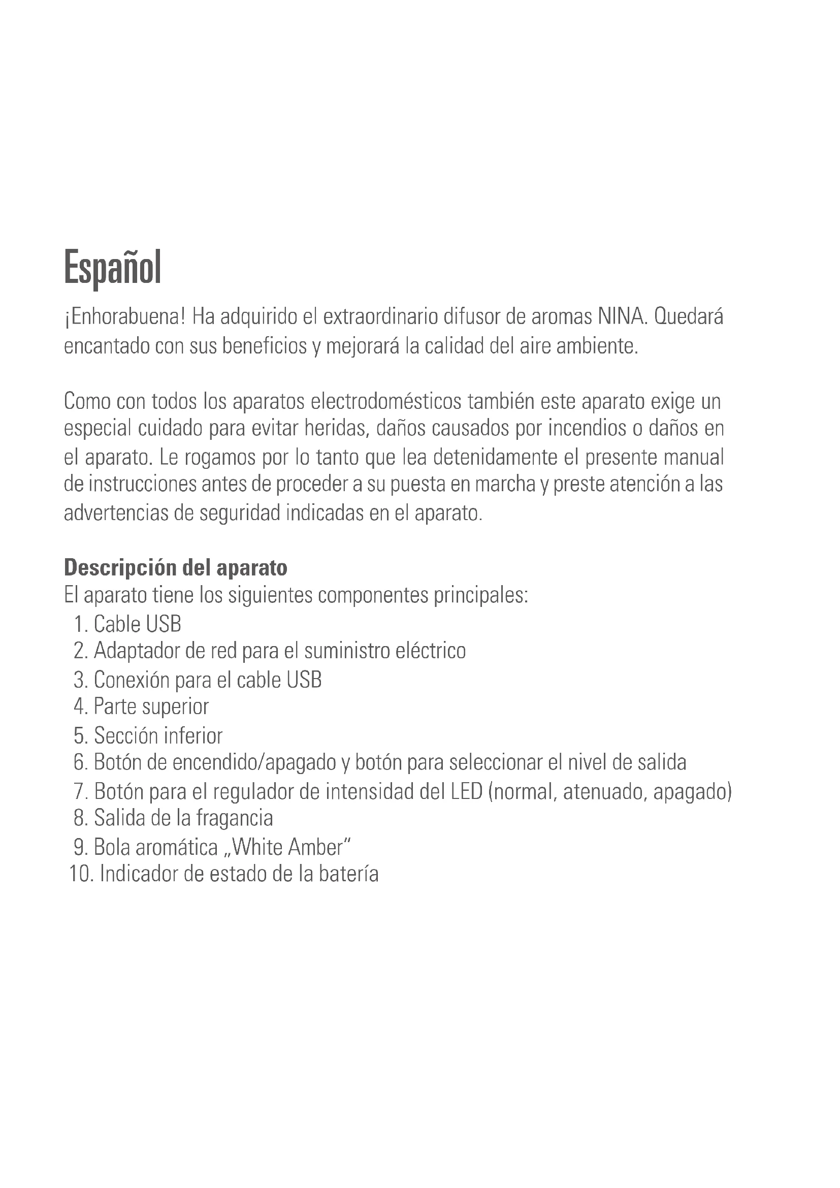 - Una vez llegado el aparato al final de su vida útil, inutilizarlo inmediatamente (separar el cable) y entregarlo en el centro de recogida previsto a tal efecto. Eliminación La directiva europea 2012 / 19 / CE sobre residuos de equipos eléctricos y elec- trónicos (WEEE), exige que los aparatos eléctricos domésticos antiguos no de- ben eliminarse en la recogida de residuos municipal normal sin clasificar. Los aparatos antiguos deben recogerse de forma separada para optimizar la recupe- ración y el reciclaje de los materiales y reducir el impacto sobre la salud humana y el medioambiente. El símbolo del “cubo de basura” tachado en el producto le recuerda su obligación de que, cuando se deshaga del aparato, debe recogerse de forma separada. Los consumidores deben ponerse en contacto con las au- toridades locales o con el distribuidor para obtener información respecto a la correcta eliminación del aparato antiguo. La bola aromática está fabricada en un plástico sin cloro, por lo que se la puede desechar con la basura domés- tica. Eliminación de la batería: no tirar al cubo de la basura doméstica. El electrodo está envuelto en papel aislante y puede ser reciclado y usado de nuevoDatos técnicos Tensión nominal 100–240 V / 50/60 Hz Potencia 3.5 W Tiempo de funcionamiento hasta 50 h Dimensiones 100 x 160 mm (diámetro x alto) Peso 360 g Nivel de intensidad acústica < 26 dB(A) Rango de temperatura para la carga de la batería 0–45 °C Modelo de la batería PN103040 Cumple la norma UE CE / RoHS / EAC Quedan reservadas modificaciones técnicasNederlands Gefeliciteerd! U heeft zojuist de speciale aromadiffuser-dame NINA aange- schaft. Hij zal u veel plezier doen en de ruimtelucht voor u verbeteren. Zoals met alle elektronische apparaten, is zorgvuldig gebruik noodzakelijk om verwonding, brandschade of schade aan het apparaat te vermijden. Bestudeer de instructies nauwkeurig en volg de adviezen op het apparaat zelf, alvorens het apparaat voor het eerst te gebruiken. Apparaatbeschrijving Het apparaat bestaat uit de volgende onderdelen: