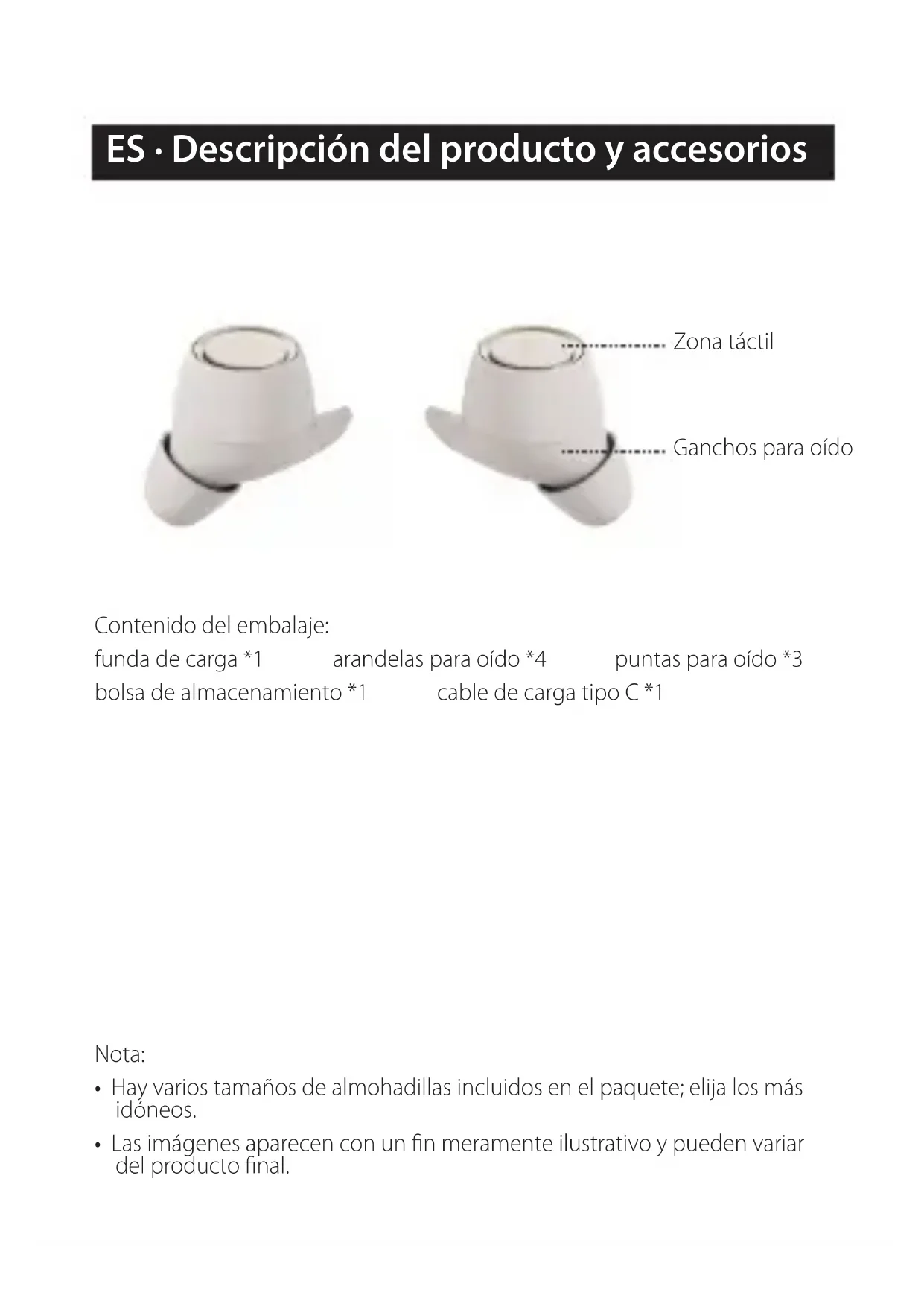 Entrada nominal: 5V 60mA (auriculares) 5V 500mA (estuche de carga)■ Instrucciones de funcionamiento ● Llamando Aceptar/nalizar llamada: pulsar dos veces en el auricular derecho Aceptar/nalizar llamada: pulsar dos veces en el auricular izquierdo ● Reproducción de música Detener/reproducir: pulsar dos veces en el auricular derecho Pista siguiente: tocar tres veces en el auricular derecho Asistente de voz: pulsar dos veces en el auricular izquierdo Pista anterior tocar tres veces en el auricular izquierdoDurante la carga de la funda de carga, la pantalla no muestra el icono de batería.
