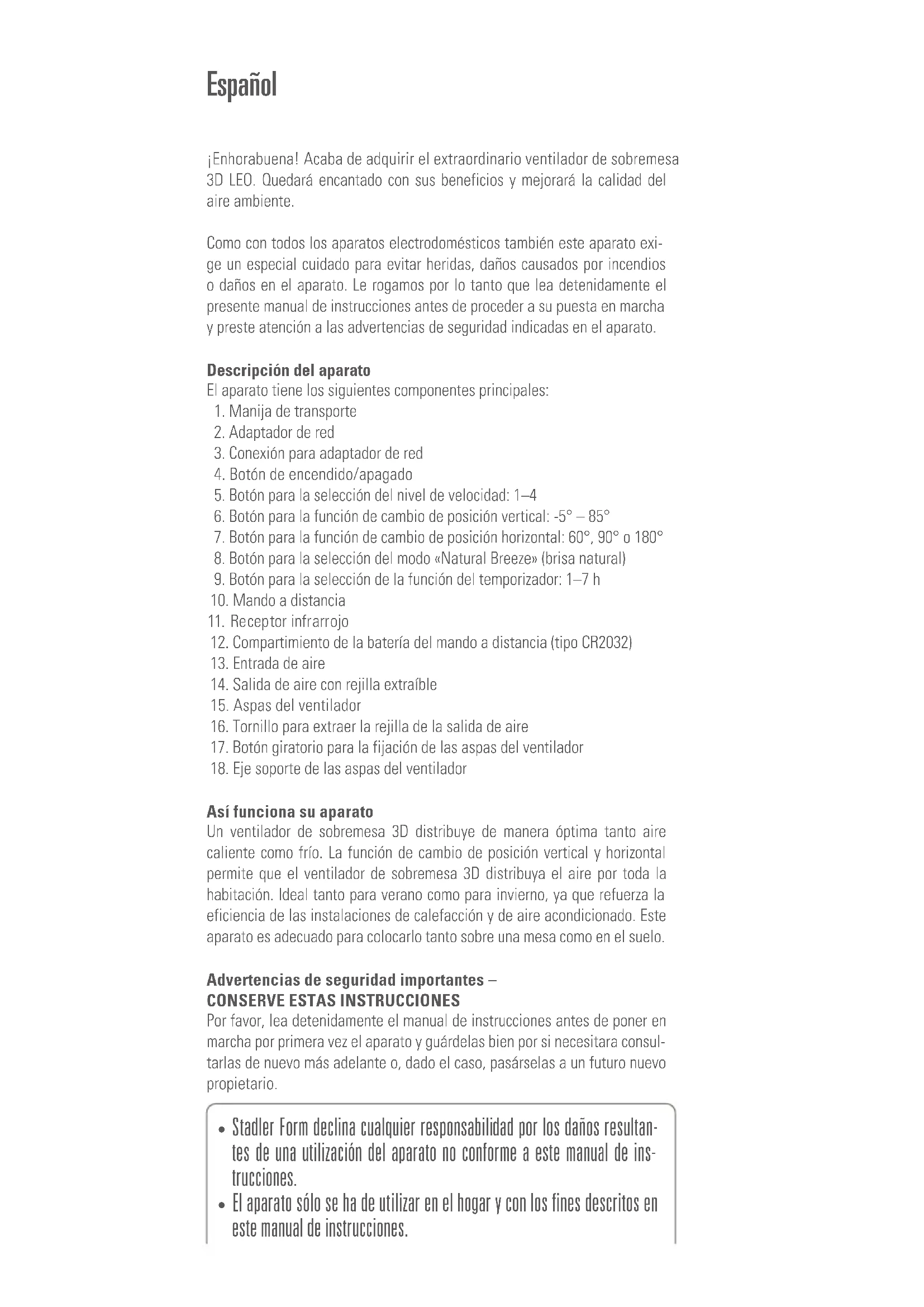 - La mise au rebut incontrôlée des appareils électriques peut entraîner, lors de précipitations, la filtration de matières dangereuses dans les eaux souterraines pouvant contaminer la chaîne alimentaire ou intoxiquer durablement la flore et la faune. Caractéristiques techniques Tension nominale 100–240 V / 50 Hz Puissance nominale 1.5–18 W Dimensions 9.4 x 13.0 x 8.1 inch / 240 x 330 x 205 mm (largeur x hauteur x profondeur) Poids 3.7 lbs / 1.7 kg Niveau de bruit 27–57 dB(A) Conforme à la réglementation cETL Sous réserve de modifications techniques¡Enhorabuena! Acaba de adquirir el extraordinario ventilador de sobremesa 3D LEO. Quedará encantado con sus beneficios y mejorará la calidad del aire ambiente. Como con todos los aparatos electrodomésticos también este aparato exi- ge un especial cuidado para evitar heridas, daños causados por incendios o daños en el aparato. Le rogamos por lo tanto que lea detenidamente el presente manual de instrucciones antes de proceder a su puesta en marcha y preste atención a las advertencias de seguridad indicadas en el aparato. Descripción del aparato El aparato tiene los siguientes componentes principales: