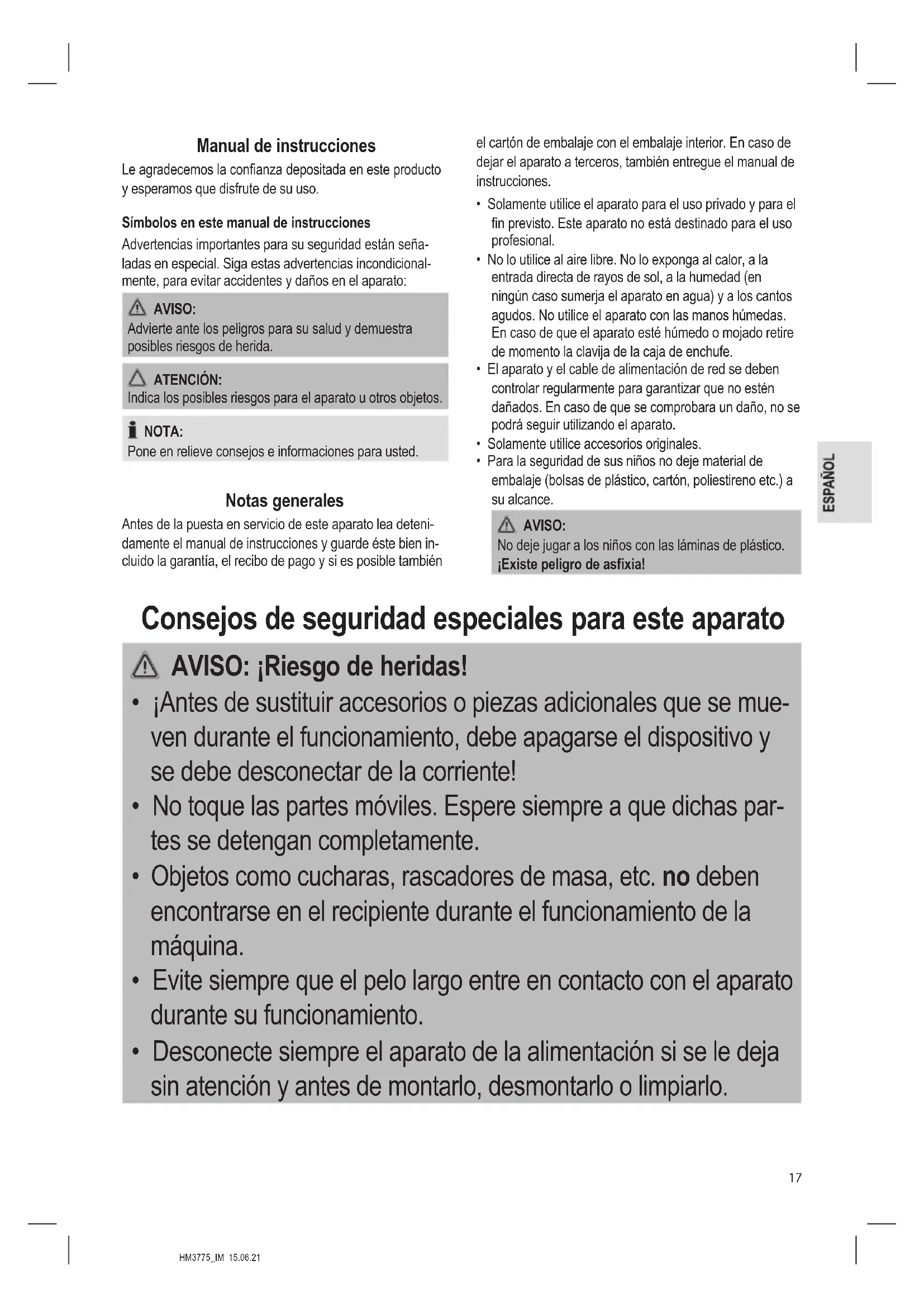 daños, no use el aparato. Devuélvalo de inmediato al vendedor. NOTA: Es posible que queden residuos derivados de la pro- ducción en el aparato. Le recomendamos que limpie el aparato como se describe en “Limpieza”.HM3775_IM 15.06.21