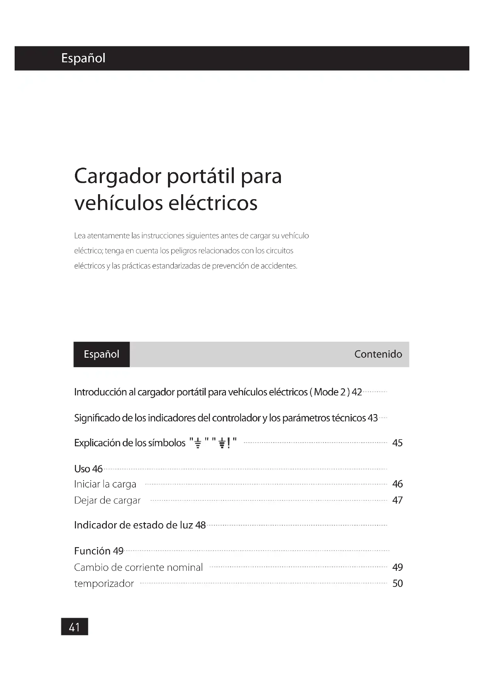 temporizador Uso 46 Función 49 Español Español Cargador portátil para vehículos eléctricos Lea atentamente las instrucciones siguientes antes de cargar su vehículo eléctrico; tenga en cuenta los peligros relacionados con los circuitos eléctricos y las prácticas estandarizadas de prevención de accidentes. ContenidoIntroducción al cargador portátil para vehículos eléctricos ( Mode 2 ) PRECAUCIÓN