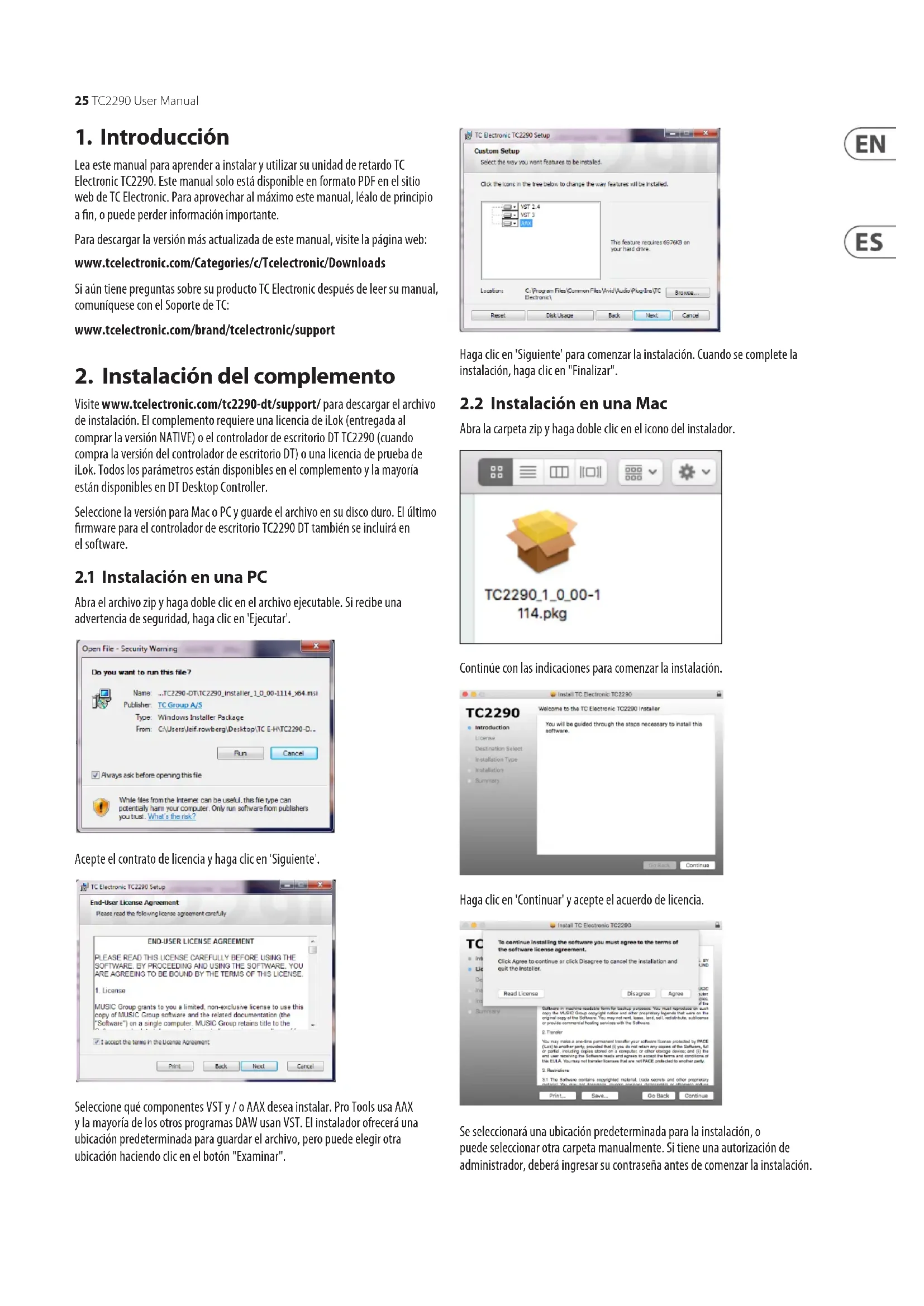 Visite www.tcelectronic.com/tc2290-dt/support/ para descargar el archivo de instalación. El complemento requiere una licencia de iLok (entregada al comprar la versión NATIVE) o el controlador de escritorio DT TC2290 (cuando compra la versión del controlador de escritorio DT) o una licencia de prueba de iLok. Todos los parámetros están disponibles en el complemento y la mayoría están disponibles en DT Desktop Controller. Seleccione la versión para Mac o PC y guarde el archivo en su disco duro. El último rmware para el controlador de escritorio TC2290 DT también se incluirá en el software.