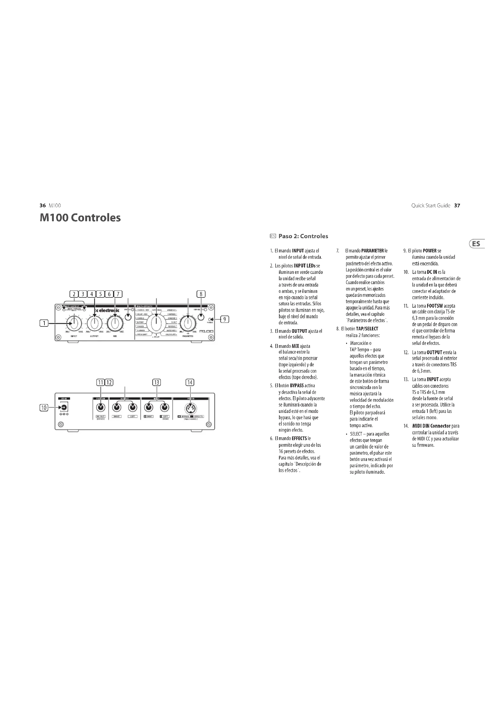controlar la unidad a través de MIDI CC y para actualizar su rmware.38 39Quick Start GuideM100 Efectos Descripción Cathedral Simula la reverberación que se puede escuchar en grandes templos y catedrales. Este efecto se caracteriza por una reverb prolongada y por ecos muy especícos. Da buenos resultados con instrumentos y voces solistas. Concert Simula la reverberación de una sala de conciertos de tamaño medio. Este preset resulta muy útil para instrumentos acústicos reales como un piano. Cuando se utiliza de forma sutil también da un toque interesante a las voces, por ejemplo para las baladas. Club Simula el ambiente acogedor de un teatro o club de jazz de tamaño medio. Esta reverb se caracteriza por sus reexiones iniciales y por su corto decaimiento. Este preset funciona bien con voces, piano eléctrico, batería, saxofón y otros instrumentos. Chamber Simula las características típicas de una cámara o pequeña sala. Este preset resulta perfecto para batería, guitarra y voces o para aquellas situaciones en las que necesite una reverb suave para darle algo de vida a una señal apagada. Gold Plate Simula el legendario sonido de una reverb de lámina de oro como las que se usaron en las primeras reverbs de estudio. Este efecto produce un sonido muy denso por sí solo y es particularmente útil para producir reverbs muy denidas, por ejemplo con batería o voces. Gated Reverb Simula el tipo de reverb que es cortada con un efecto de puerta de ruidos, que se hizo tan famoso en los años 80. Este efecto fue usado habitualmente con los sonidos de bombo y caja, pero puede usarlo para conseguir efectos interesantes también con muchos otros instrumentos. Reverse Reverb Produce una reverb cuya cola de reverberación está al revés. Como consecuencia, el volumen de la reverb no disminuye conforme pasa el tiempo sino que aumenta. Puede usar este preset para efectos extraños con señales de todo tipo. Una aplicación muy popular de este efecto era con el sonido de caja. Ambience Aplica a la señal sensación de espacio físico, pero no produce una reverb audible. Este preset da buenos resultados con batería, teclados, guitarra y voces o en todas aquellas situaciones en las que necesite un efecto espacial sin reverb. Descripción de Los Efectos Delay Produce varios ecos/retardos de la señal de entrada, reduciendo su nivel y añadiéndolos a la señal original (efecto eco). Utilice este preset para crear efectos muy interesantes en términos de ritmo. Puede usar este preset prácticamente con cualquier instrumento, pero resulta especialmente útil con teclados, guitarra y voces. Chorus Añade un toque de calidez a la señal original, haciendo que tenga más cuerpo y amplitud. Puede usar este chorus prácticamente con cualquier señal que quiera que tenga un sonido más completo y amplio. Flanger Hace que la señal tenga un bonito toque “retro”. El anger siempre ha sido un efecto muy popular con la guitarra y los teclados, pero también puede producir sonidos muy interesantes cuando lo use con batería, voz u otras señales. Phaser Este efecto añade una copia de la señal de entrada, pero con la fase modicada. Este efecto es tradicional para la guitarra, piano eléctrico y teclado, pero también puede producir sonidos muy curiosos aplicando este cambio de fase con sonidos como batería u otras señales. Rotary Simula los movimientos de aceleración, freno y giro de un sistema de altavoces Leslie. La rotación rápida produce el característico efecto tremolo. Tradicionalmente, este ha sido un efecto usado con órgano eléctrico, pero también puede usarlo con otras señales. Pitch Shift Este efecto añade otras señal a la original, pero por encima o debajo del tono original. Resulta especialmente útil para intensicar el sonido de guitarras y voces con una suave desanación, pero también puede usarlo para conseguir efectos vocales extremos en películas de dibujos animados o videojuegos. Delay + Reverb Esto es una combinación muy útil de los efectos Delay y Concert, que le ofrecen unos resultados extremadamente buenos con guitarra, teclados y voces. Chorus + Reverb Combina los efectos Chorus y Club para un efecto clásico en guitarras y pianos eléctricos.40 41Quick Start GuideM100 Parámetros FX Efecto Mando PARAMETER Botón TAP / SELECT LED TAP / SELECT Catedral Tiempo de reverberación Brillantez Apagado en Concierto Tiempo de reverberación Brillantez Apagado en Club Tiempo de reverberación Brillantez Apagado en Cámara Tiempo de reverberación Brillantez Apagado en Plato de oro Tiempo de reverberación Brillantez Apagado en Rev cerrado Tiempo de reverberación Brillantez Apagado en Rev inversa Tiempo de reverberación Brillantez Apagado en Ambiente El tamaño de la habitación Brillantez Apagado en Demora Repite Intervalo de tiempo TAP Parpadeando (tempo) Coro Intensidad Tempo TAP Parpadeando (tempo) Flanger Intensidad Tempo TAP Parpadeando (tempo) Phaser Intensidad Tempo TAP Parpadeando (tempo) Giratorio Intensidad Velocidad rotatoria Encendido apagado Cambio de tono Pasos de semitono (+/- 12) Desorientar Apagado en Retraso + Rev Relación de retardo vs reverberación Intervalo de tiempo TAP Parpadeando (tempo) Coro + Rev Relación de coro frente a reverberación Tiempo de reverberación Apagado en Para asegurar que su unidad M100 funcione con las últimas características y mejoras, siga estos pasos para actualizar su rmware. Por favor, lea todo el procedimiento antes de comenzar para garantizar un proceso de actualización sin problemas.