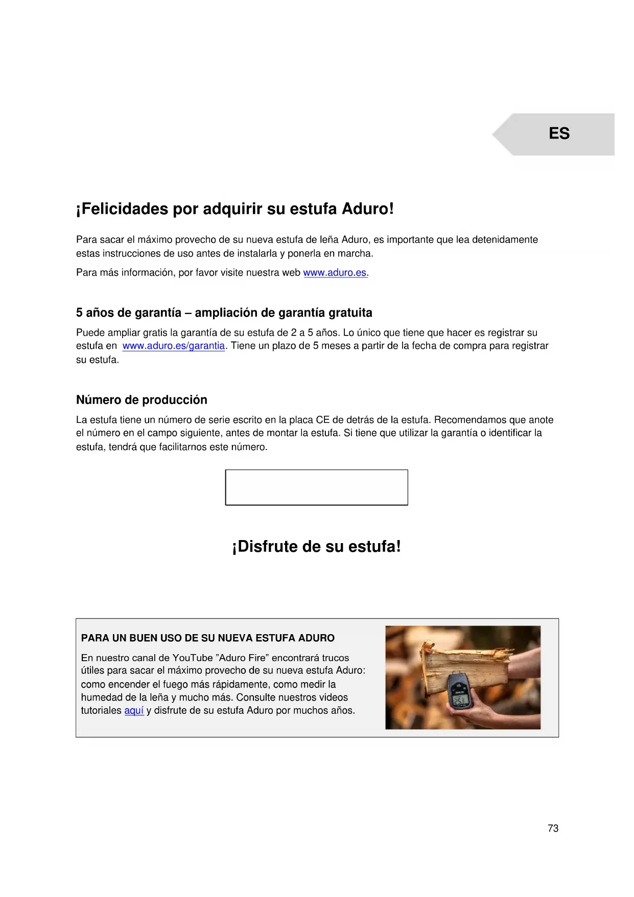 ¡Felicidades por adquirir su estufa Aduro! Para sacar el máximo provecho de su nueva estufa de leña Aduro, es importante que lea detenidamente estas instrucciones de uso antes de instalarla y ponerla en marcha. Para más información, por favor visite nuestra web www.aduro.es. 5 años de garantía – ampliación de garantía gratuita Puede ampliar gratis la garantía de su estufa de 2 a 5 años. Lo único que tiene que hacer es registrar su estufa en www.aduro.es/garantia. Tiene un plazo de 5 meses a partir de la fecha de compra para registrar su estufa. Número de producción La estufa tiene un número de serie escrito en la placa CE de detrás de la estufa. Recomendamos que anote el número en el campo siguiente, antes de montar la estufa. Si tiene que utilizar la garantía o identificar la estufa, tendrá que facilitarnos este número.