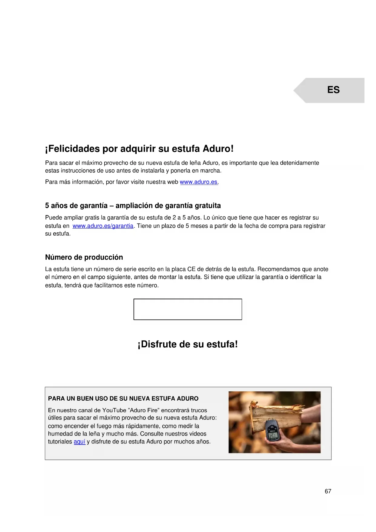 ¡Felicidades por adquirir su estufa Aduro! Para sacar el máximo provecho de su nueva estufa de leña Aduro, es importante que lea detenidamente estas instrucciones de uso antes de instalarla y ponerla en marcha. Para más información, por favor visite nuestra web www.aduro.es. 5 años de garantía – ampliación de garantía gratuita Puede ampliar gratis la garantía de su estufa de 2 a 5 años. Lo único que tiene que hacer es registrar su estufa en www.aduro.es/garantia. Tiene un plazo de 5 meses a partir de la fecha de compra para registrar su estufa. Número de producción La estufa tiene un número de serie escrito en la placa CE de detrás de la estufa. Recomendamos que anote el número en el campo siguiente, antes de montar la estufa. Si tiene que utilizar la garantía o identificar la estufa, tendrá que facilitarnos este número.