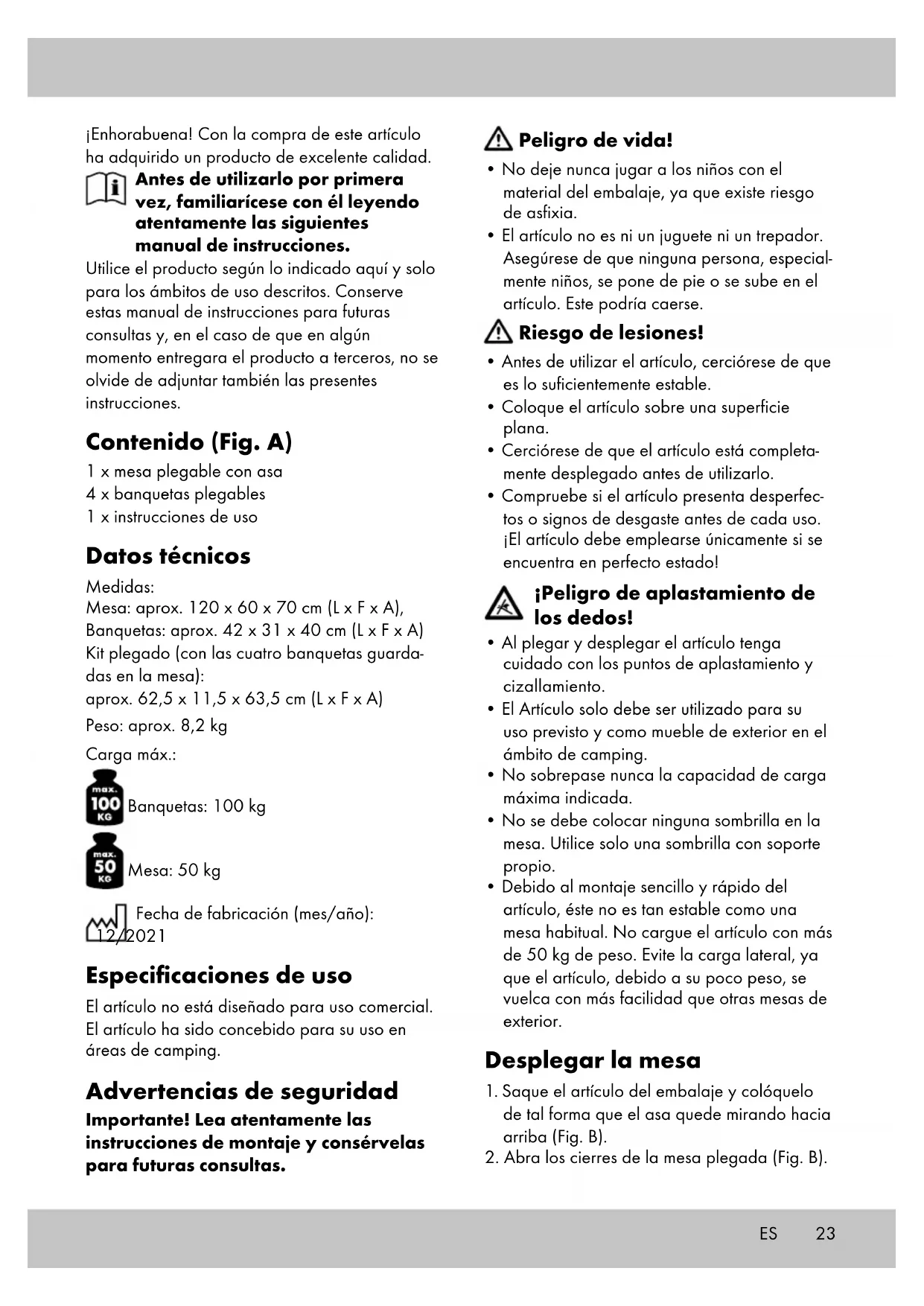 los cierres adhesivos. Fijar la altura de la mesa La altura de la mesa puede fijarse en tres posi- ciones. Encaje los botones de las cuatro patas de la mesa a la misma altura (Fig. G). Banquetas Saque las banquetas del embalaje y desplié- guelas (Fig. E). Almacenamiento y cuidados El artículo debe guardarse siempre seco y limpio en un lugar a temperatura templada. Limpiar únicamente con agua y secar a continuación con un paño. ¡IMPORTANTE! No usar productos de limpieza agresivos bajo ninguna circunstancia.25ES Las demandas derivadas de la garantía sólo podrán presentarse dentro del periodo de garantía exhibiendo el comprobante de compra original. Le rogamos, por ello, que conserve el comprobante de compra original. El periodo de garantía no se verá prolongado por ningún tipo de reparación realizada con motivo de la ga- rantía, la garantía legal o como gesto de buena voluntad. Esto se aplica también a las piezas sustituidas o reparadas. Por favor, dirija sus quejas primero a la línea telefónica del servicio de atención al cliente que se indica a continuación o póngase en contacto con nosotros por correo electrónico. Si el caso está cubierto por la garantía, a nuestra elección, repararemos o cambiaremos gratuitamente el artículo o le restituiremos el precio de compra del mismo. De la garantía no se derivan otros derechos. Esta garantía no limitará sus derechos legales, especialmente los derechos de garantía frente al vendedor correspondiente. IAN: 384610_2107 Servicio España Tel.: 900 984 989 E-Mail: deltasport@lidl.es26 Tillykke! Med dit køb har du valgt et kvalitetspro- dukt. Gør dig fortrolig med produktet inden den første ibrugtagning. Læs i denne forbindelse opmærk- som den efterfølgende brugsvej- ledning. Brug kun produktet som beskrevet og til de oplyste formål. Gem denne vejledning godt. Hvis du giver produktet videre til tredje, giv ligeledes alle bilag med. Leverancen omfatter (fig. A) 1 x bord, sammenklappeligt med bærehåndtag 4 x skamler, sammenklappelige 1 x brugervejledning Tekniske data Mål: Bord: ca. 120 x 60 x 70 cm (L x B x H) Skammel: ca. 42 x 31 x 40 cm (L x B x H) sammenklappeligt sæt (fire skamler i bordet): ca. 62,5 x 11,5 x 63,5 cm (L x B x H) Vægt: ca. 8,2 kg Maks. bæreevne: Skammel: 100 kg Bord: 50 kg Fremstillingsdato (måned/år): 12/2021 Formålsbestemt anvendelse Produktet er ikke beregnet til erhvervsmæssig brug. Produktet er udviklet for campingbrug. Sikkerhedsinstruktioner Vigtigt! Læs venligst monteringsvej- ledningen omhyggeligt igennem og opbevar den til senere brug! Livsfare!