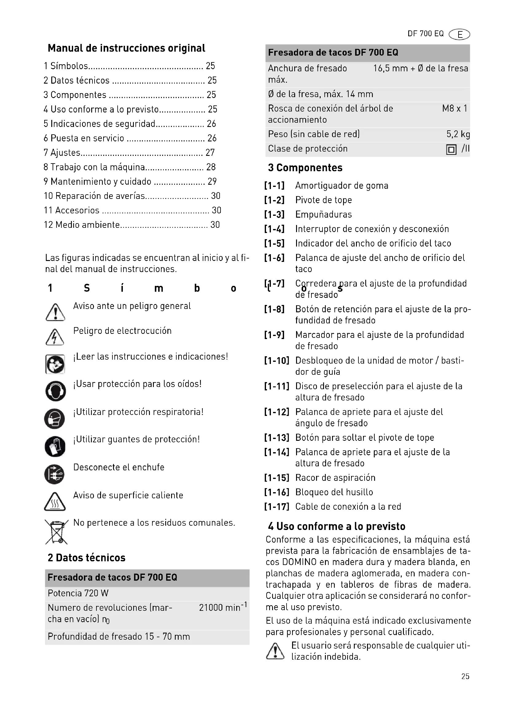 - Manual de instrucciones original Las figuras indicadas se encuentran al inicio y al fi- nal del manual de instrucciones. 1Símbolos 2 Datos técnicos 3 Componentes 4 Uso conforme a lo previsto Conforme a las especificaciones, la máquina está prevista para la fabricación de ensamblajes de ta- cos DOMINO en madera dura y madera blanda, en planchas de madera aglomerada, en madera con- trachapada y en tableros de fibras de madera. Cualquier otra aplicación se considerará no confor- me al uso previsto. El uso de la máquina está indicado exclusivamente para profesionales y personal cualificado. El usuario será responsable de cualquier uti- lización indebida. 1 Símbolos p. 25