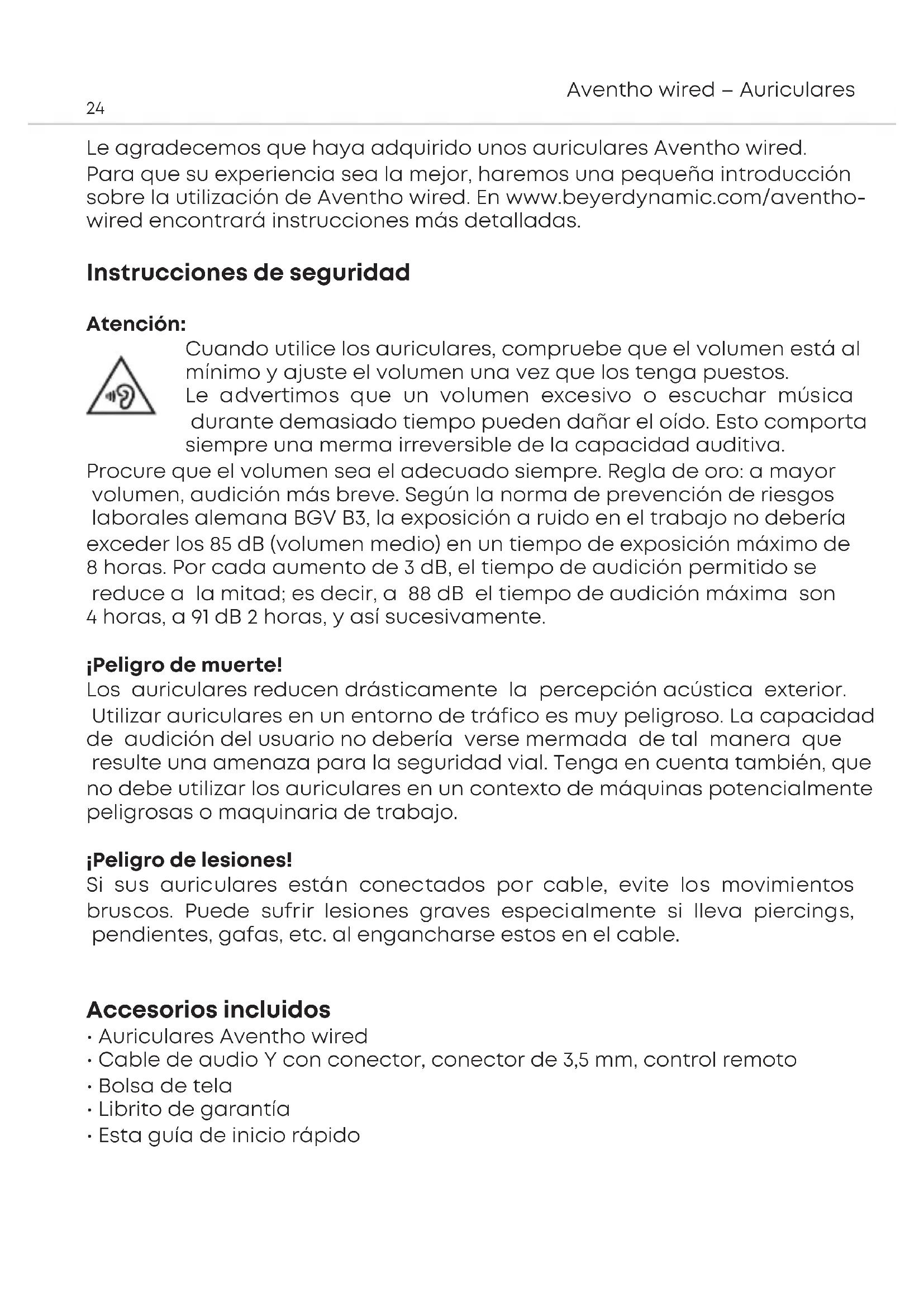 Le agradecemos que haya adquirido unos auriculares Aventho wired. Para que su experiencia sea la mejor, haremos una pequeña introducción sobre la utilización de Aventho wired. En www.beyerdynamic.com/aventho- wired encontrará inrucciones más detalladas. Inrucciones de seguridad Atención: Cuando utilice los auriculares, compruebe que el volumen eá al mínimo y ajue el volumen una vez que los tenga pueos. Le adveimos que un volumen excesivo o escuchar música durante demasiado tiempo pueden dañar el oído. Eo compoa siempre una merma irreversible de la capacidad auditiva. Procure que el volumen sea el adecuado siempre. Regla de oro: a mayor volumen, audición más breve. Según la norma de prevención de riesgos laborales alemana BGV B3, la exposición a ruido en el trabajo no debería exceder los 85 dB (volumen medio) en un tiempo de exposición máximo de 8 horas. Por cada aumento de 3 dB, el tiempo de audición permitido se reduce a la mitad; es decir, a 88 dB el tiempo de audición máxima son 4 horas, a 91 dB 2 horas, y así sucesivamente. ¡Peligro de muee! Los auriculares reducen dráicamente la percepción acúica exterior. Utilizar auriculares en un entorno de tráfico es muy peligroso. La capacidad de audición del usuario no debería verse mermada de tal manera que resulte una amenaza para la seguridad vial. Tenga en cuenta también, que no debe utilizar los auriculares en un contexto de máquinas potencialmente peligrosas o maquinaria de trabajo. ¡Peligro de lesiones! Si sus auriculares eán conectados por cable, evite los movimientos bruscos. Puede sufrir lesiones graves especialmente si lleva piercings, pendientes, gafas, etc. al engancharse eos en el cable. Accesorios incluidos