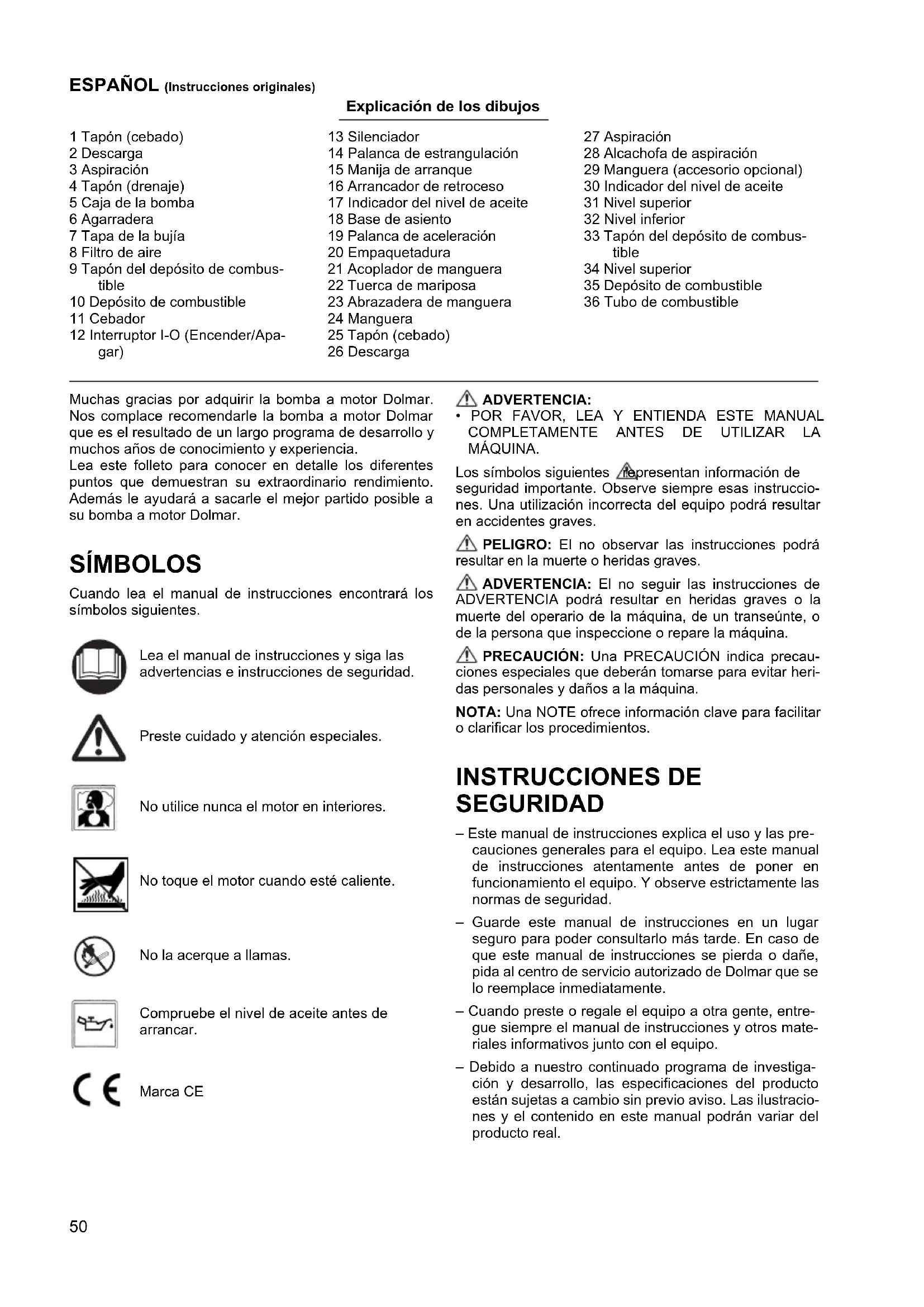 MÁQUINA. Los símbolos siguientes representan información de seguridad importante. Observe siempre esas instruccio- nes. Una utilización incorrecta del equipo podrá resultar en accidentes graves. PELIGRO: El no observar las instrucciones podrá resultar en la muerte o heridas graves. ADVERTENCIA: El no seguir las instrucciones de ADVERTENCIA podrá resultar en heridas graves o la muerte del operario de la máquina, de un transeúnte, o de la persona que inspeccione o repare la máquina. PRECAUCIÓN: Una PRECAUCIÓN indica precau- ciones especiales que deberán tomarse para evitar heri- das personales y daños a la máquina. NOTA: Una NOTE ofrece información clave para facilitar o clarificar los procedimientos. INSTRUCCIONES DE SEGURIDAD – Este manual de instrucciones explica el uso y las pre- cauciones generales para el equipo. Lea este manual de instrucciones atentamente antes de poner en funcionamiento el equipo. Y observe estrictamente las normas de seguridad. – Guarde este manual de instrucciones en un lugar seguro para poder consultarlo más tarde. En caso de que este manual de instrucciones se pierda o dañe, pida al centro de servicio autorizado de Dolmar que se lo reemplace inmediatamente. – Cuando preste o regale el equipo a otra gente, entre- gue siempre el manual de instrucciones y otros mate- riales informativos junto con el equipo. – Debido a nuestro continuado programa de investiga- ción y desarrollo, las especificaciones del producto están sujetas a cambio sin previo aviso. Las ilustracio- nes y el contenido en este manual podrán variar del producto real. Lea el manual de instrucciones y siga las advertencias e instrucciones de seguridad. Preste cuidado y atención especiales. No utilice nunca el motor en interiores. No toque el motor cuando esté caliente. No la acerque a llamas. Compruebe el nivel de aceite antes de arrancar. Marca CE51 – Si necesita asistencia para obtener más detalles, pre- gunte al distribuidor o centro de servicio autorizado de Dolmar local. Uso previsto para la máquina Este equipo ha sido previsto solamente para regar e irri- gar con agua. Este equipo se debe utilizar para bombear solamente agua clara. PELIGRO: