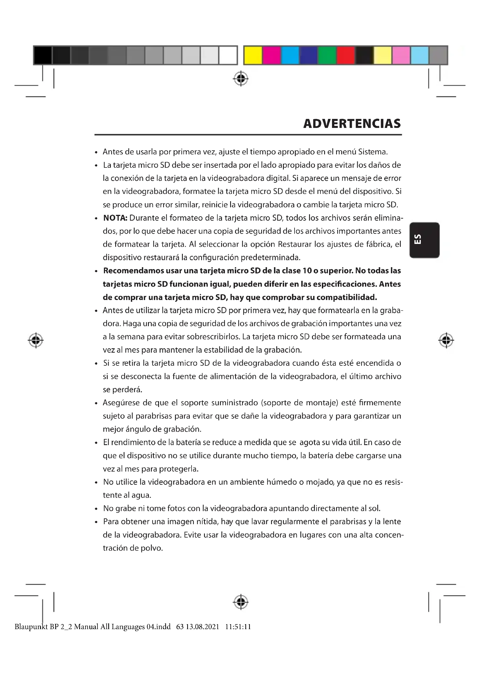 Modo de disparo continuo Apagado / Encendido Apagado Calidad Buena / Estándar / Económica Buena Nitidez Alta/Estándar/Baja Estándar Balance de blancos Automático / Luz del día / Día nublado / Bombilla de tungsteno / Lámpara uorescente Automático Color Color / Blanco y negro / Sepia Color ISO Automático / 100 / 200 / 400 Automático Exposición +3 – -3 0 Estabilización de la imagen Apagado / Encendido Apagado Vista previa rápida Apag./2 s/5 s Apagado Marcador de fecha Apagado / Encendido Encendido Blaupunkt BP 2_2 Manual All Languages 04.indd 74 13.08.2021 11:51:13MENÚ SISTEMA MENÚ MODO CATEGORÍA SUBCATEGORÍA POR DEFECTO REPRO- DUCCIÓN Eliminar ¿Borrar el archivo selecciona- do? / ¿Borrar todo? Protección Bloquear el archivo seleccionado / Desbloquear el archivo seleccionado / Bloquear todos los archivos / Desbloquear todos los archivos MENÚ SISTEMA Apagado de la pantalla Apagado / 30 s / 1 min. / 2 min. Apagado Apagado automático Apagado / 3 min. / 5 min. / 10 min. Apagado Señal de sonido Apagado / Encendido Encendido Idioma English / Francais / Deutsch / Italiano / Español / Polski English Frecuencia 50 Hz / 60 Hz 50 HZ Fecha / hora DD/MM/AAAA,