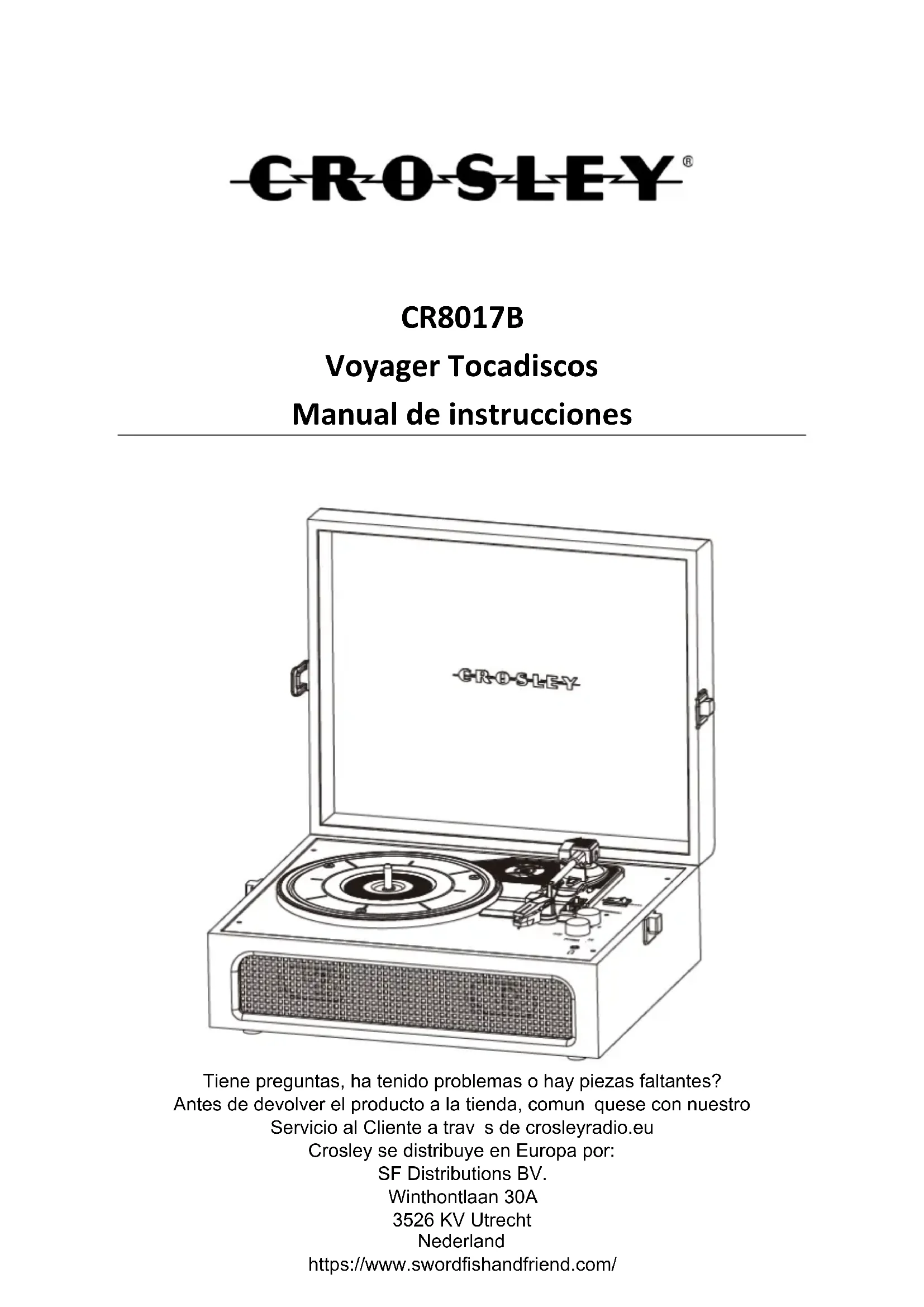 Declaraciones de la FCC Este dispositivo cumple con la Sección 15 de las reglas de la Comisión Federal de Comunicaciones (FCC). El uso de este equipo está sujeto a las dos condiciones siguientes: (1) Este dispositivo no causa interferencia perjudicial y (2) este dispositivo debe aceptar cualquier interferencia recibida, incluso interferencia que pueda causar un funcionamiento no deseado. Nota: Este equipo se verificó y se comprobó que cumple con los límites para un dispositivo digital clase B, conforme a la Sección 15 de las reglas de la Comisión Federal de Comunicaciones (FCC). Estos límites están diseñados para brindar una protección razonable frente a interferencia perjudicial en un establecimiento residencial. Este equipo genera, usa y puede irradiar energía de radiofrecuencia y, si no se instala y utiliza siguiendo las instrucciones, puede causar interferencia perjudicial a las radiocomunicaciones. Sin embargo, no existe garantía de que la interferencia no ocurrirá en una instalación en particular. Si este equipo causa interferencia perjudicial a las radiocomunicaciones o a la recepción televisiva, lo que se puede determinar al encender y apagar el equipo, se recomienda que el usuario intente corregir la interferencia mediante una o más de las siguientes medidas: − Reorientar o reubicar la antena de recepción. − Aumentar la separación entre el equipo y el receptor. − Conectar el equipo a una toma en un circuito diferente del circuito en el que está conectado el receptor. − Consultar al proveedor o a un técnico con experiencia en radio/TV para obtener ayuda. Nota: El Beneficiario no es responsable de cualquier cambio o modificación que no tenga la aprobación expresa de la parte responsable del cumplimiento. Estas modificaciones podrían anular la autoridad del usuario para operar el equipo. El dispositivo ha sido evaluado para cumplir con el requisito general de exposición a RF. Para mantener el cumplimiento de las pautas de exposición a RF de la FCC, la distancia debe ser de al menos 20 cm entre el radiador y su cuerpo, y debe estar totalmente soportada por las configuraciones de instalación y operación del transmisor y su(s) antena(s). DECLARACIÓN DE CONFORMIDAD SIMPLIFICADA DE EU Por la presente, Modern Marketing Concepts Inc., que opera bajo la denominación comercial de Crosley Brands, declara que el tipo de equipo de radio cumple con la Directiva 2014/53/UE. El texto completo de la declaración de conformidad de la UE está disponible en la siguiente dirección de Internet: http://crosleybrands.com/euDoCCR8017B Platine tourne-disque Voyager Manuel d’utilisation Questions, problemes, pieces manquantes? Avant de retourner au magasin, appelez le service client sur www.crosleyradio.eu, service@crosleyradio.eu ou +31 (0) 306622470. Crosley est distribu en Europe par: SF Distributions BV. Winthontlaan 30A 3526 KV Utrecht les Pays-Bas www.swordfishandfriend.comFrançais
