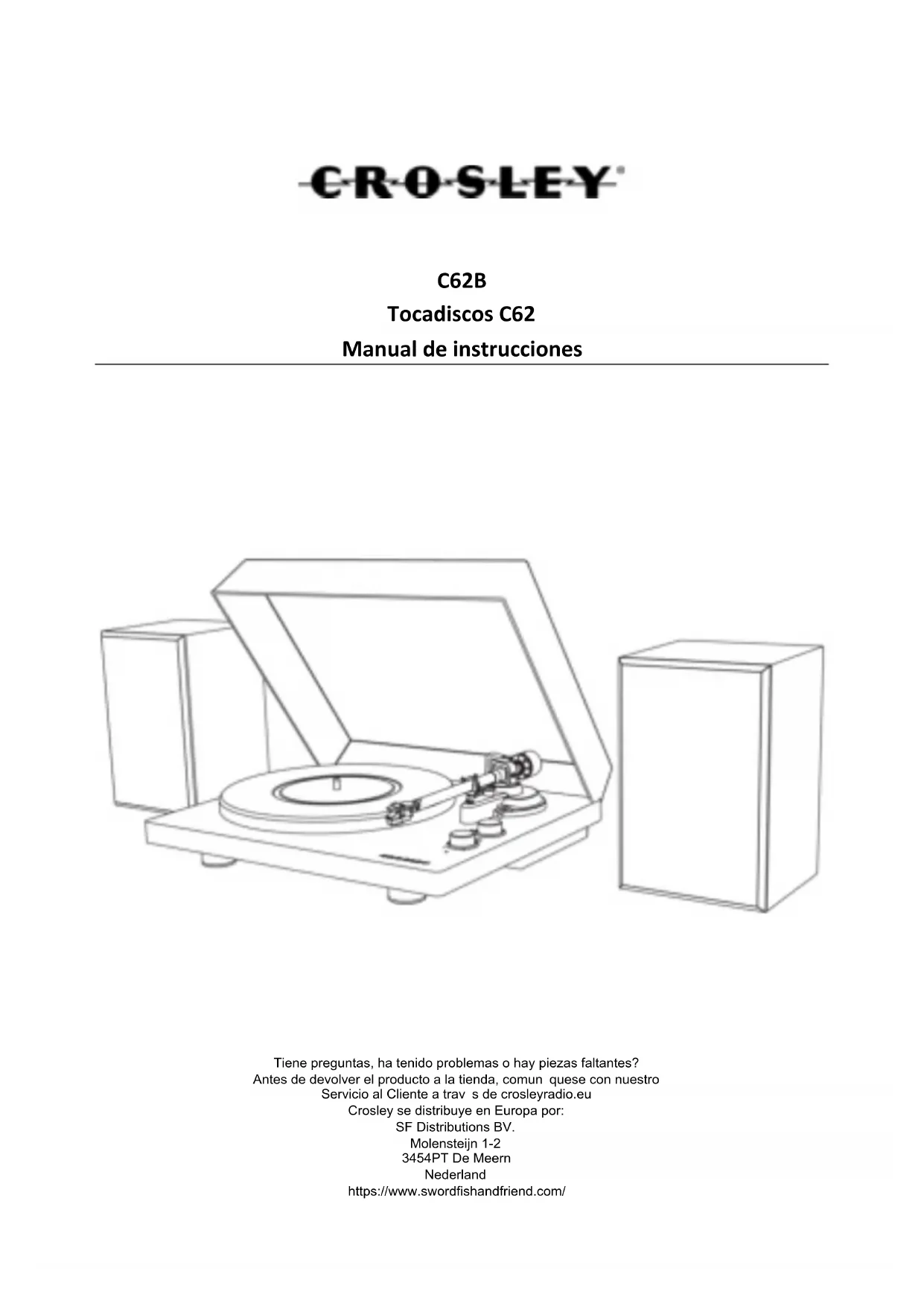 - El cable no está conectado a tierra correctamente. Declaraciones de la FCC Este dispositivo cumple con la Sección 15 de las reglas de la Comisión Federal de Comunicaciones (FCC). El uso de este equipo está sujeto a las dos condiciones siguientes: (1) Este dispositivo no causa interferencia perjudicial y (2) este dispositivo debe aceptar cualquier interferencia recibida, incluso interferencia que pueda causar un funcionamiento no deseado. Nota: Este equipo se verificó y se comprobó que cumple con los límites para un dispositivo digital clase B, conforme a la Sección 15 de las reglas de la Comisión Federal de Comunicaciones (FCC). Estos límites están diseñados para brindar una protección razonable frente a interferencia perjudicial en un establecimiento residencial. Este equipo genera, usa y puede irradiar energía de radiofrecuencia y, si no se instala y utiliza siguiendo las instrucciones, puede causar interferencia perjudicial a las radiocomunicaciones. Sin embargo, no existe garantía de que la interferencia no ocurrirá en una instalación en particular. Si este equipo causa interferencia perjudicial a las radiocomunicaciones o a la recepción televisiva, lo que se puede determinar al encender y apagar el equipo, se recomienda que el usuario intente corregir la interferencia mediante una o más de las siguientes medidas: − Reorientar o reubicar la antena de recepción. − Aumentar la separación entre el equipo y el receptor. − Conectar el equipo a una toma en un circuito diferente del circuito en el que está conectado el receptor. − Consultar al proveedor o a un técnico con experiencia en radio/TV para obtener ayuda. Nota: El Beneficiario no es responsable de cualquier cambio o modificación que no tenga la aprobación expresa de la parte responsable del cumplimiento. Estas modificaciones podrían anular la autoridad del usuario para operar el equipo. El dispositivo ha sido evaluado para cumplir con el requisito general de exposición a RF. Para mantener el cumplimiento de las pautas de exposición a RF de la FCC, la distancia debe ser de al menos 20 cm entre el radiador y su cuerpo, y debe estar totalmente soportada por las configuraciones de instalación y operación del transmisor y su(s) antena(s). DECLARACIÓN DE CONFORMIDAD SIMPLIFICADA DE EU Por la presente, Modern Marketing Concepts Inc., que opera bajo la denominación comercial de Crosley Brands, declara que el tipo de equipo de radio cumple con la Directiva 2014/53/UE. El texto completo de la declaración de conformidad de la UE está disponible en la siguiente dirección de Internet: http://crosleybrands.com/euDoCC62B Tourne-disque C62 Manuel d’utilisation Questions, probl mes, pi ces manquantes? Avant de retourner au magasin, appelez le service client sur www.crosleyradio.eu, service@crosleyradio.eu ou +31 (0) 306622470. Crosley est distribu en Europe par: SF Distributions BV. Molensteijn 1-2 3454PT De Meern les Pays-Bas www.swordfishandfriend.comFrançais
