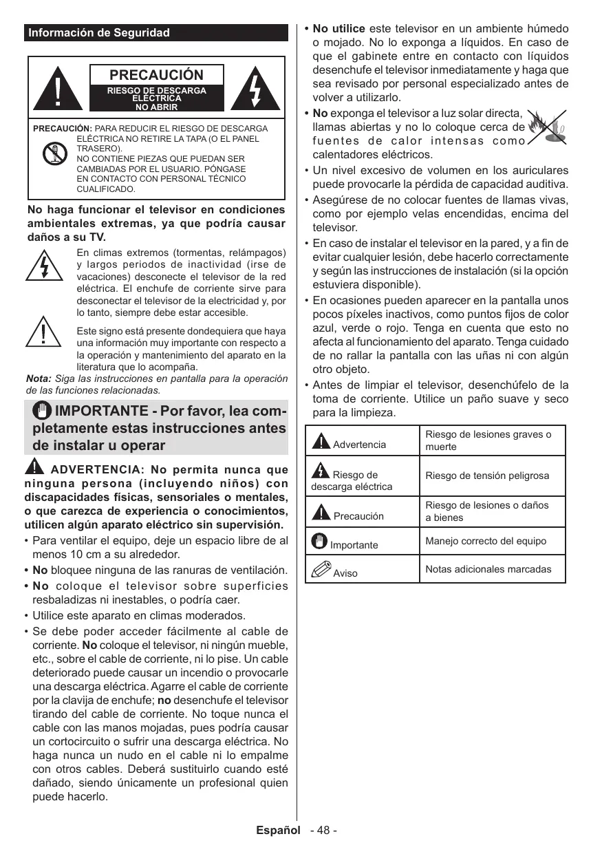 • No exponga el televisor a luz solar directa, llamas abiertas y no lo coloque cerca de fuentes de calor intensas como calentadores eléctricos. • Un nivel excesivo de volumen en los auriculares puede provocarle la pérdida de capacidad auditiva. • Asegúrese de no colocar fuentes de llamas vivas, como por ejemplo velas encendidas, encima del televisor. • En caso de instalar el televisor en la pared, y a fin de evitar cualquier lesión, debe hacerlo correctamente y según las instrucciones de instalación (si la opción estuviera disponible). • En ocasiones pueden aparecer en la pantalla unos pocos píxeles inactivos, como puntos fijos de color azul, verde o rojo. Tenga en cuenta que esto no afecta al funcionamiento del aparato. Tenga cuidado de no rallar la pantalla con las uñas ni con algún otro objeto. • Antes de limpiar el televisor, desenchúfelo de la toma de corriente. Utilice un paño suave y seco para la limpieza. Advertencia Riesgo de descarga eléctrica Precaución Importante Aviso