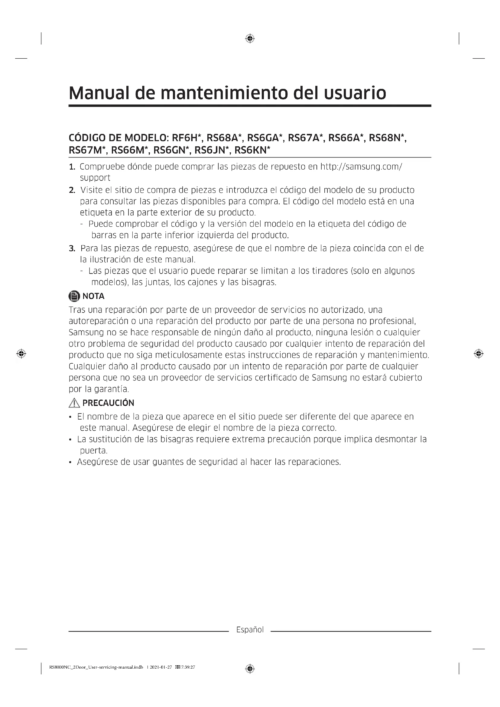 la ilustración de este manual. - Las piezas que el usuario puede reparar se limitan a los tiradores (solo en algunos modelos), las juntas, los cajones y las bisagras. NOTA Tras una reparación por parte de un proveedor de servicios no autorizado, una autoreparación o una reparación del producto por parte de una persona no profesional, Samsung no se hace responsable de ningún daño al producto, ninguna lesión o cualquier otro problema de seguridad del producto causado por cualquier intento de reparación del producto que no siga meticulosamente estas instrucciones de reparación y mantenimiento. Cualquier daño al producto causado por un intento de reparación por parte de cualquier persona que no sea un proveedor de servicios certicado de Samsung no estará cubierto por la garantía. PRECAUCIÓN