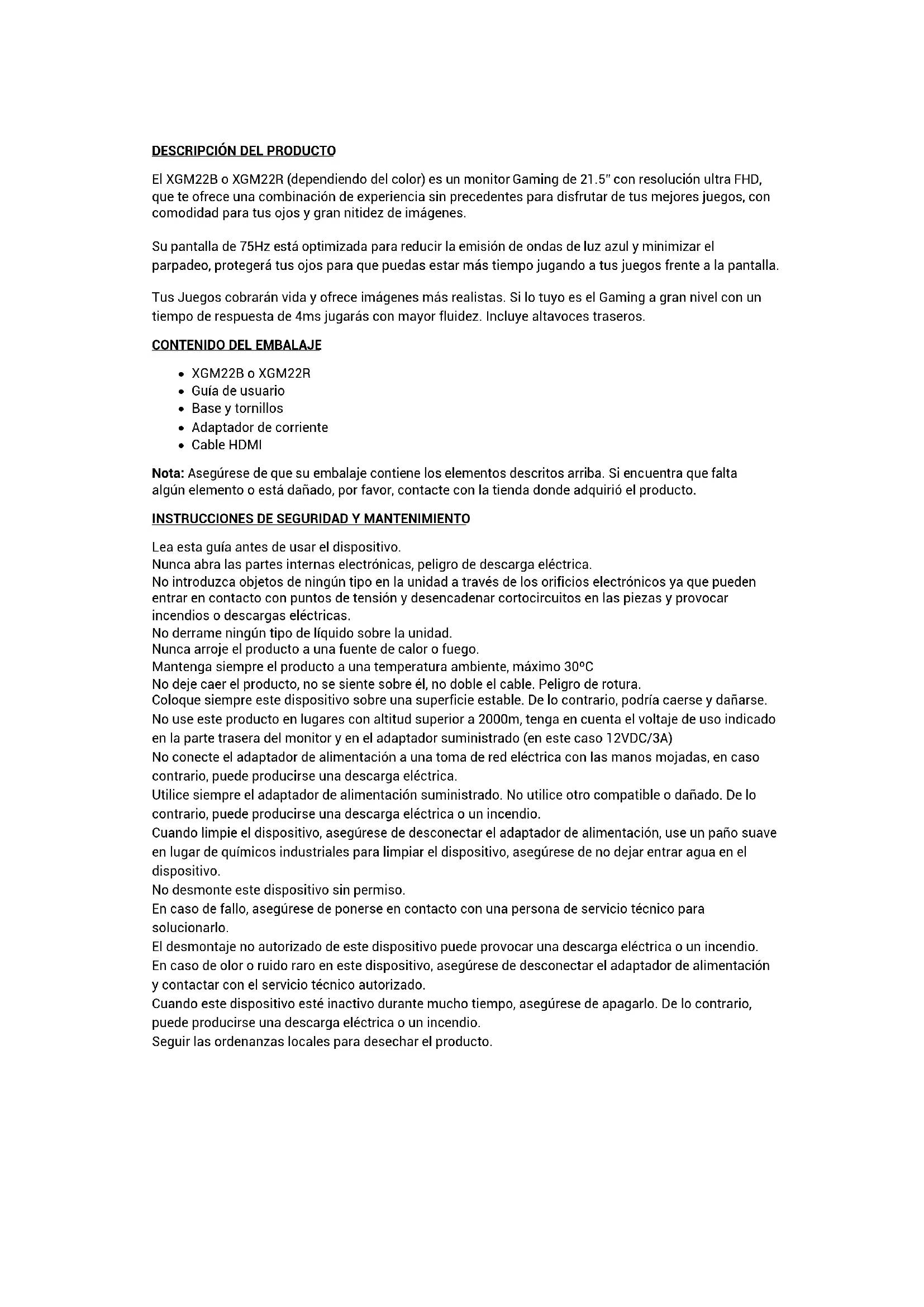 El XGM22B o XGM22R (dependiendo del color) es un monitor Gaming de 21.5” con resolución ultra FHD, que te ofrece una combinación de experiencia sin precedentes para disfrutar de tus mejores juegos, con comodidad para tus ojos y gran nitidez de imágenes. Su pantalla de 75Hz está optimizada para reducir la emisión de ondas de luz azul y minimizar el parpadeo, protegerá tus ojos para que puedas estar más tiempo jugando a tus juegos frente a la pantalla. Tus Juegos cobrarán vida y ofrece imágenes más realistas. Si lo tuyo es el Gaming a gran nivel con un tiempo de respuesta de 4ms jugarás con mayor fluidez. Incluye altavoces traseros.