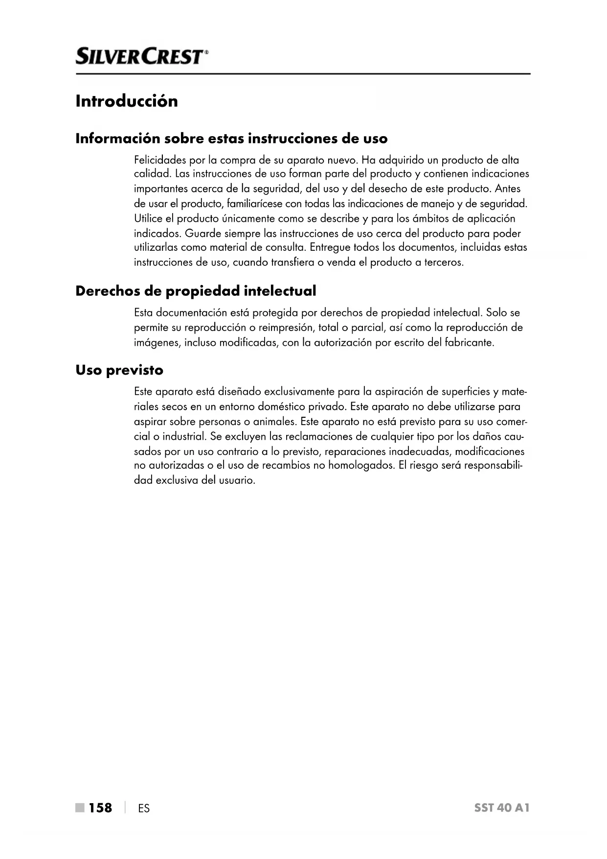 ES SST 40 A1 Introducción Información sobre estas instrucciones de uso Felicidades por la compra de su aparato nuevo. Ha adquirido un producto de alta calidad. Las instrucciones de uso forman parte del producto y contienen indicaciones importantes acerca de la seguridad, del uso y del desecho de este producto. Antes de usar el producto, familiarícese con todas las indicaciones de manejo y de seguridad. Utilice el producto únicamente como se describe y para los ámbitos de aplicación indicados. Guarde siempre las instrucciones de uso cerca del producto para poder utilizarlas como material de consulta. Entregue todos los documentos, incluidas estas instrucciones de uso, cuando transfiera o venda el producto a terceros. Derechos de propiedad intelectual Esta documentación está protegida por derechos de propiedad intelectual. Solo se permite su reproducción o reimpresión, total o parcial, así como la reproducción de imágenes, incluso modificadas, con la autorización por escrito del fabricante. Uso previsto Este aparato está diseñado exclusivamente para la aspiración de superficies y mate- riales secos en un entorno doméstico privado. Este aparato no debe utilizarse para aspirar sobre personas o animales. Este aparato no está previsto para su uso comer- cial o industrial. Se excluyen las reclamaciones de cualquier tipo por los daños cau- sados por un uso contrario a lo previsto, reparaciones inadecuadas, modificaciones no autorizadas o el uso de recambios no homologados. El riesgo será responsabili- dad exclusiva del usuario. IB_329834_SST40A1_LB8.indb 158 24.09.2021 08:42:29ES