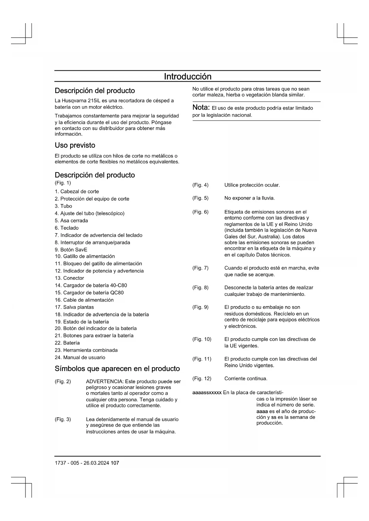 - Apéndice 106 1737 - 005 - 26.03.2024Introducción Descripción del producto La Husqvarna 215iL es una recortadora de césped a batería con un motor eléctrico. Trabajamos constantemente para mejorar la seguridad y la eficiencia durante el uso del producto. Póngase en contacto con su distribuidor para obtener más información. Uso previsto El producto se utiliza con hilos de corte no metálicos o elementos de corte flexibles no metálicos equivalentes. No utilice el producto para otras tareas que no sean cortar maleza, hierba o vegetación blanda similar. Nota: El uso de este producto podría estar limitado por la legislación nacional. Descripción del producto (Fig. 1) p. 454