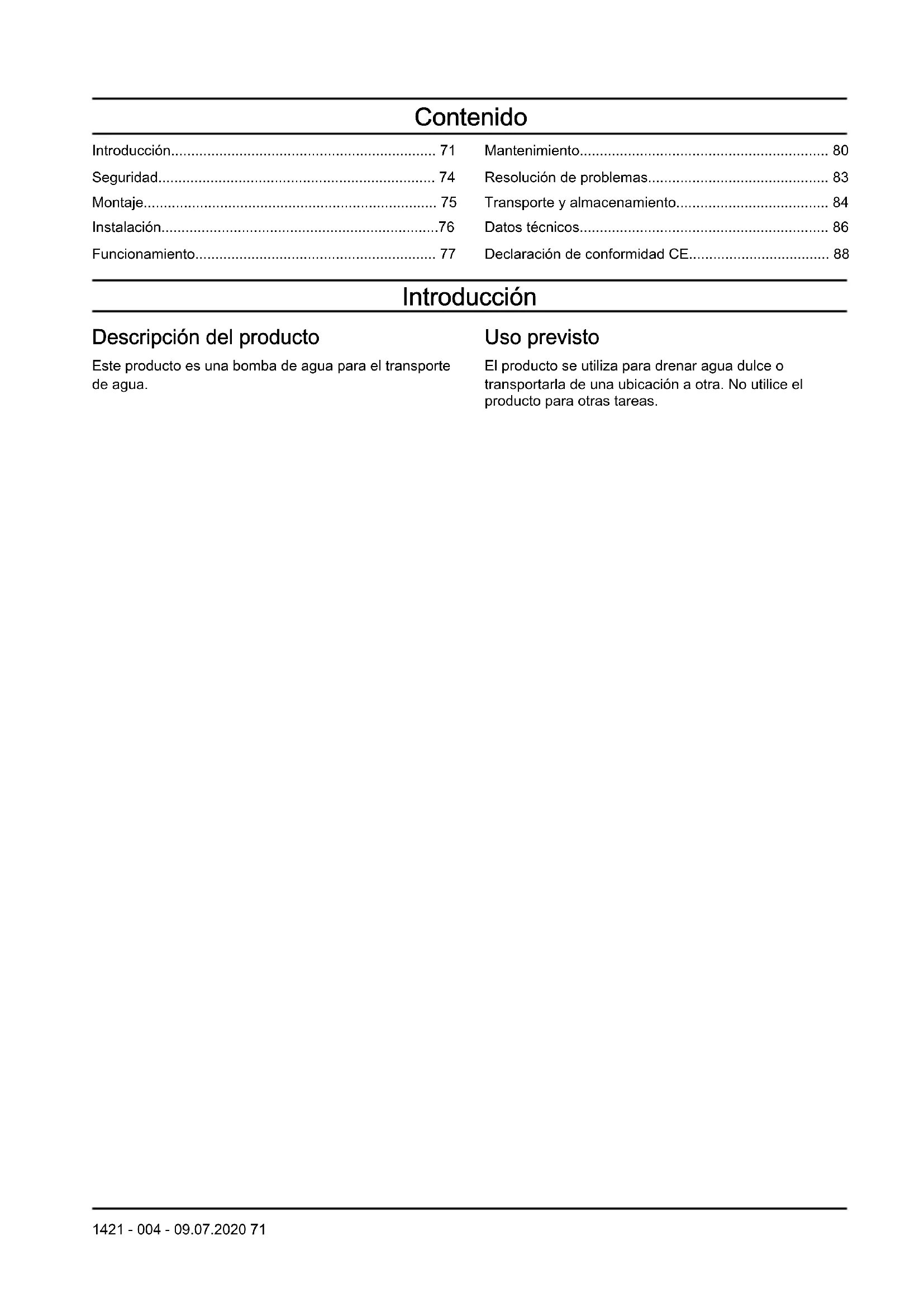 - Declaración de conformidad CE Introducción Descripción del producto Este producto es una bomba de agua para el transporte de agua. Uso previsto El producto se utiliza para drenar agua dulce o transportarla de una ubicación a otra. No utilice el producto para otras tareas. 1421 - 004 - 09.07.2020 71Descripción del producto p. 88