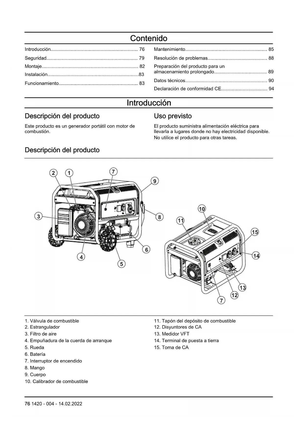 1420 - 004 - 14.02.2022 77Símbolos que aparecen en el producto ADVERTENCIA: Tenga cuidado y utilice el producto correctamente. Este producto puede ocasionar lesiones graves o mortales tanto al operador como a cualquier otra persona. Lea atentamente el manual de usuario y asegúrese de que entiende las instrucciones antes de utilizar este producto. Riesgo de incendio o explosión. Riesgo de intoxicación por monóxido de carbono. No utilice el producto en zonas con un flujo de aire insuficiente. Riesgo de descarga eléctrica. Riesgo de lesiones por quemaduras. Añadir aceite. Añadir combustible. Abra el paso de combustible. Poner el interruptor de encendido en la posición ON (encendido). Poner el estrangulador en la posición OFF (apagado). Poner el estrangulador en la posición ON (encendido). Tire de la empuñadura de la cuerda de arranque. Conectar las cargas eléctricas. Desconectar las cargas eléctricas. Cierre el paso de combustible. Emisiones sonoras al medio ambiente conformes con la directiva europea 2000/14/CE y con la regulación de 2017 sobre de protección del medio ambiente (control de ruidos) (Protection of the Environment Operations - Noise Control) de la legislación de Nueva Gales del Sur. Los datos sobre las emisiones sonoras se pueden encontrar en la etiqueta de la máquina y en el capítulo Datos técnicos. No utilizar el producto en interiores. Utilizar el producto en ex- teriores. Mantener el pro- ducto alejado de venta- nas, puertas o salidas de aire. Poner el estrangulador en la posición ON (encendi- do) y esperar 50 segun- dos. Poner el estrangulador en la posición OFF (apagado) y esperar 50 segundos. Esperar 30 segundos y poner el interruptor de en- cendido en la posición OFF (apagado). 78 1420 - 004 - 14.02.2022Placa de identificación