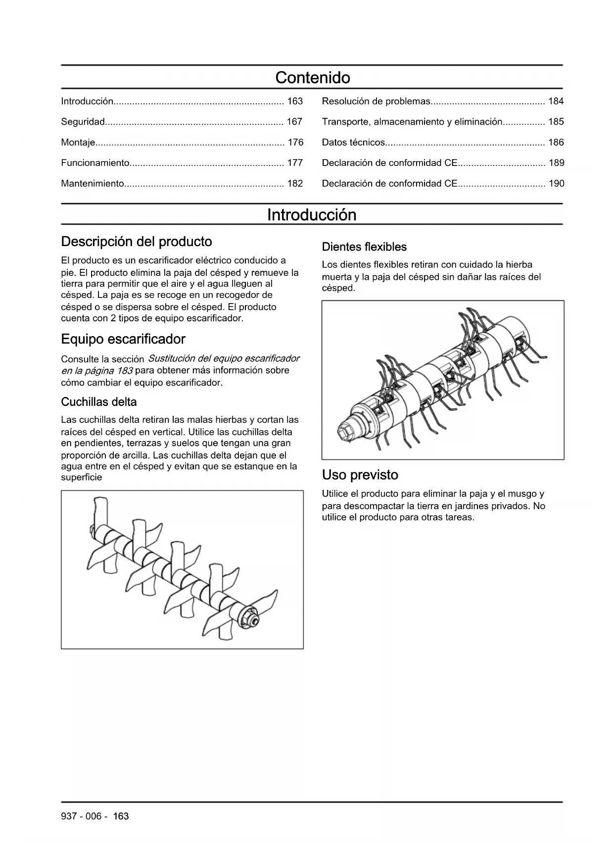 - Declaración de conformidad CE Introducción Descripción del producto El producto es un escarificador eléctrico conducido a pie. El producto elimina la paja del césped y remueve la tierra para permitir que el aire y el agua lleguen al césped. La paja es se recoge en un recogedor de césped o se dispersa sobre el césped. El producto cuenta con 2 tipos de equipo escarificador. Equipo escarificador Consulte la sección Sustitución del equipo escarificador en la página 183 para obtener más información sobre cómo cambiar el equipo escarificador. Cuchillas delta Las cuchillas delta retiran las malas hierbas y cortan las raíces del césped en vertical. Utilice las cuchillas delta en pendientes, terrazas y suelos que tengan una gran proporción de arcilla. Las cuchillas delta dejan que el agua entre en el césped y evitan que se estanque en la superficie Dientes flexibles Los dientes flexibles retiran con cuidado la hierba muerta y la paja del césped sin dañar las raíces del césped. Uso previsto Utilice el producto para eliminar la paja y el musgo y para descompactar la tierra en jardines privados. No utilice el producto para otras tareas. p. 190
