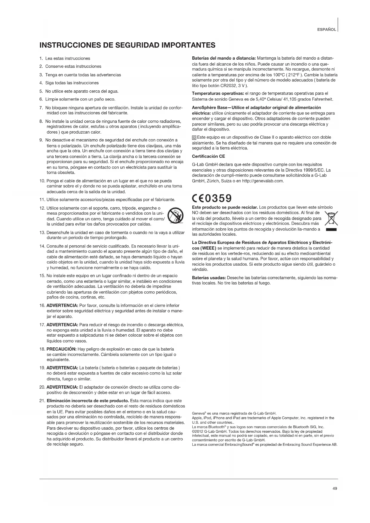 producto no debería ser desechado con el resto de residuos domésticos en la UE. Para evitar posibles daños en el entorno o en la salud cau- sados por una eliminación no controlada, recíclelo de manera respons- able para promover la reutilización sostenible de los recursos materiales. Para devolver su dispositivo usado, por favor, utilice los centros de recogida o devolución o póngase en contacto con el distribuidor donde ha adquirido el producto. Su distribuidor llevará el producto a un centro de reciclaje seguro. Baterías del mando a distancia: Mantenga la batería del mando a distan- cia fuera del alcance de los niños. Puede causar un incendio o una que- madura química si se manipula incorrectamente. No recargue, desmonte ni caliente a temperaturas por encima de los 100ºC ( 212ºF ). Cambie la batería solamente por otra del tipo y del número de modelo adecuados ( batería de litio tipo botón CR2032, 3 V ). Temperaturas operativas: el rango de temperaturas operativas para el Sistema de sonido Geneva es de 5,40ª Celsius/ 41,105 grados Fahrenheit. AeroSphère Base—Utilice el adaptador original de alimentación eléctrica: utilice únicamente el adaptador de corriente que se entrega para encender y cargar el dispositivo. Otros adaptadores de corriente pueden parecer similares, pero su uso podría provocar una descarga eléctrica y dañar el dispositivo. Este equipo es un dispositivo de Clase II o aparato eléctrico con doble aislamiento. Se ha diseñado de tal manera que no requiere una conexión de seguridad a la tierra eléctrica. Certificación CE G-Lab GmbH declara que este dispositivo cumple con los requisitos esenciales y otras disposiciones relevantes de la Directiva 1999/5/EC. La declaración de cumpli-miento puede consultarse solicitándola a G-Lab GmbH, Zúrich, Suiza o en http://genevalab.com. Este producto se puede reciclar. Los productos que lleven este símbolo NO deben ser desechados con los residuos domésticos. Al final de la vida del producto, llévelo a un centro de recogida designado para el reciclaje de dispositivos eléctricos y electrónicos. Descubra más información sobre los puntos de recogida y devolución lla-mando a las autoridades locales. La Directiva Europea de Residuos de Aparatos Eléctricos y Electróni- cos ( WEEE ) se implementó para reducir de manera drástica la cantidad de residuos en los vertede-ros, reduciendo así su efecto medioambiental sobre el planeta y la salud humana. Por favor, actúe con responsabilidad y recicle los productos usados. Si este producto sigue siendo útil, guárdelo o véndalo. Baterías usadas: Deseche las baterías correctamente, siguiendo las norma- tivas locales. No tire las baterías al fuego. Geneva