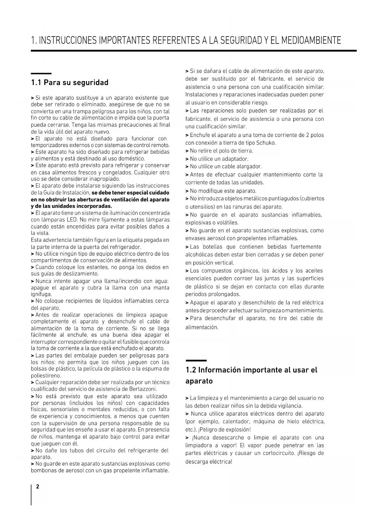 > Si este aparato sustituye a un aparato existente que debe ser retirado o eliminado, asegúrese de que no se convierta en una trampa peligrosa para los niños, con tal fin corte su cable de alimentación e impida que la puerta pueda cerrarse. Tenga las mismas precauciones al final de la vida útil del aparato nuevo. > El aparato no está diseñado para funcionar con temporizadores externos o con sistemas de control remoto. > Este aparato ha sido diseñado para refrigerar bebidas y alimentos y está destinado al uso doméstico. > Este aparato está previsto para refrigerar y conservar en casa alimentos frescos y congelados. Cualquier otro uso se debe considerar inapropiado. > El aparato debe instalarse siguiendo las instrucciones de la Guía de Instalación, se debe tener especial cuidado en no obstruir las aberturas de ventilación del aparato y de las unidades incorporadas. > El aparato tiene un sistema de iluminación concentrada con lámparas LED. No mire fijamente a estas lámparas cuando están encendidas para evitar posibles daños a la vista. Esta advertencia también figura en la etiqueta pegada en la parte interna de la puerta del refrigerador. > No utilice ningún tipo de equipo eléctrico dentro de los compartimentos de conservación de alimentos. > Cuando coloque los estantes, no ponga los dedos en sus guías de deslizamiento. > Nunca intente apagar una llama/incendio con agua: apague el aparato y cubra la llama con una manta ignífuga. > No coloque recipientes de líquidos inflamables cerca del aparato. > Antes de realizar operaciones de limpieza apague completamente el aparato y desenchufe el cable de alimentación de la toma de corriente. Si no se llega fácilmente al enchufe, es una buena idea apagar el interruptor correspondiente o quitar el fusible que controla la toma de corriente a la que está enchufado el aparato. > Las partes del embalaje pueden ser peligrosas para los niños: no permita que los niños jueguen con las bolsas de plástico, la película de plástico o la espuma de poliestireno. > Cualquier reparación debe ser realizada por un técnico cualificado del servicio de asistencia de Bertazzoni. > No está previsto que este aparato sea utilizado por personas (incluidos los niños) con capacidades físicas, sensoriales o mentales reducidas, o con falta de experiencia y conocimientos, a menos que cuenten con la supervisión de una persona responsable de su seguridad que les enseñe a usar el aparato. En presencia de niños, mantenga el aparato bajo control para evitar que jueguen con él. > No dañe los tubos del circuito del refrigerante del aparato. > No guarde en este aparato sustancias explosivas como bombonas de aerosol con un gas propelente inflamable. > Si se dañara el cable de alimentación de este aparato, debe ser sustituido por el fabricante, el servicio de asistencia o una persona con una cualificación similar. Instalaciones y reparaciones inadecuadas pueden poner al usuario en considerable riesgo. > Las reparaciones solo pueden ser realizadas por el fabricante, el servicio de asistencia o una persona con una cualificación similar. > Enchufe el aparato a una toma de corriente de 2 polos con conexión a tierra de tipo Schuko. > No retire el polo de tierra. > No utilice un adaptador. > No utilice un cable alargador. > Antes de efectuar cualquier mantenimiento corte la corriente de todas las unidades. > No modifique este aparato. > No introduzca objetos metálicos puntiagudos (cubiertos o utensilios) en las ranuras del aparato. > No guarde en el aparato sustancias inflamables, explosivas o volátiles. > No guarde en el aparato sustancias explosivas, como envases aerosol con propelentes inflamables. > Las botellas que contienen bebidas fuertemente alcohólicas deben estar bien cerradas y se deben poner en posición vertical. > Los compuestos orgánicos, los ácidos y los aceites esenciales pueden corroer las juntas y las superficies de plástico si se dejan en contacto con ellas durante periodos prolongados. > Apague el aparato y desenchúfelo de la red eléctrica antes de proceder a efectuar su limpieza o mantenimiento. > Para desenchufar el aparato, no tire del cable de alimentación.